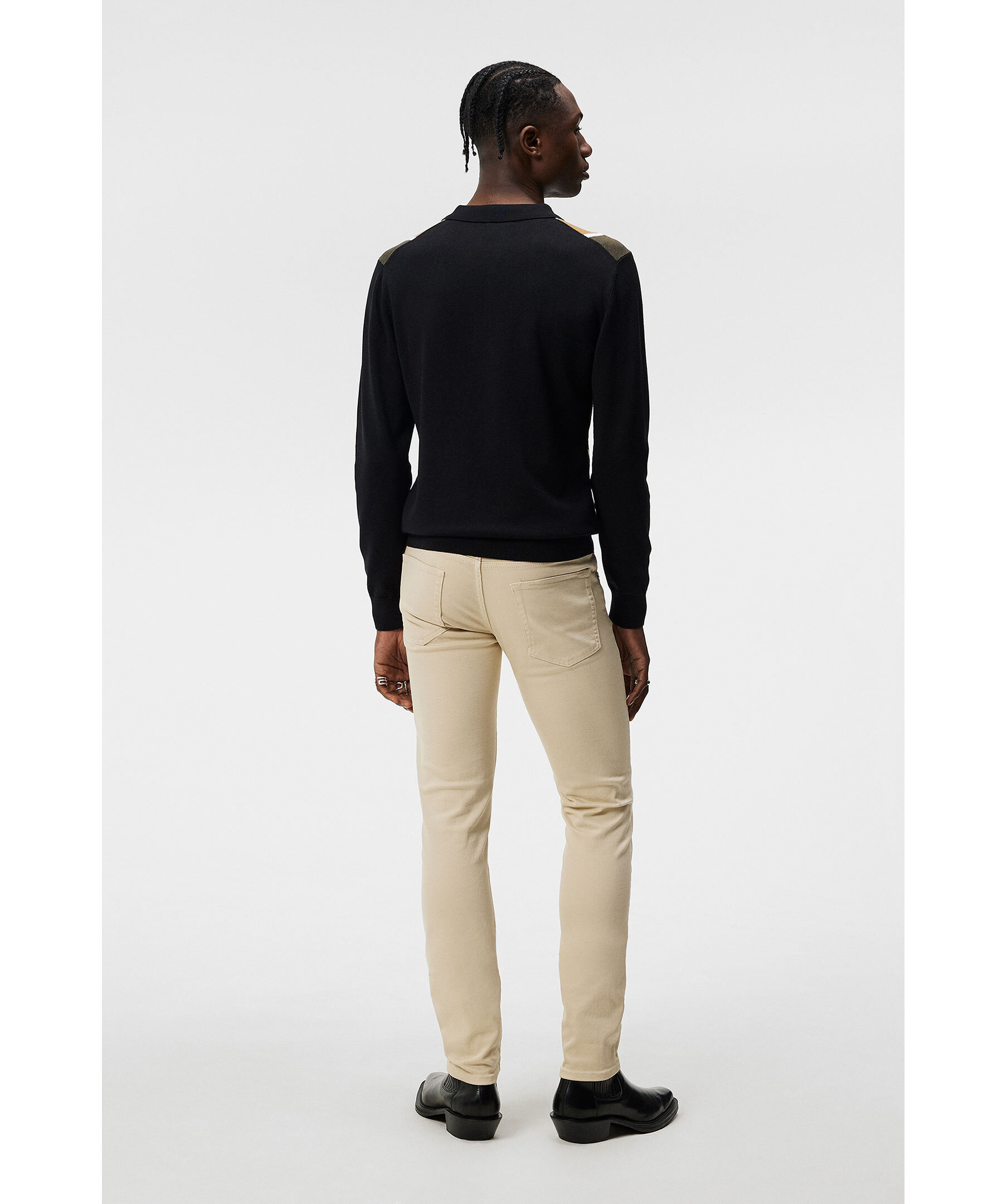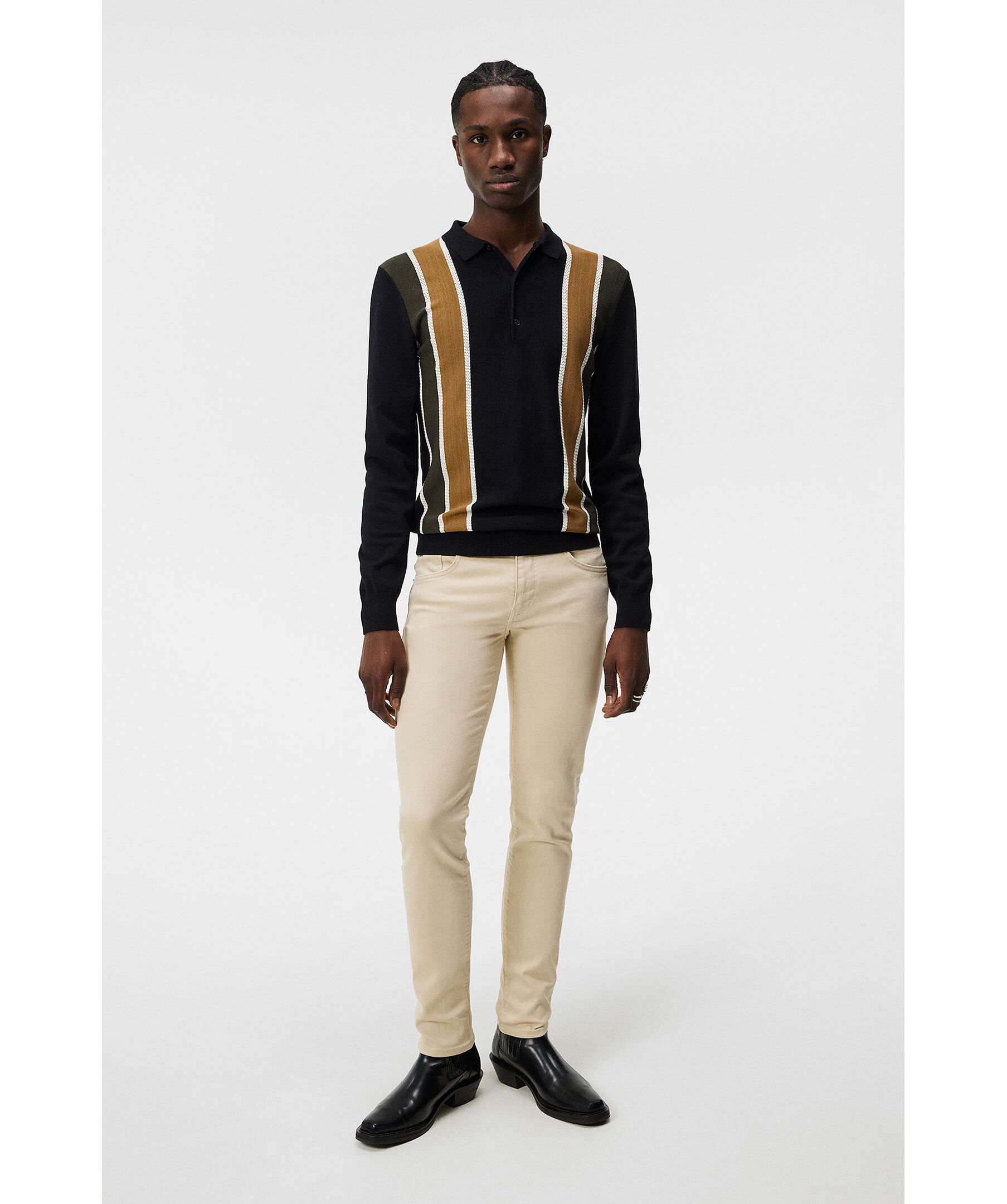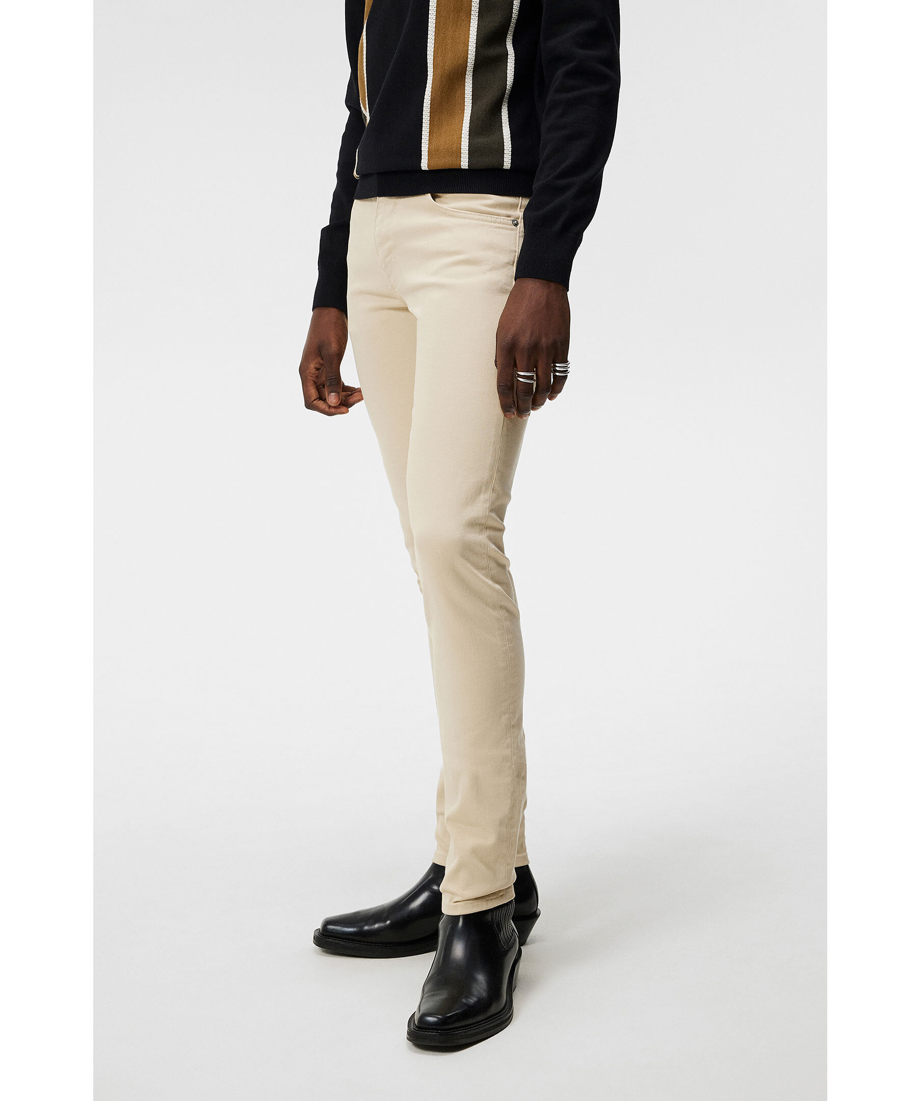Beiega jeans från J Lindeberg. Jeansenhar bälteshällor i midjan, fem fickor och patch med logotyp på linningen. Tillverkade i en bomullsblandning.