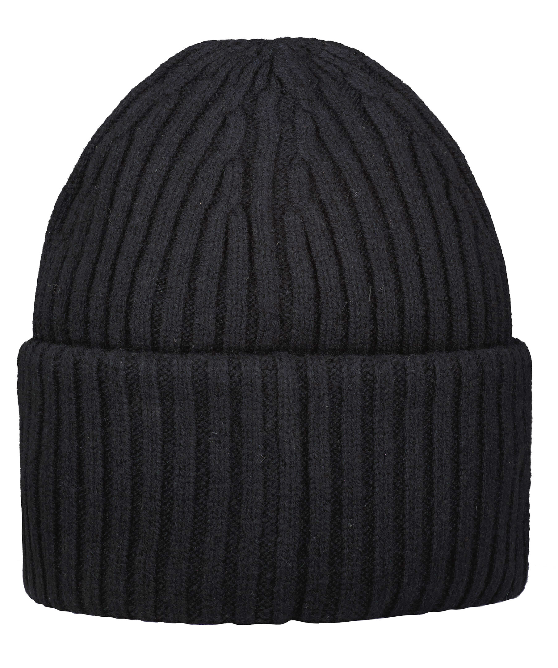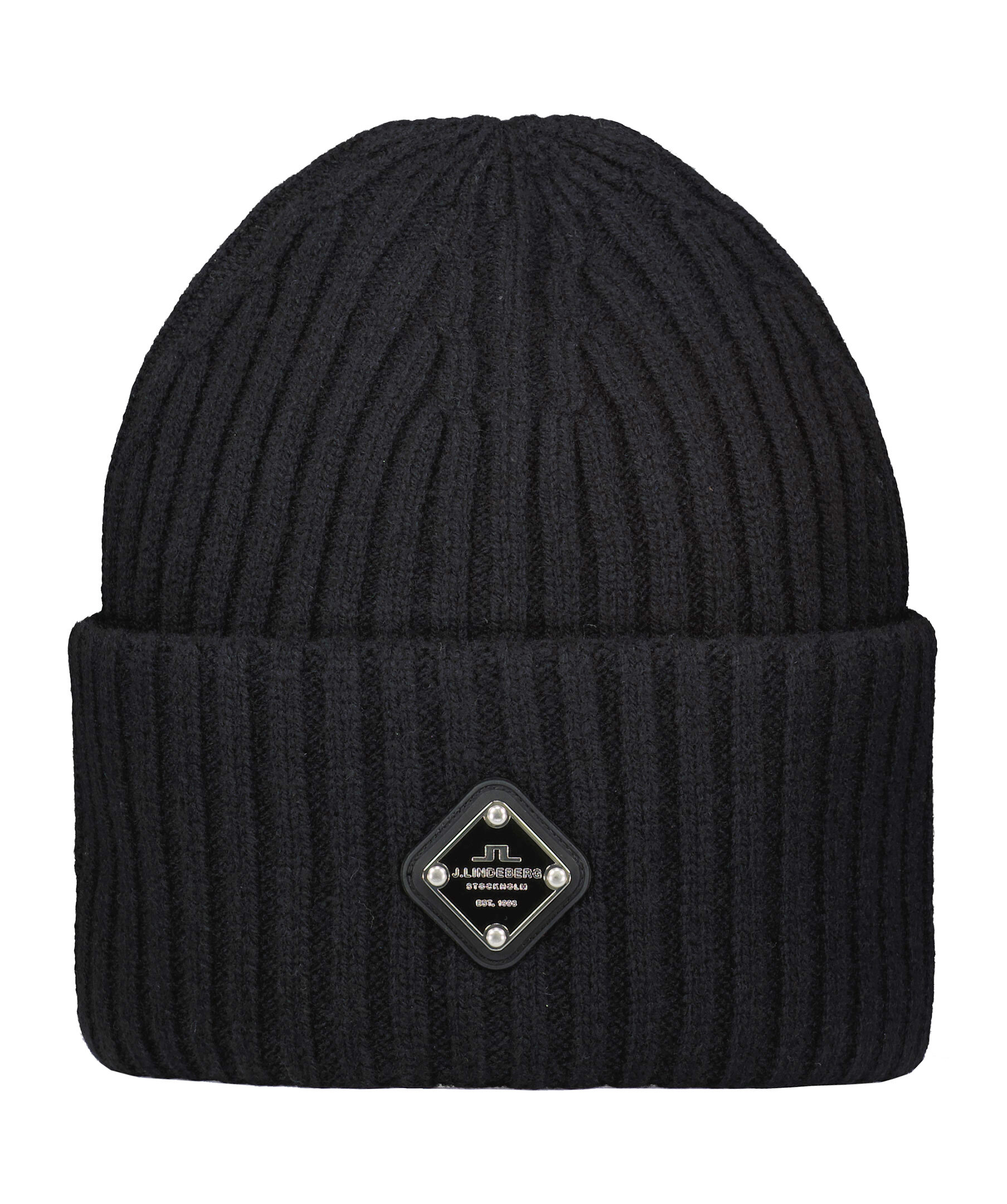 Svart ribbstickad mössa från J. Lindeberg. Tillverkad i 100% ull, har en uppvikt kant och patch med logga i gummi och metall fram.