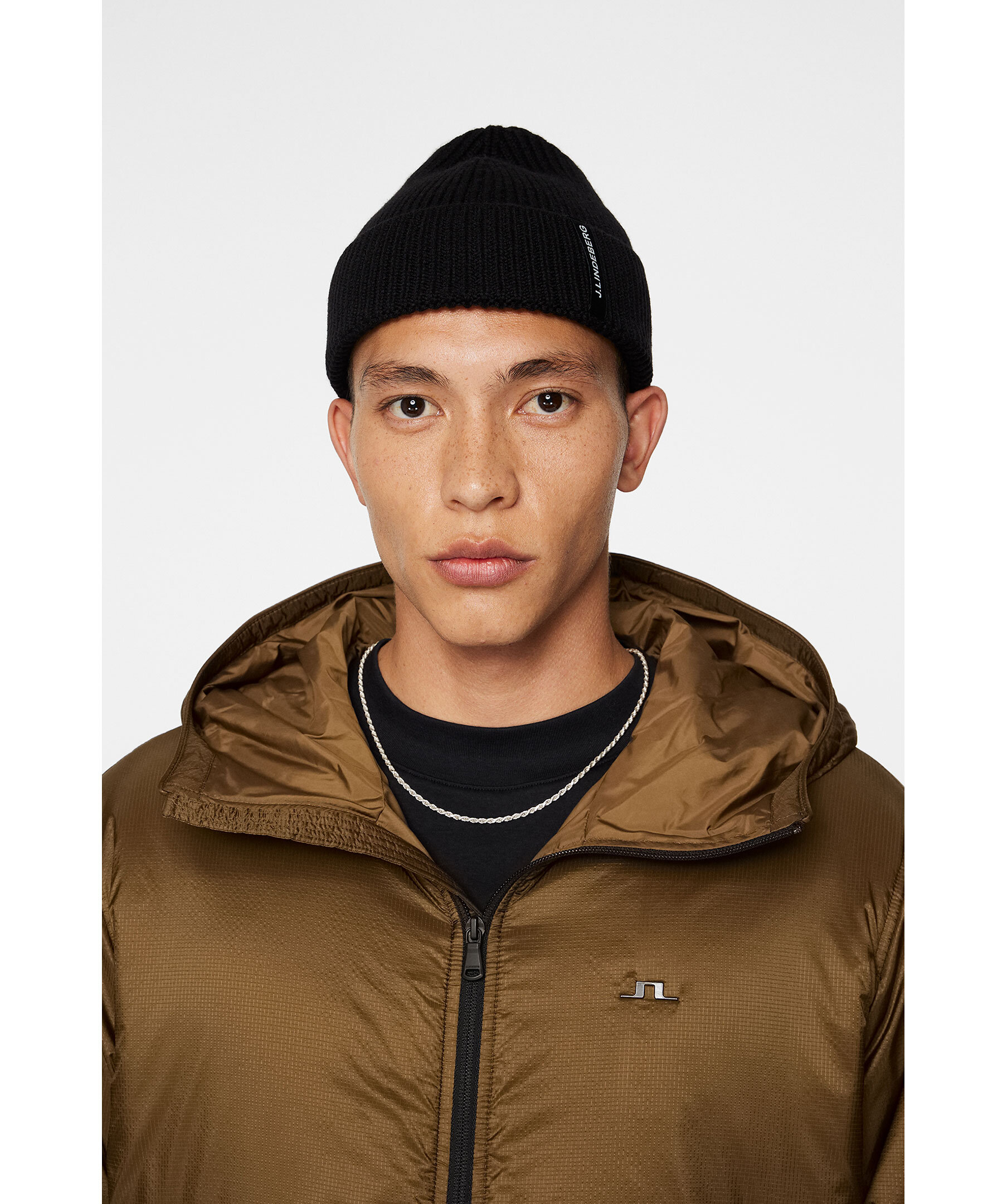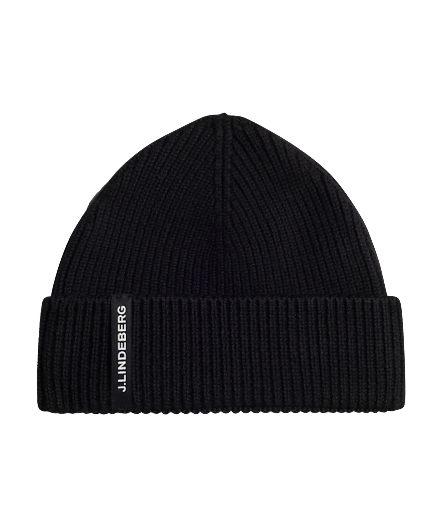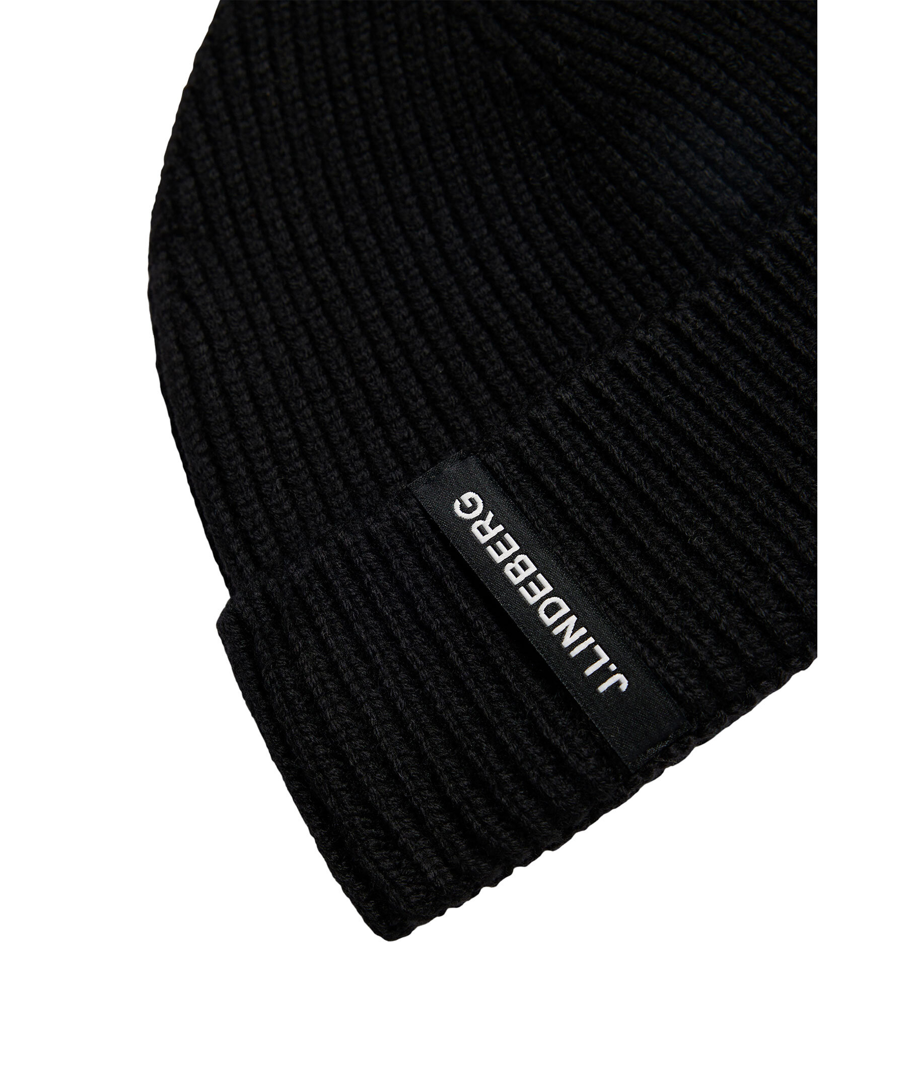 Svart ribbstickad mössa från J.Lindeberg. Mössan är gjord i 100% ull och har en uppvikt kant med logotyp.
