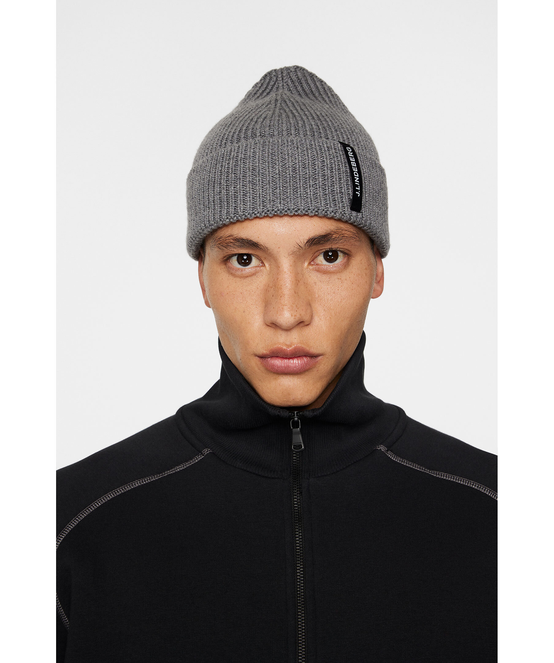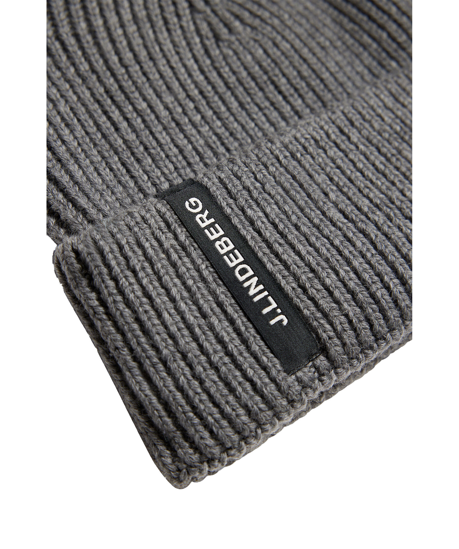 Grå ribbstickad mössa från J.Lindeberg. Mössan är gjord i 100% ull och har en uppvikt kant med logotyp.