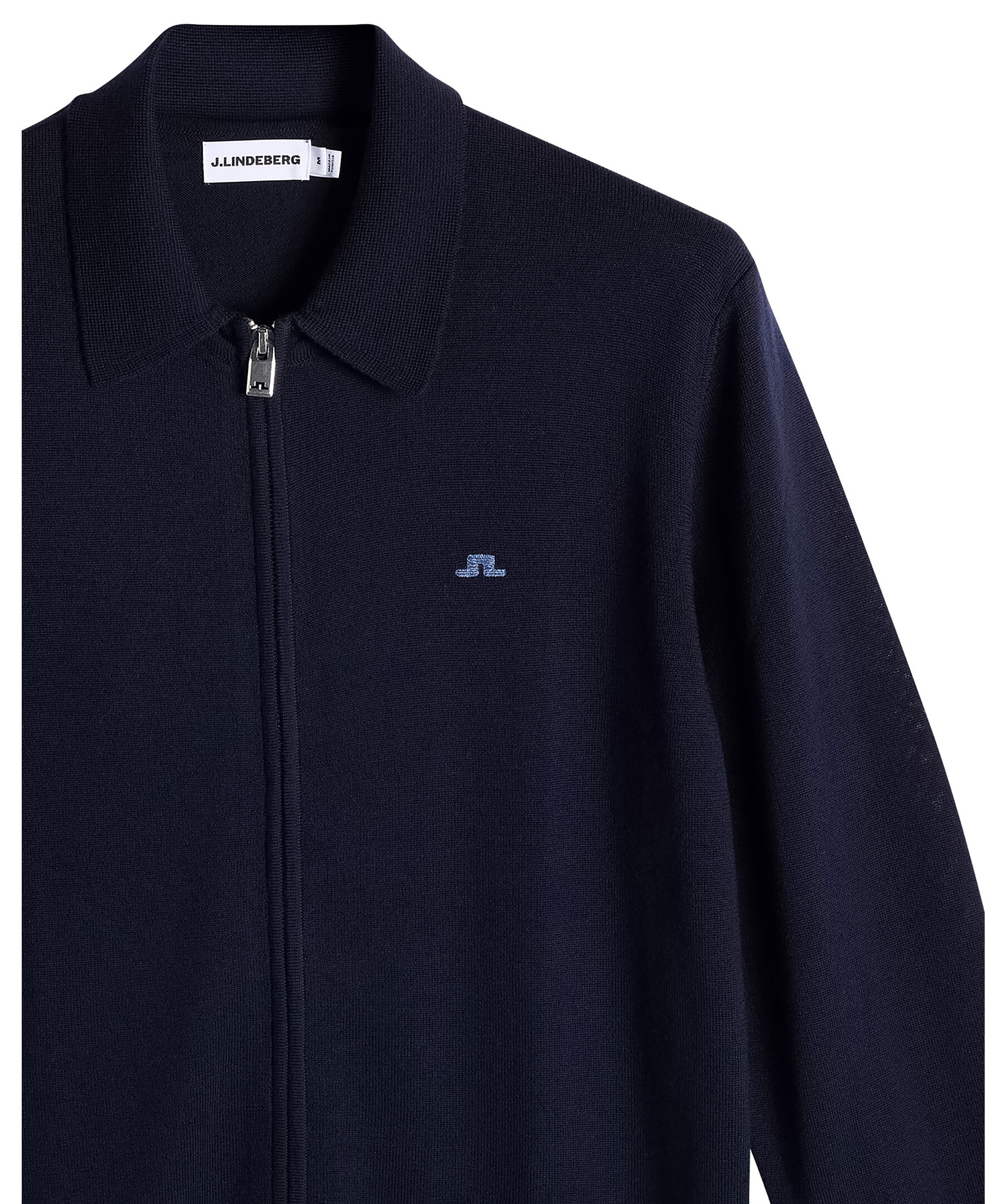 Stickad cardigan i ull från J.Lindeberg. Koftan har en tvåvägsdragkedja och diskret logotyp vid bröstet. Ribbstickade muddar och krage ger den en tidlös design.