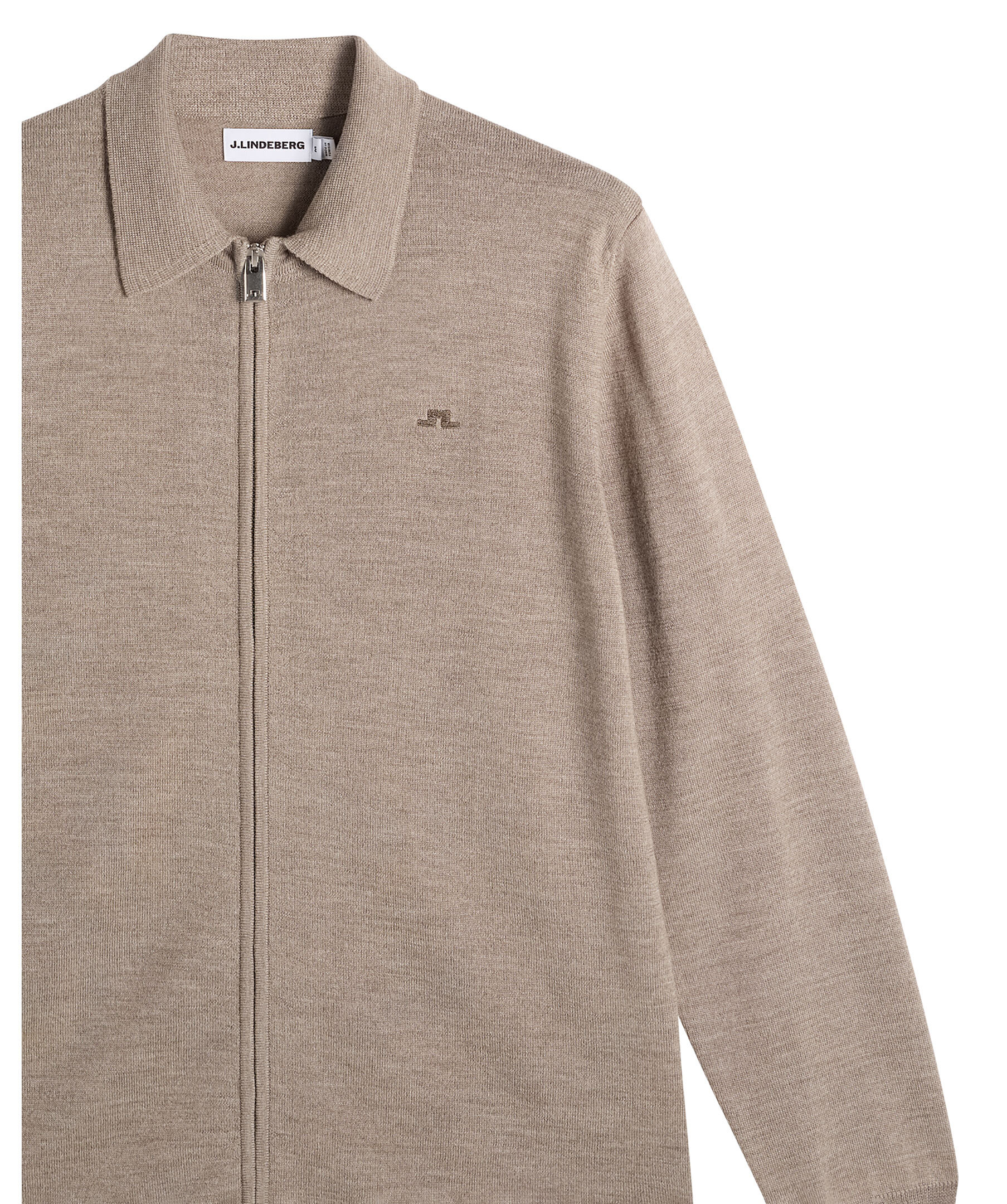 Stickad cardigan i ull från J.Lindeberg. Koftan har en tvåvägsdragkedja och diskret logotyp vid bröstet. Ribbstickade muddar och krage ger den en tidlös design.