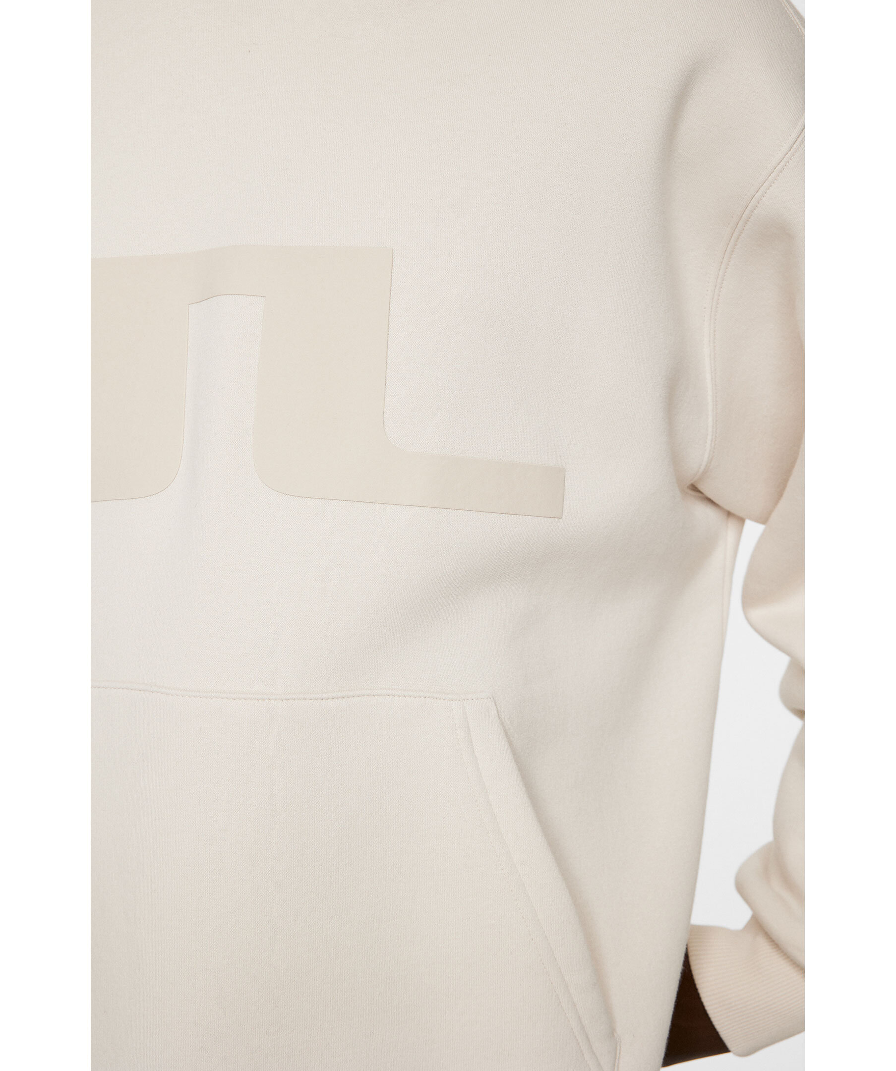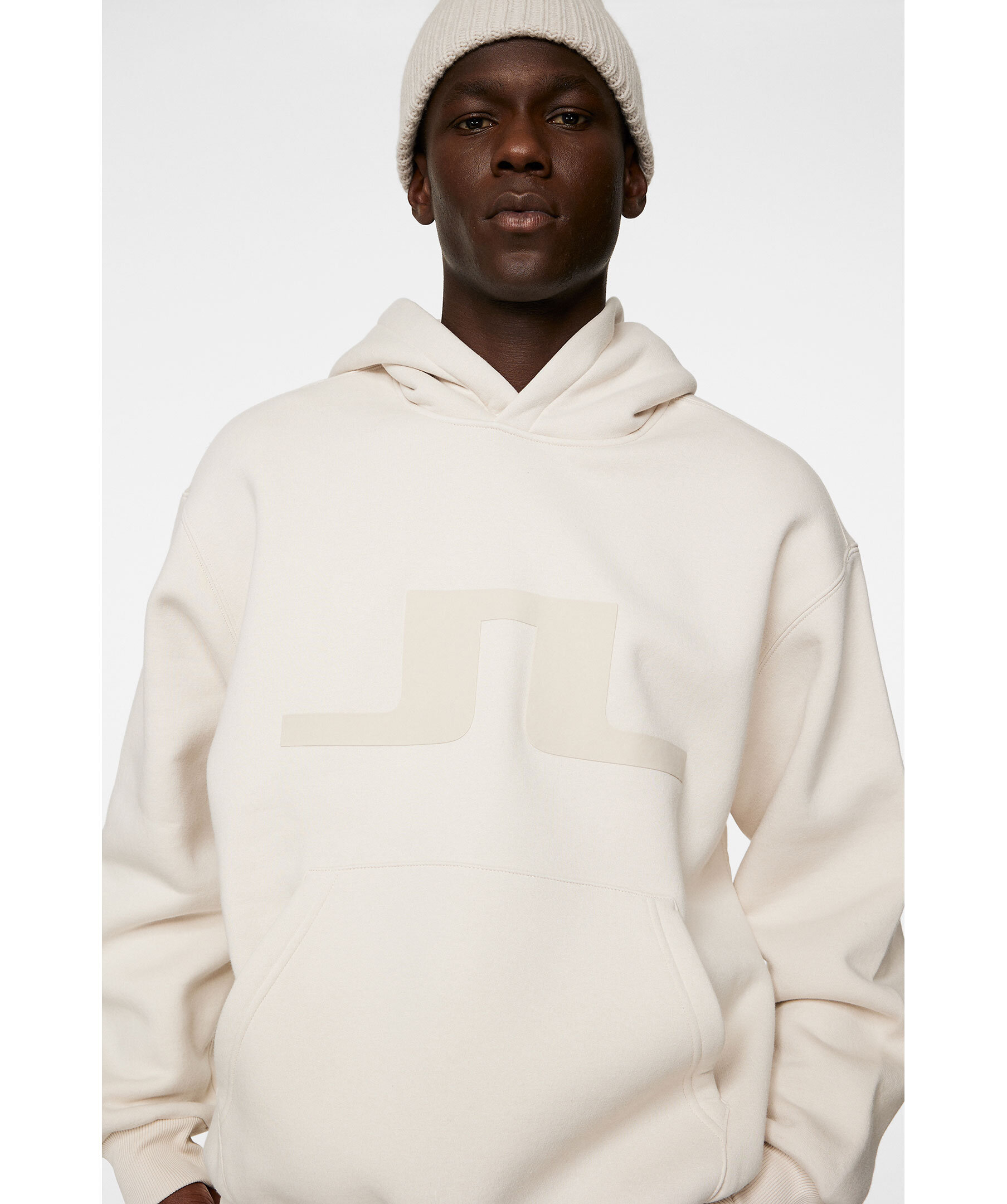 Krämvit hoodie från J.Lindeberg. Tillverkad i en blandning av ekologisk bomull och återvunnen polyesterjersey med säsongsbetonat grafiktryck på bröstet. Den är skuren i en avslappnad passform som inspirerats av vintagetröjor, och på framsidan sitter en rymlig munkficka. Ha den som ett lager under en rock eller jacka.