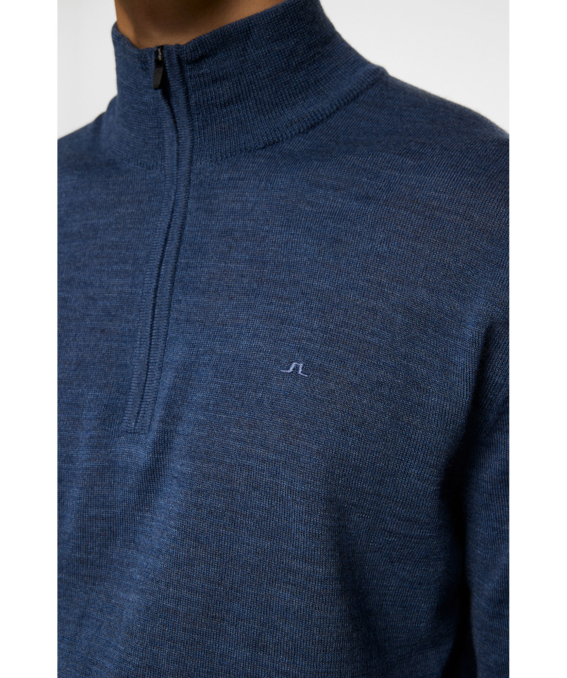 Blå half-zip tröja från J.Lindeberg. Tröjan har en ribbstickad krage och en diskret färg i färg logotyp på vänster bröst. Ribbstickade ärm- och tröjavslut. Tillverkad av 100% merinoull.