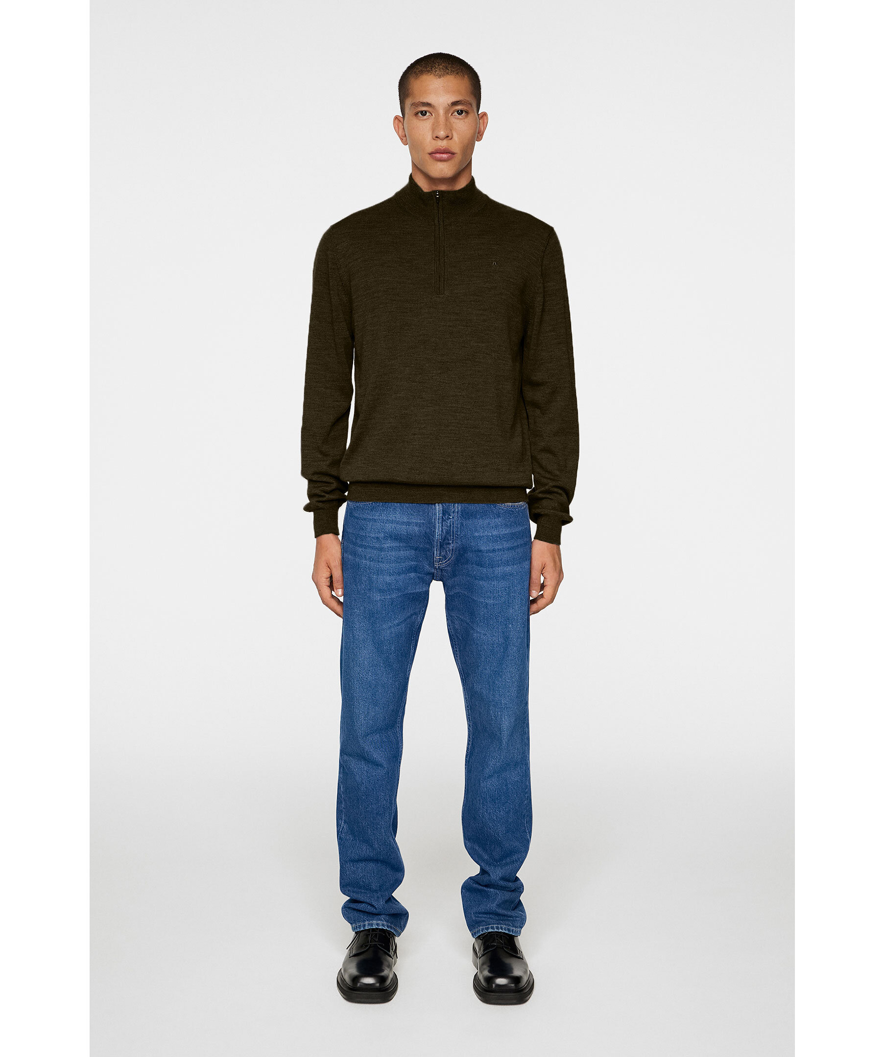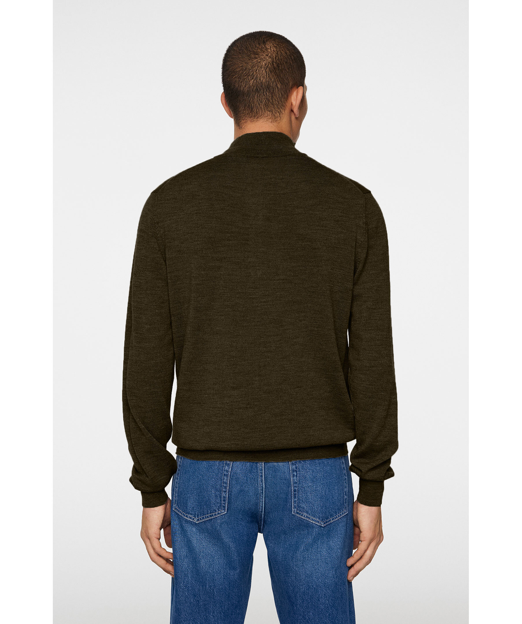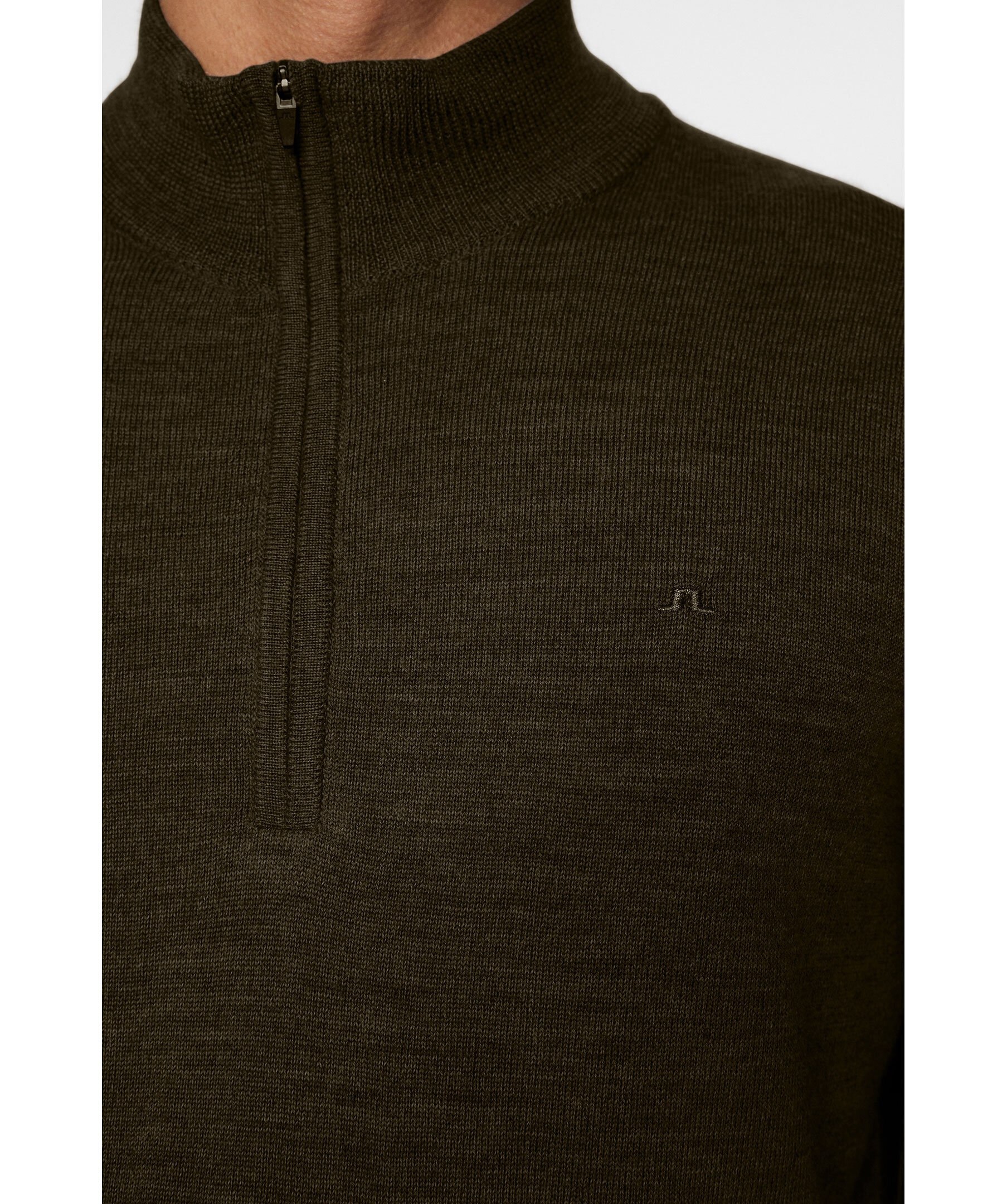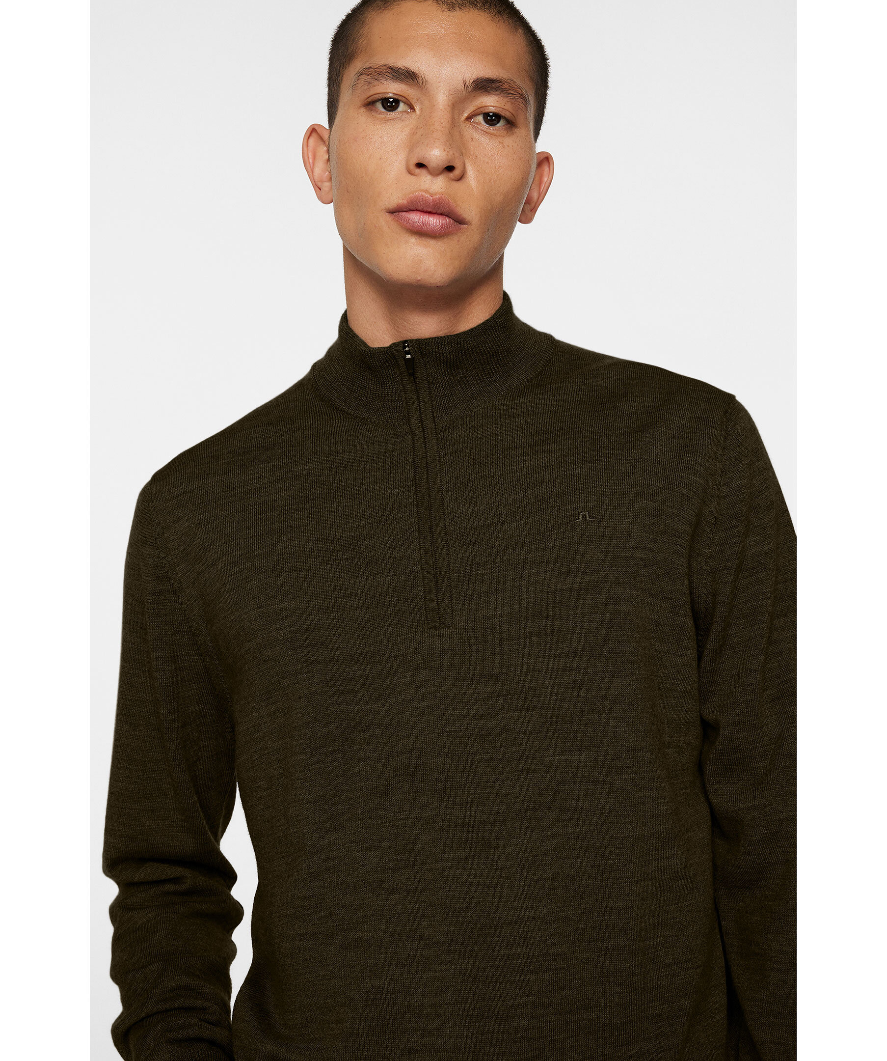 Skogsgrön stickad half-zip från J.Lindeberg. Tillverkad i ett fint, mulesingfritt merinoull som stickats i ett lyxigt 12-garn som är otroligt mukt och varmt. Med de modebetonade detaljerna, en raffinerad passpoaldetalj på dragkedjan och en tonad, broderad Bridge-logotyp på bröstet bidrar plagget med tidlös elegans.