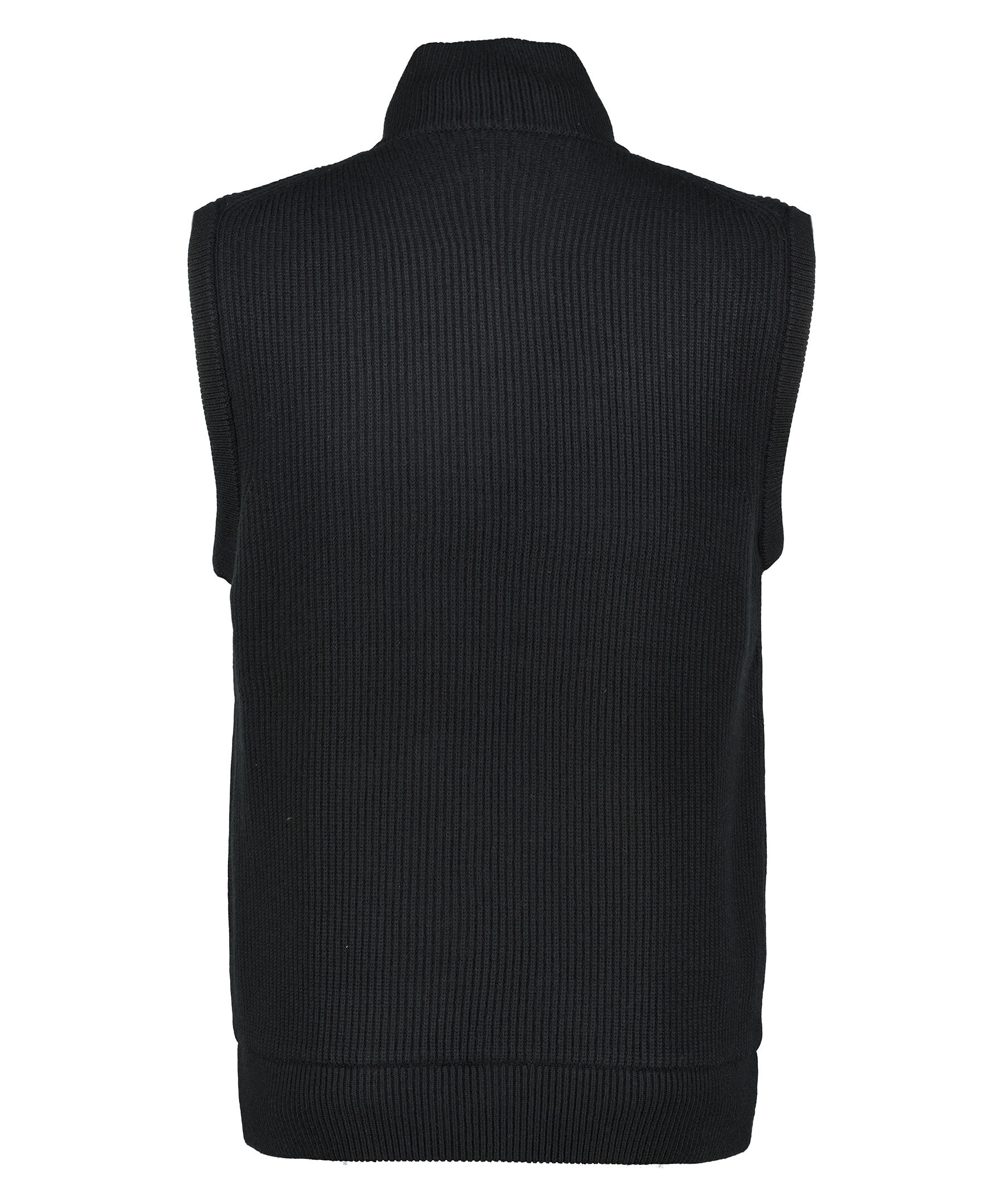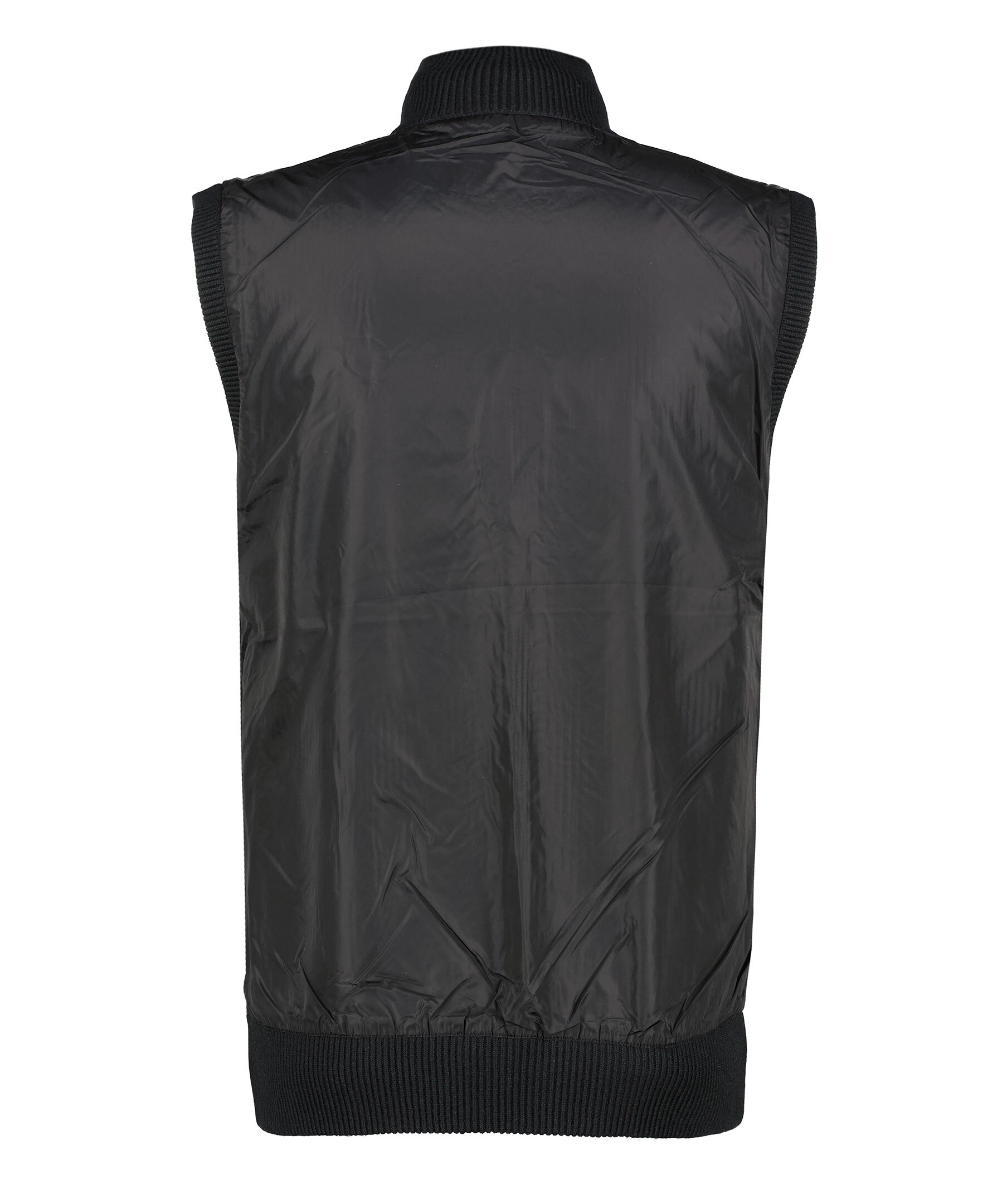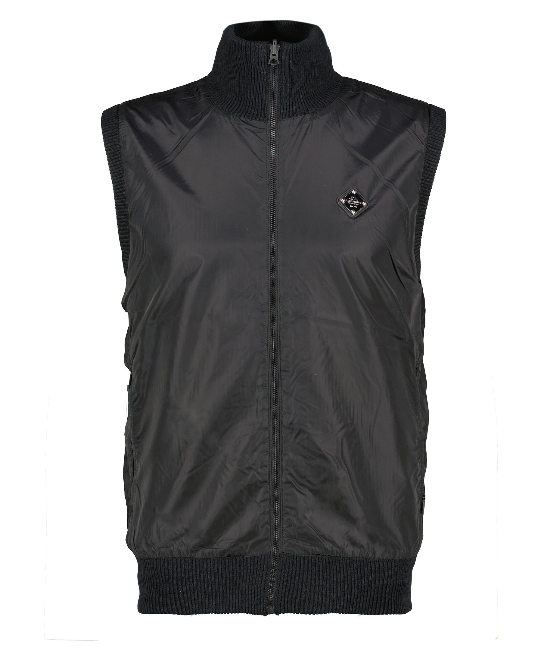Svart väst från J Lindeberg. Vändbar design ena sidan i stickad ylle och den andra i Nylon. Stängs framtill med tvåvägsdragkedja. Ribbstickade muddar i ärm och plaggslut. Sidan i nylon har en logotyp i metall på vänster bröst.