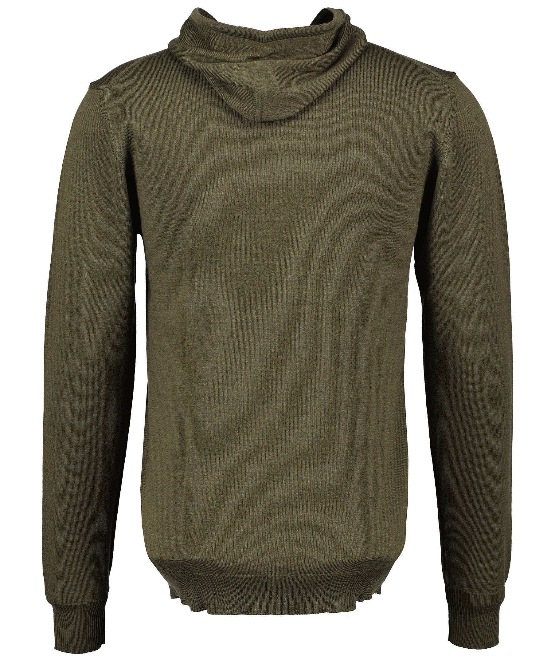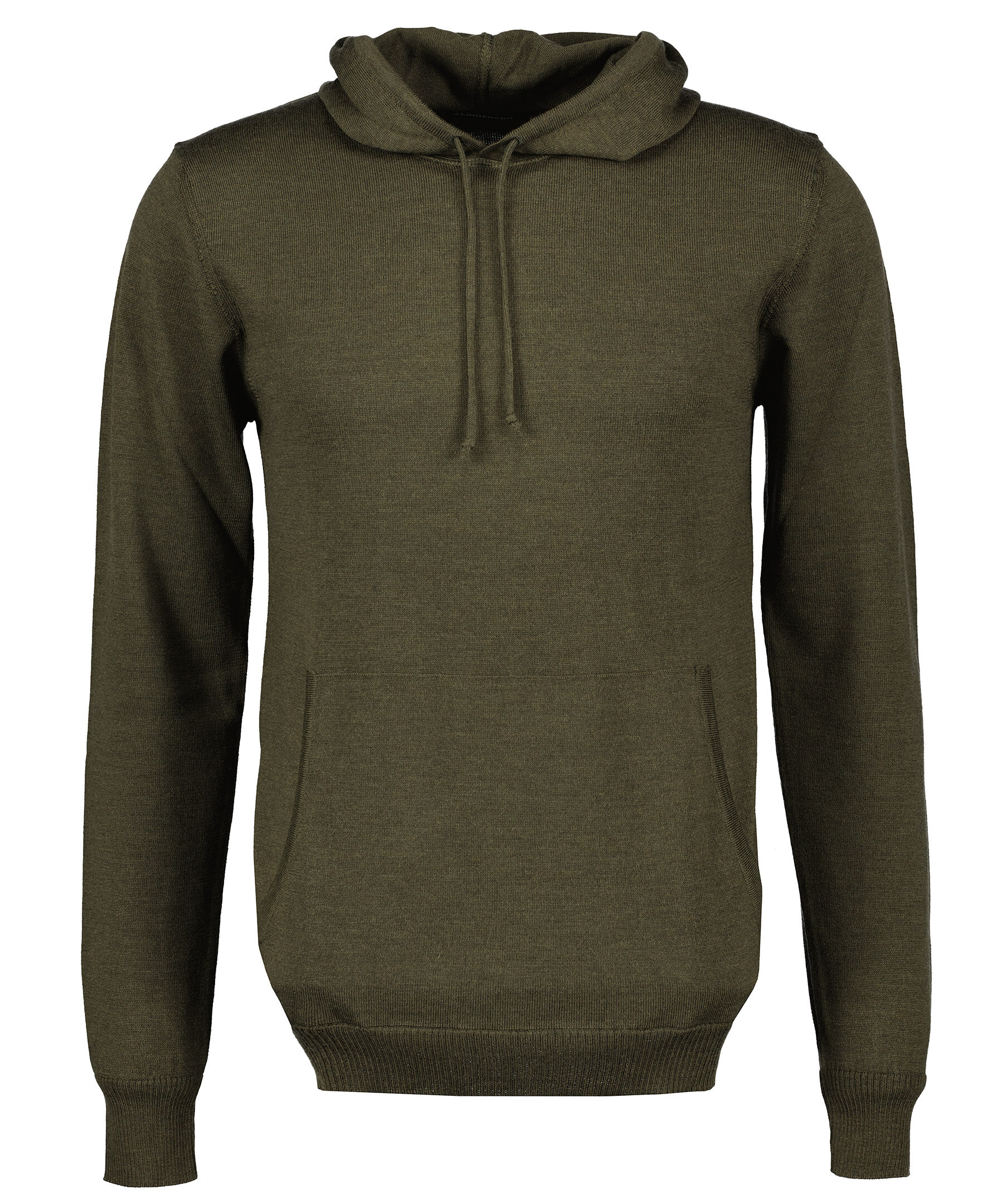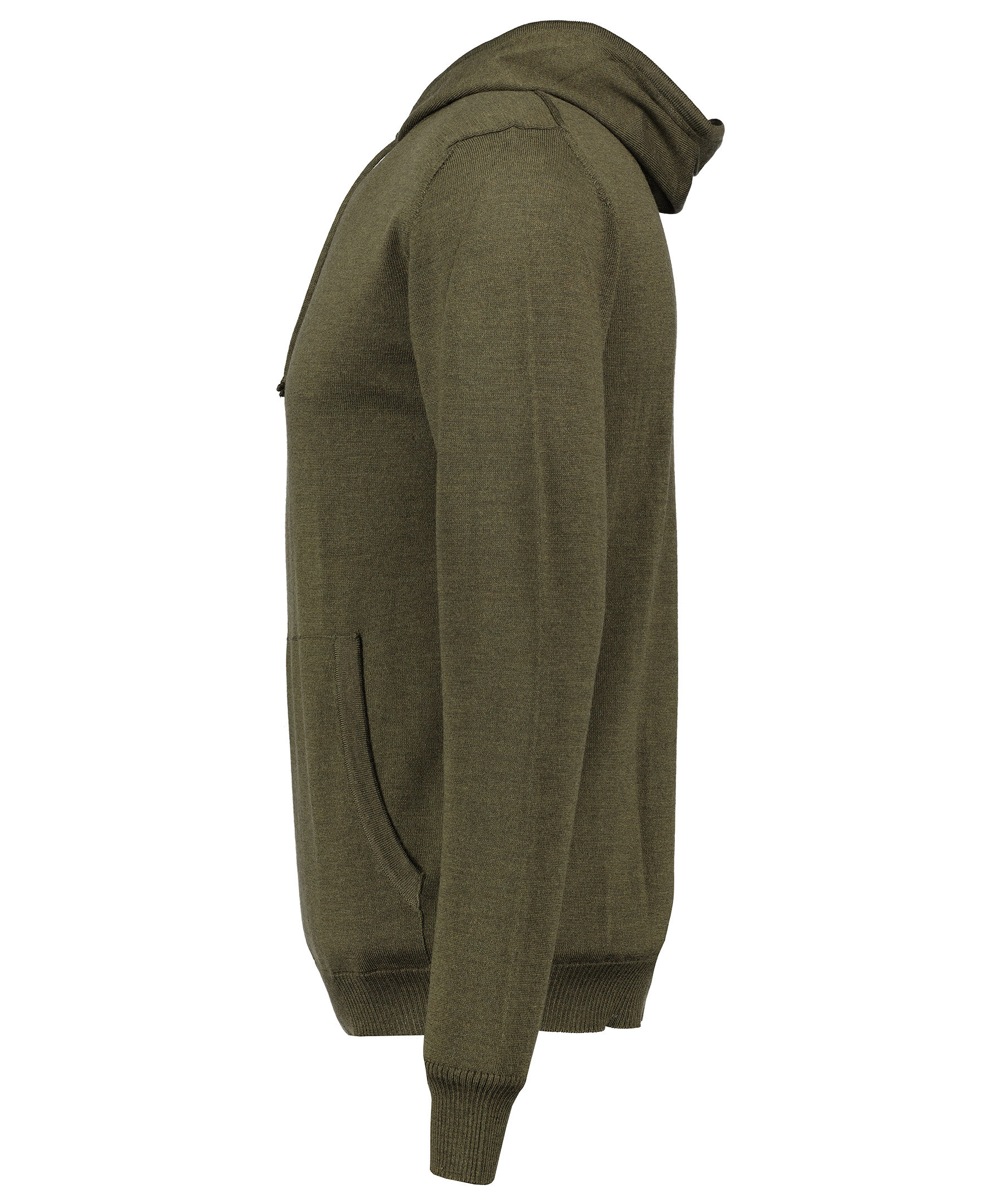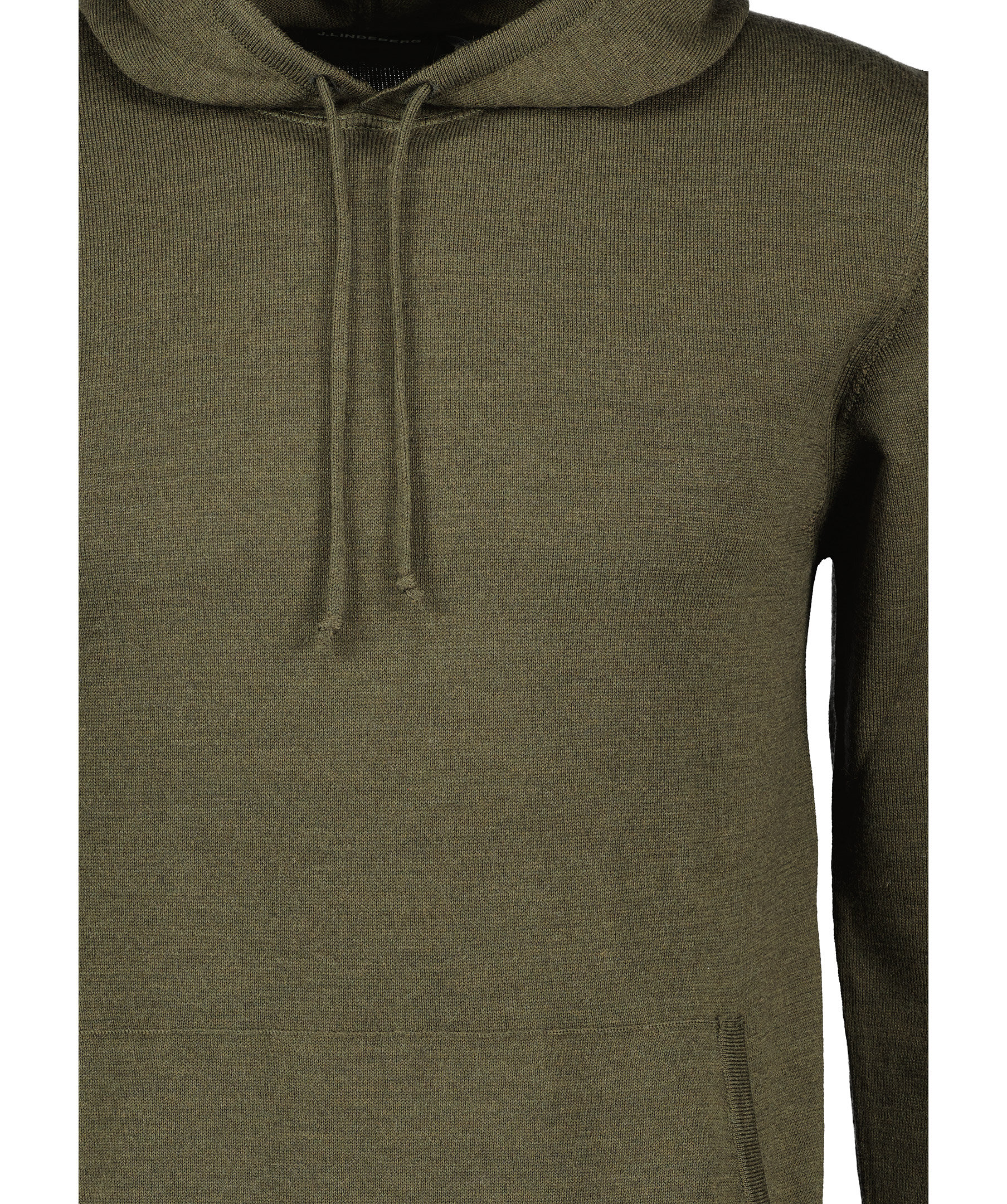 Skogsgrön finstickad hoodie från J Lindeberg. Tillverkad i 100% Merinoull. Luva med dragsko. Ribbstickade muddar i ärm- och plaggslut. Känguru ficka på magen.