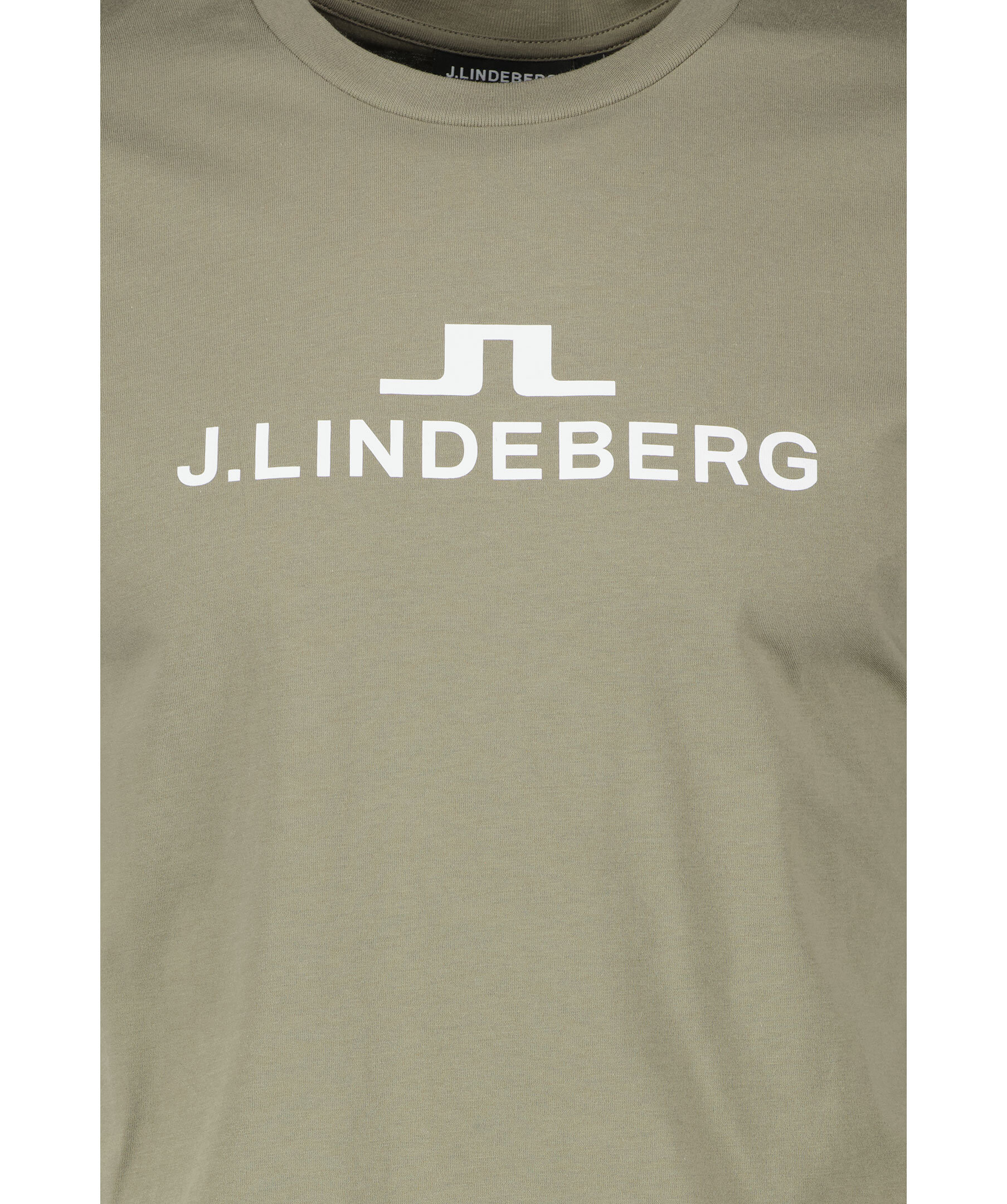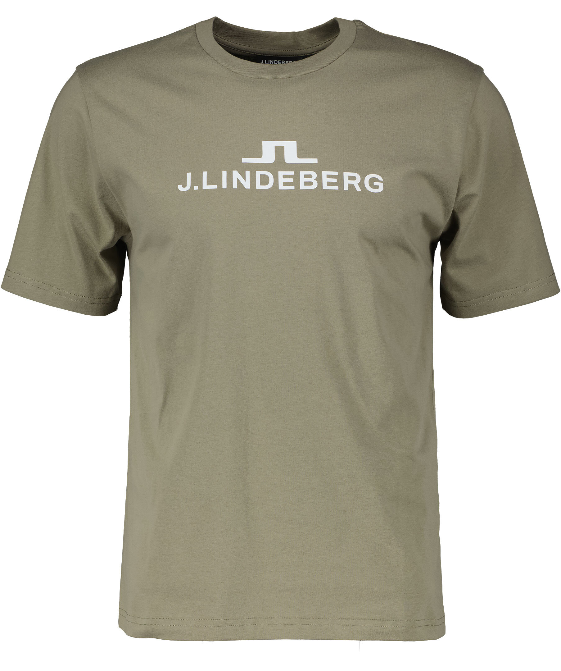 Beigegrön T-shirt från J Lindeberg. Tryckt logotyp över bröstet. Tillverkad i 100% Bomull. Rundad halsringning med ribbstickad mudd.