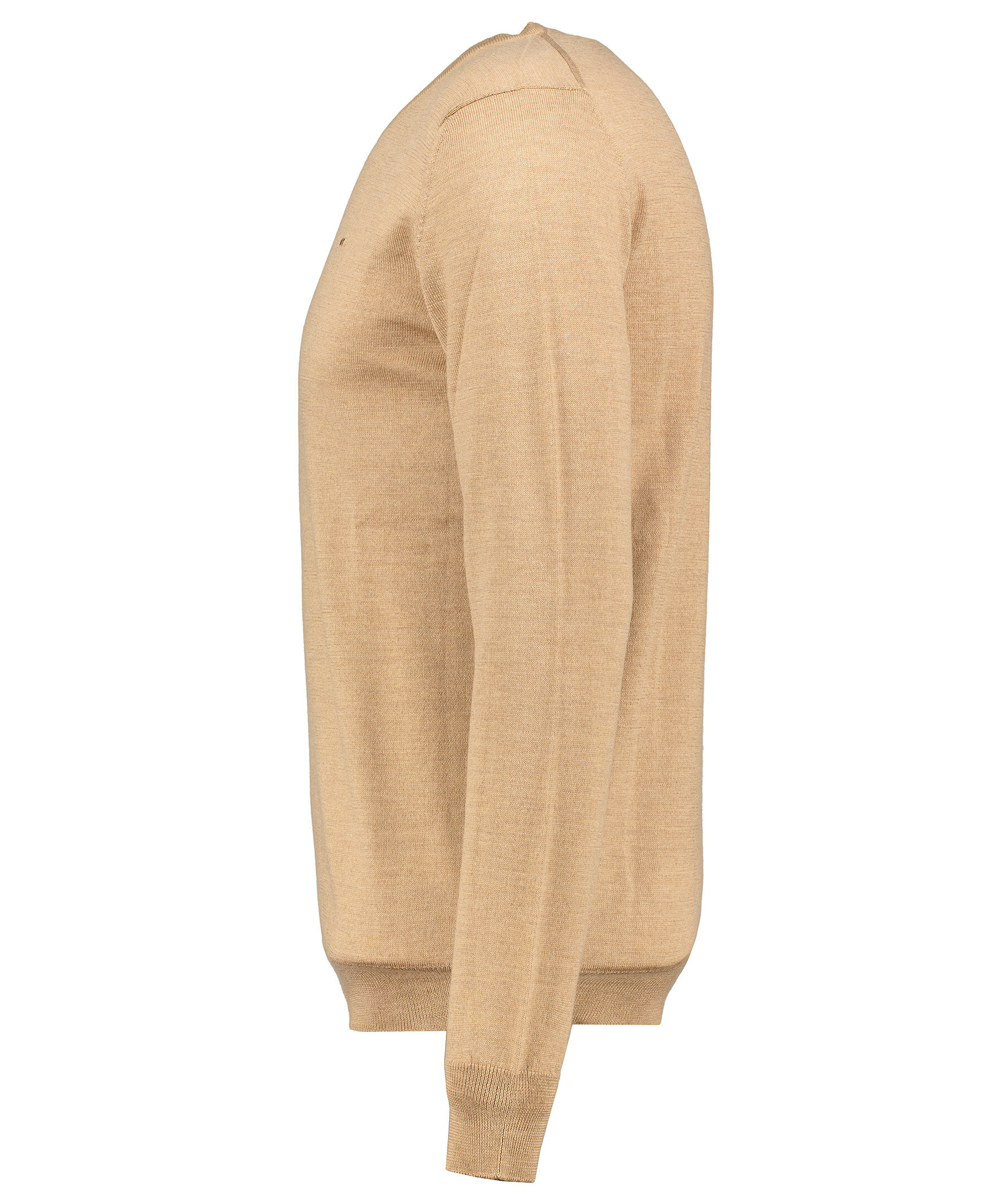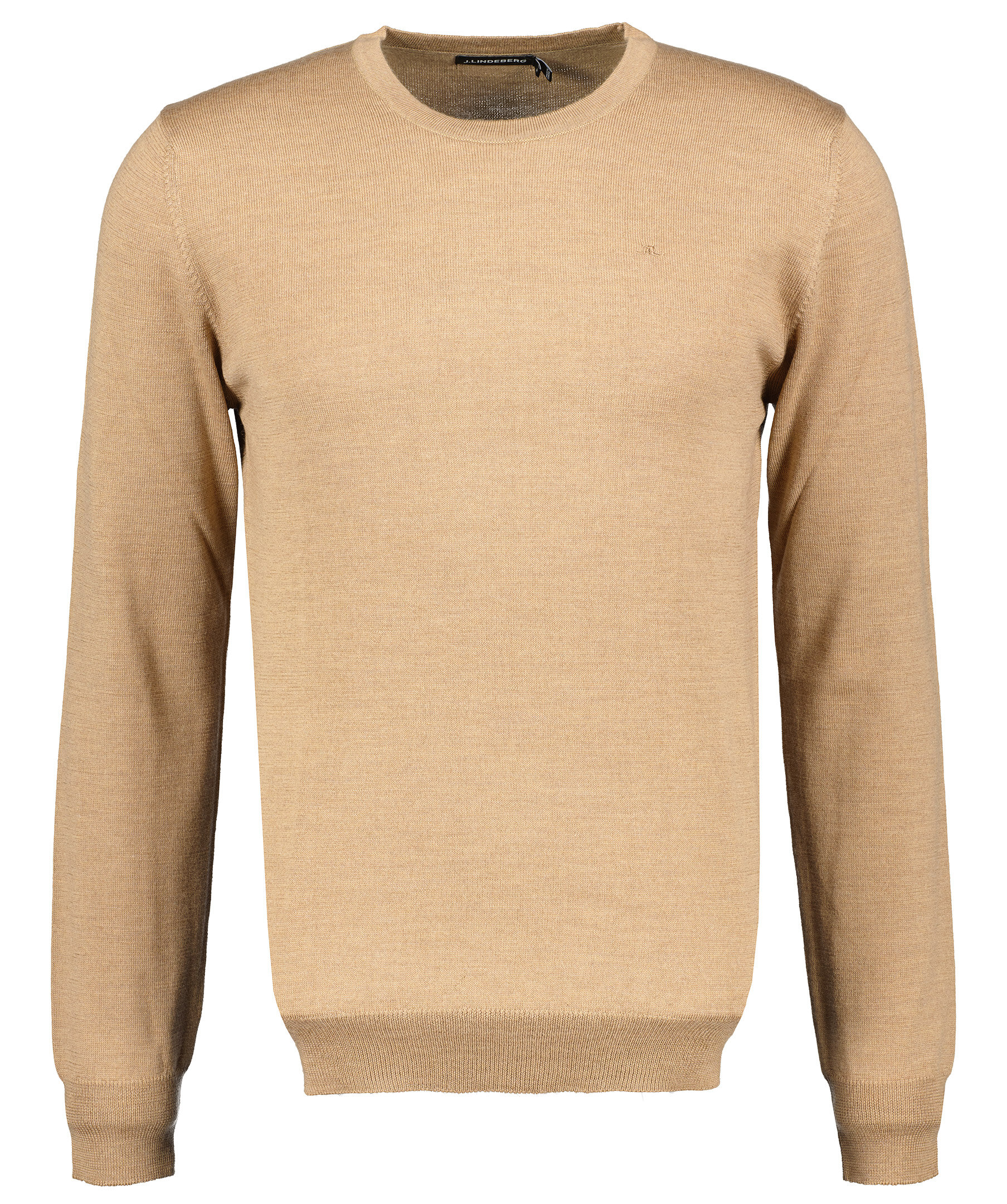 Beige finstickad tröja från J Lindeberg. Tillverkad i 100% merinoull. Rundad halsringning. Ribbstickad halsringning, ärm- och plaggslut. Liten broderad logotyp på vänster bröst.