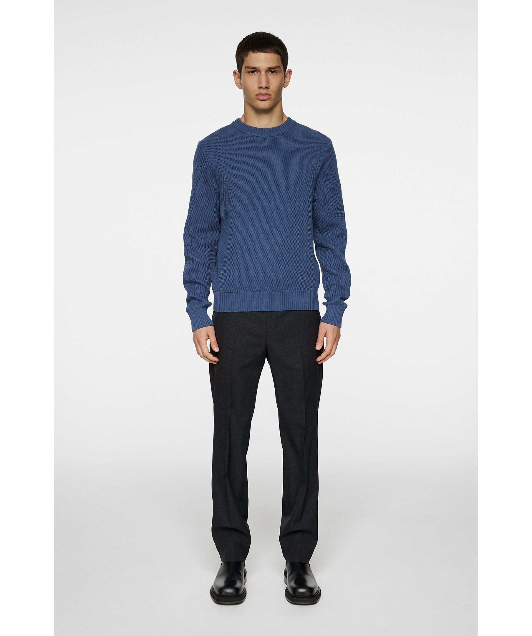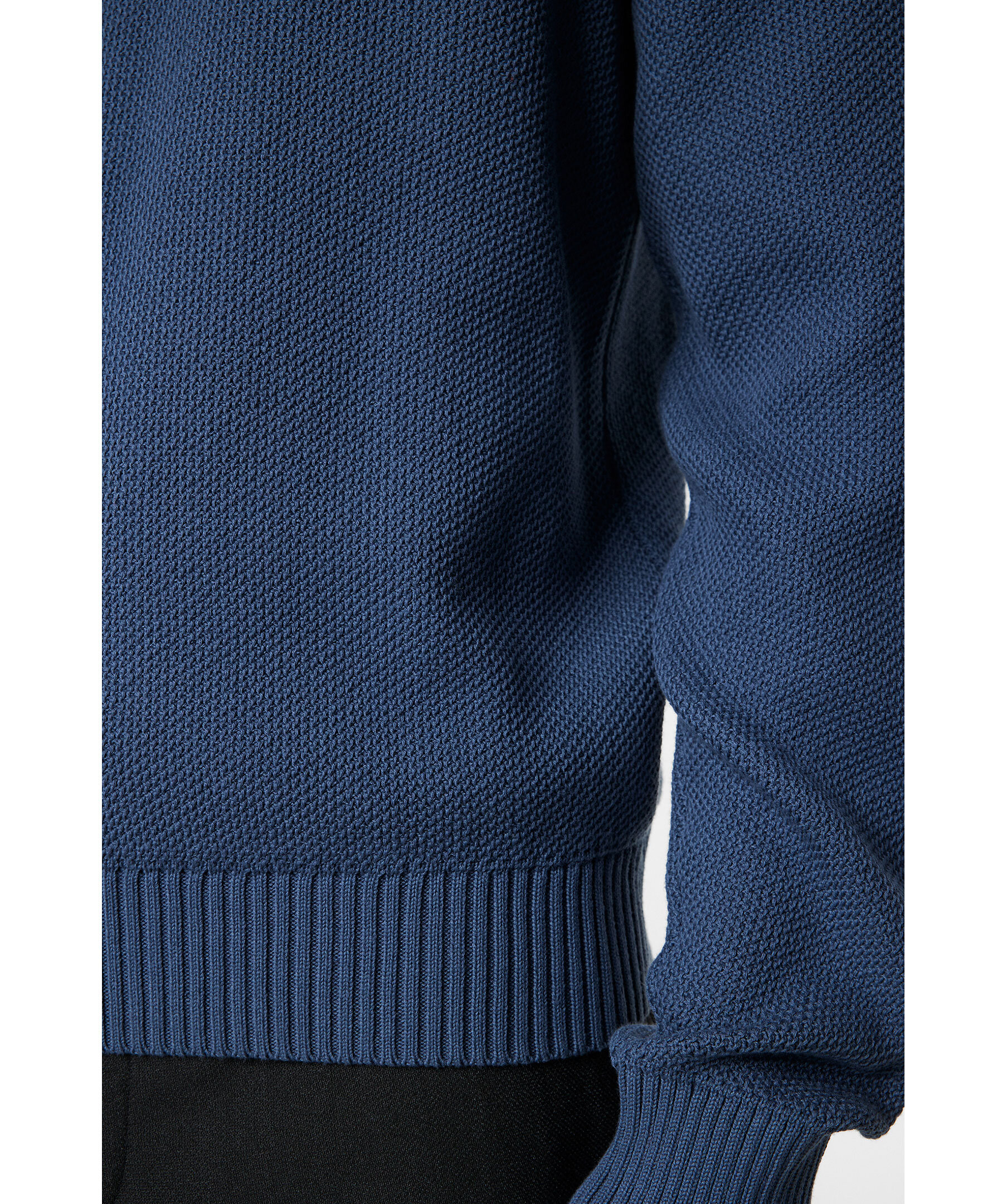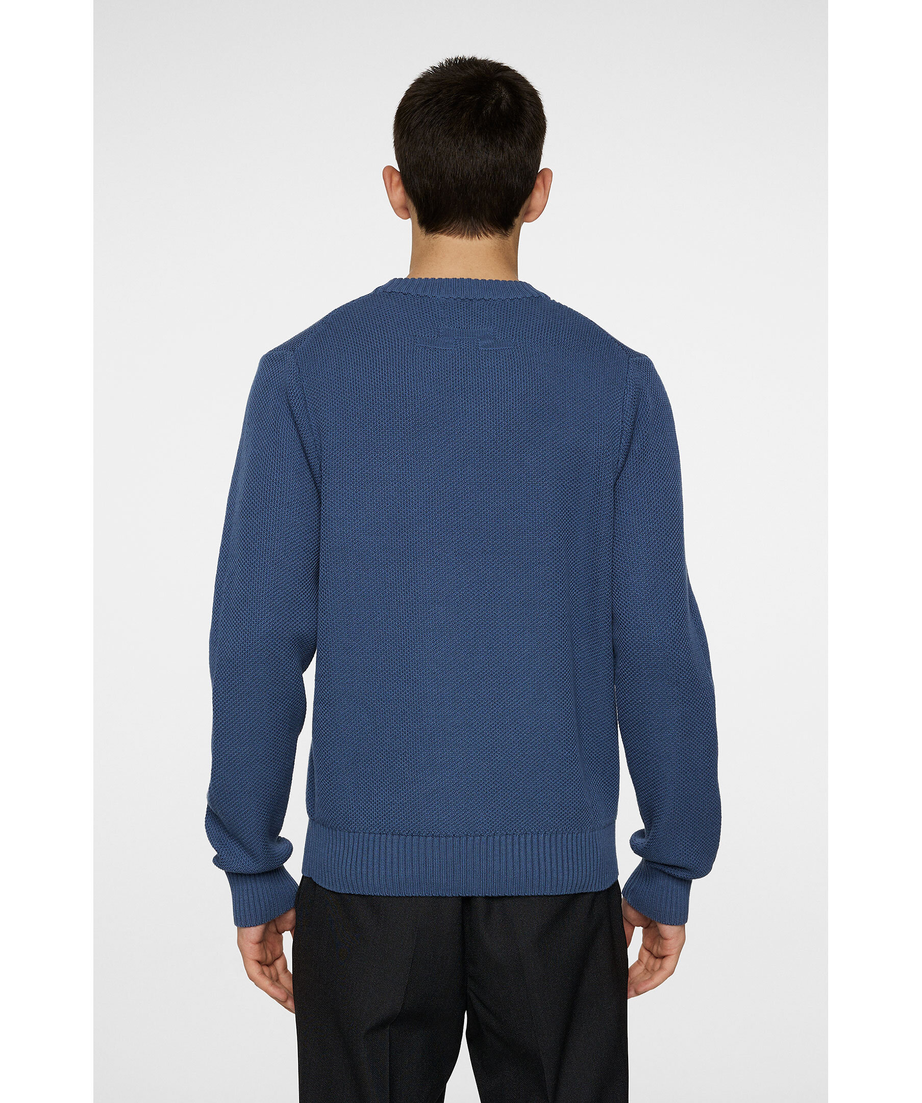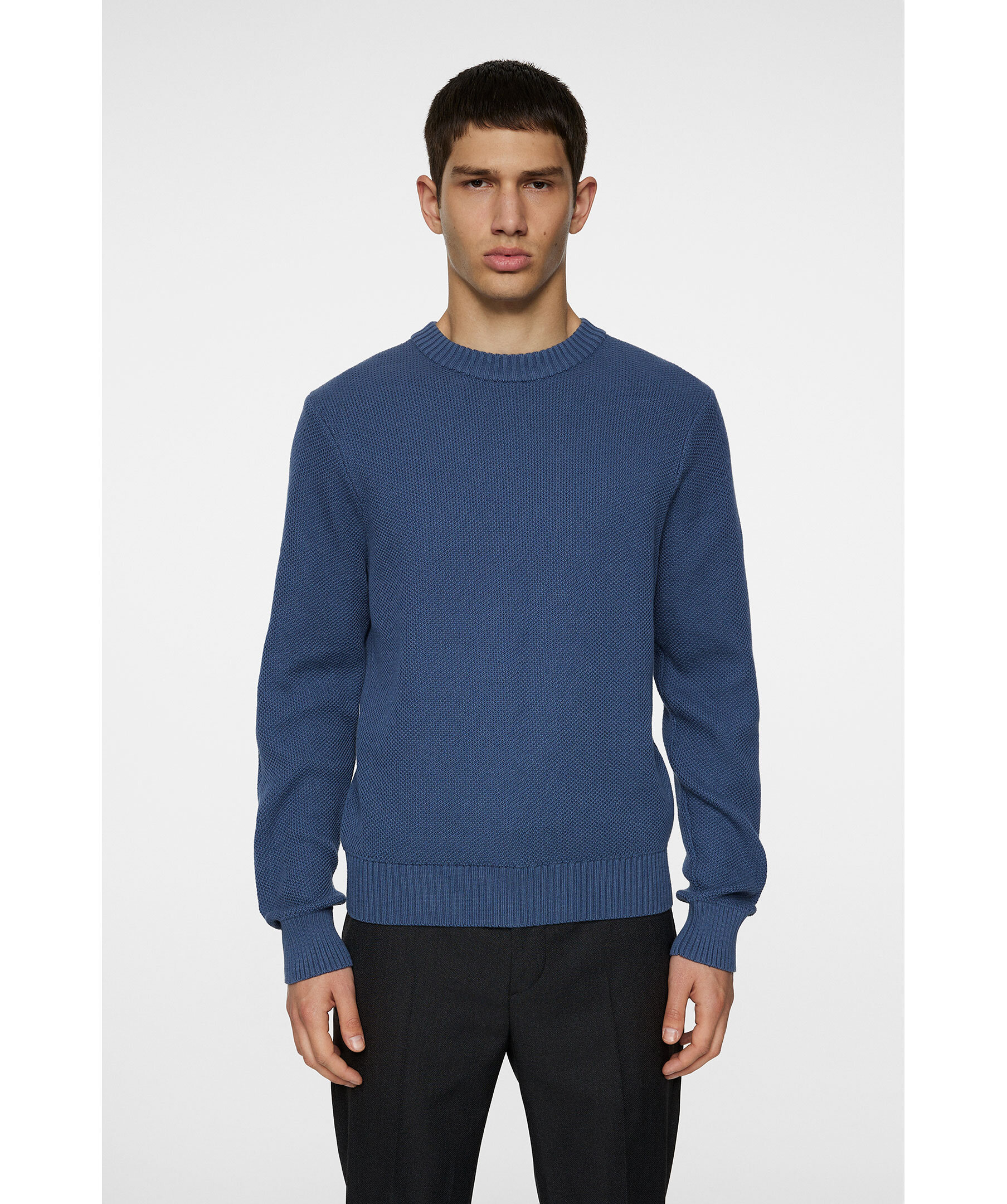 Blå strukturstickad tröja från J.Lindeberg. Tröjan är tillverkad i 100% bomull och har ribbade muddar.