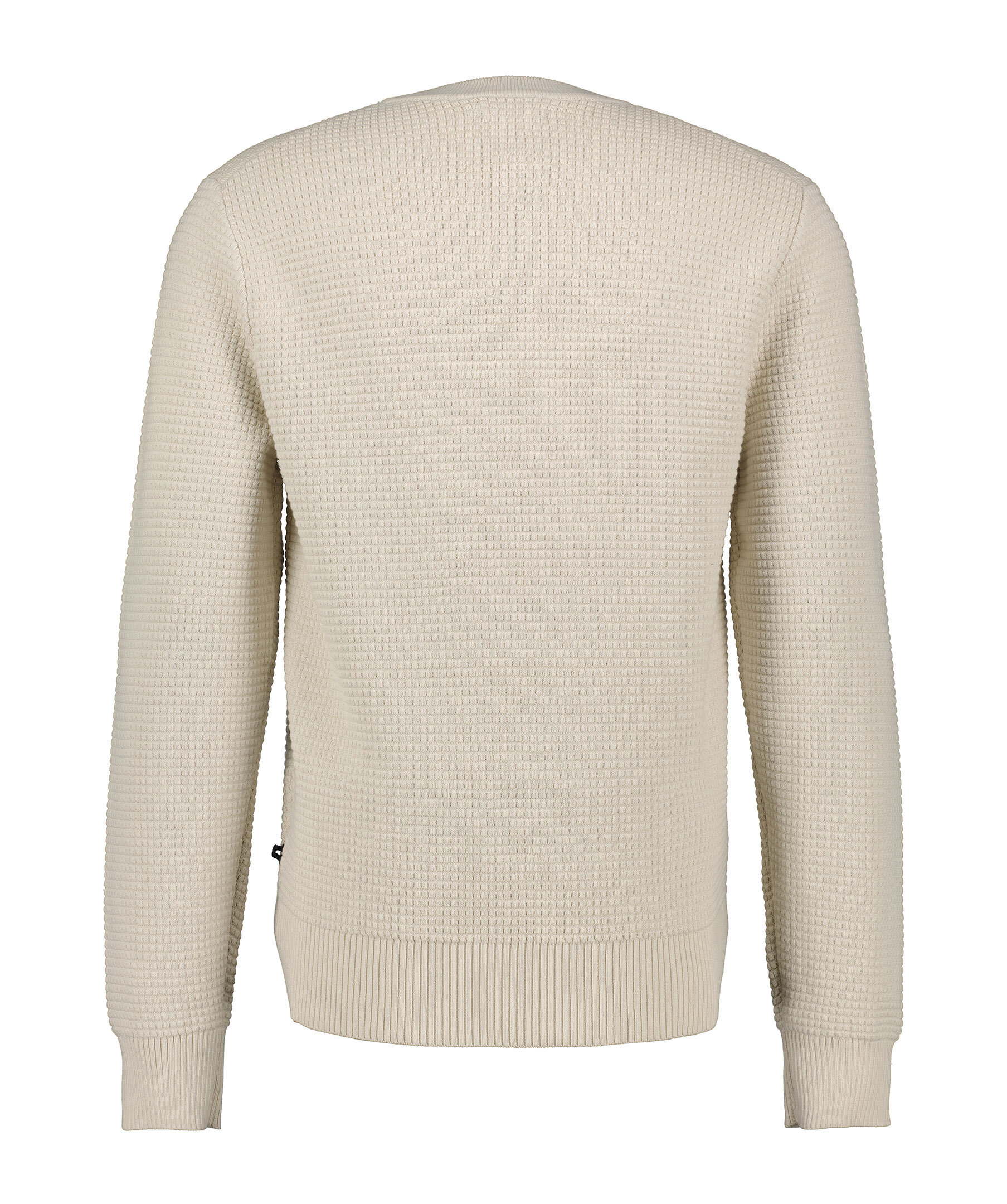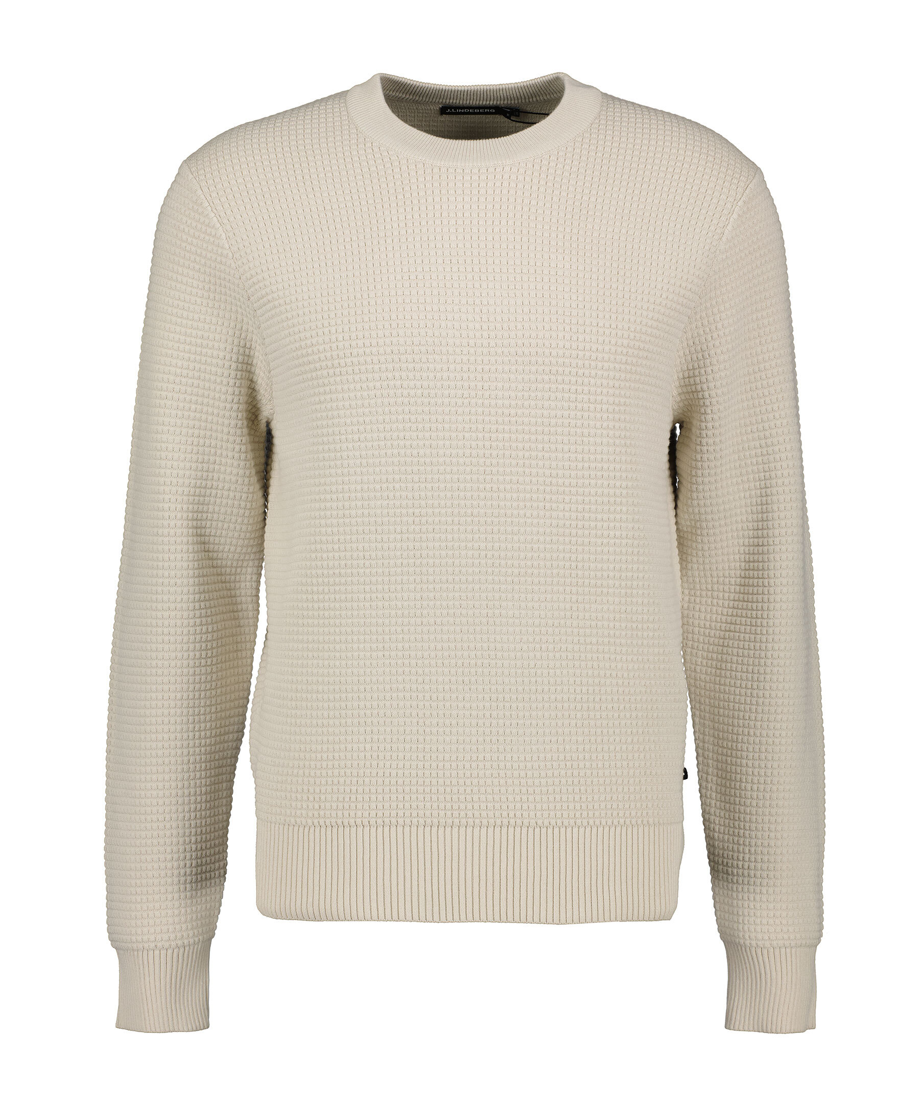 Beiga tröja från J.Lindeberg. Den strukturstickade tröjan har ribbstickade muddar och avslut och rundad halsringning. Tillverkad av 100% bomull.