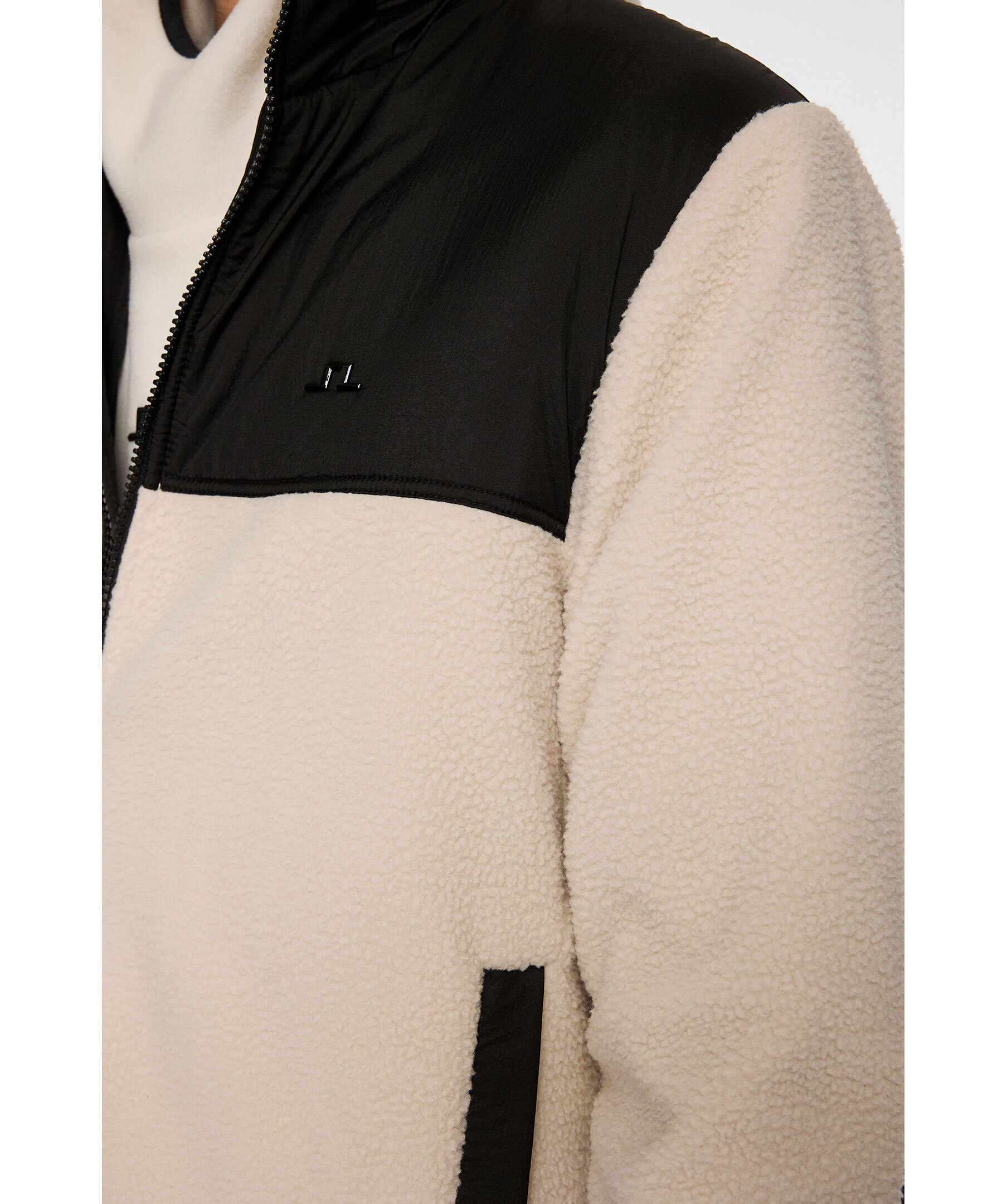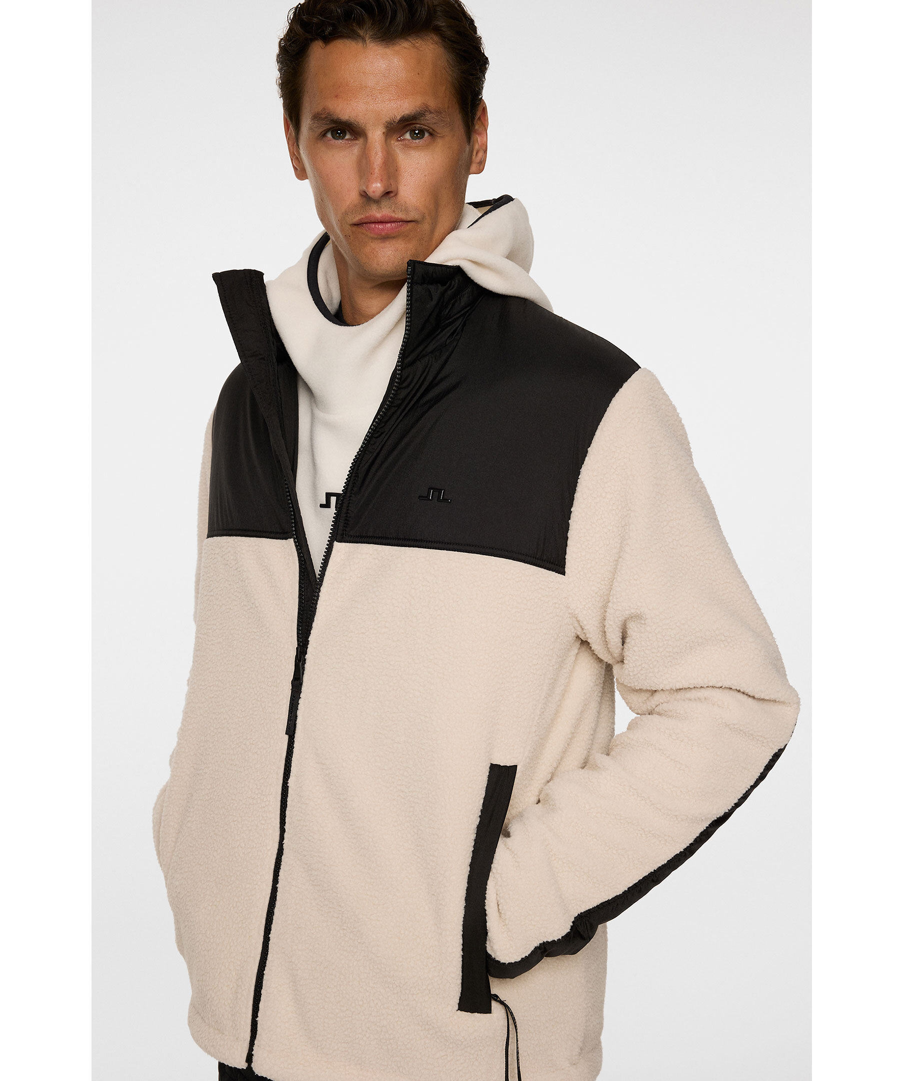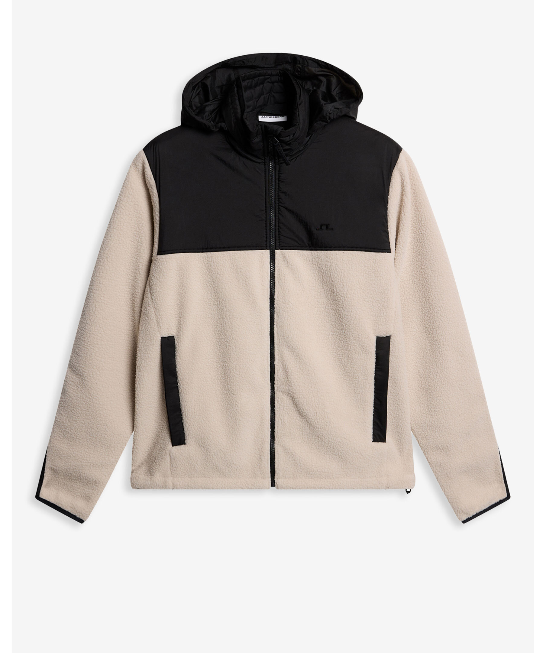 Svart och beige fleecejacka från J Lindberg. Jackan stängs med dragedja och har en dold, packbar huva, dragsko i midjan, fullfodring och säkra fickor med dragkedja är detta ett yttre lager som klarar allt. Tillverkad i återvunnen nylon samt återvunnen polarfleece med jersey.