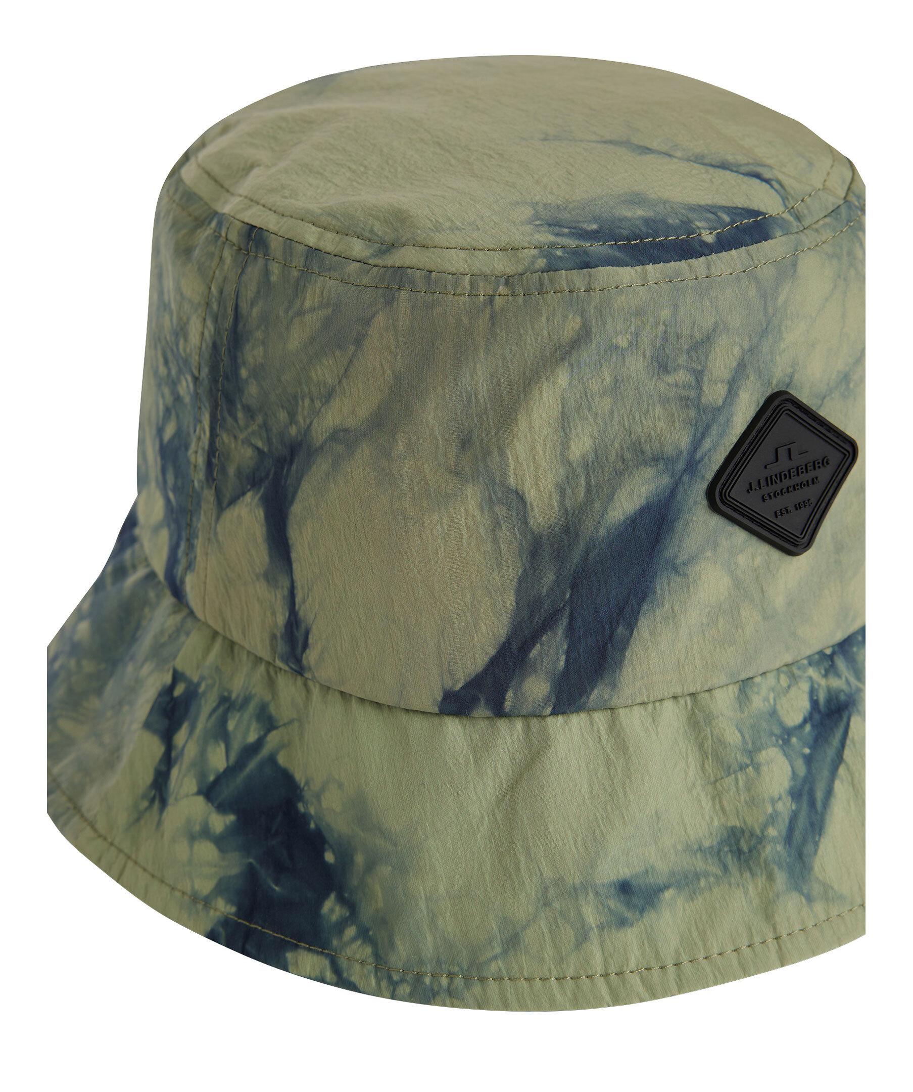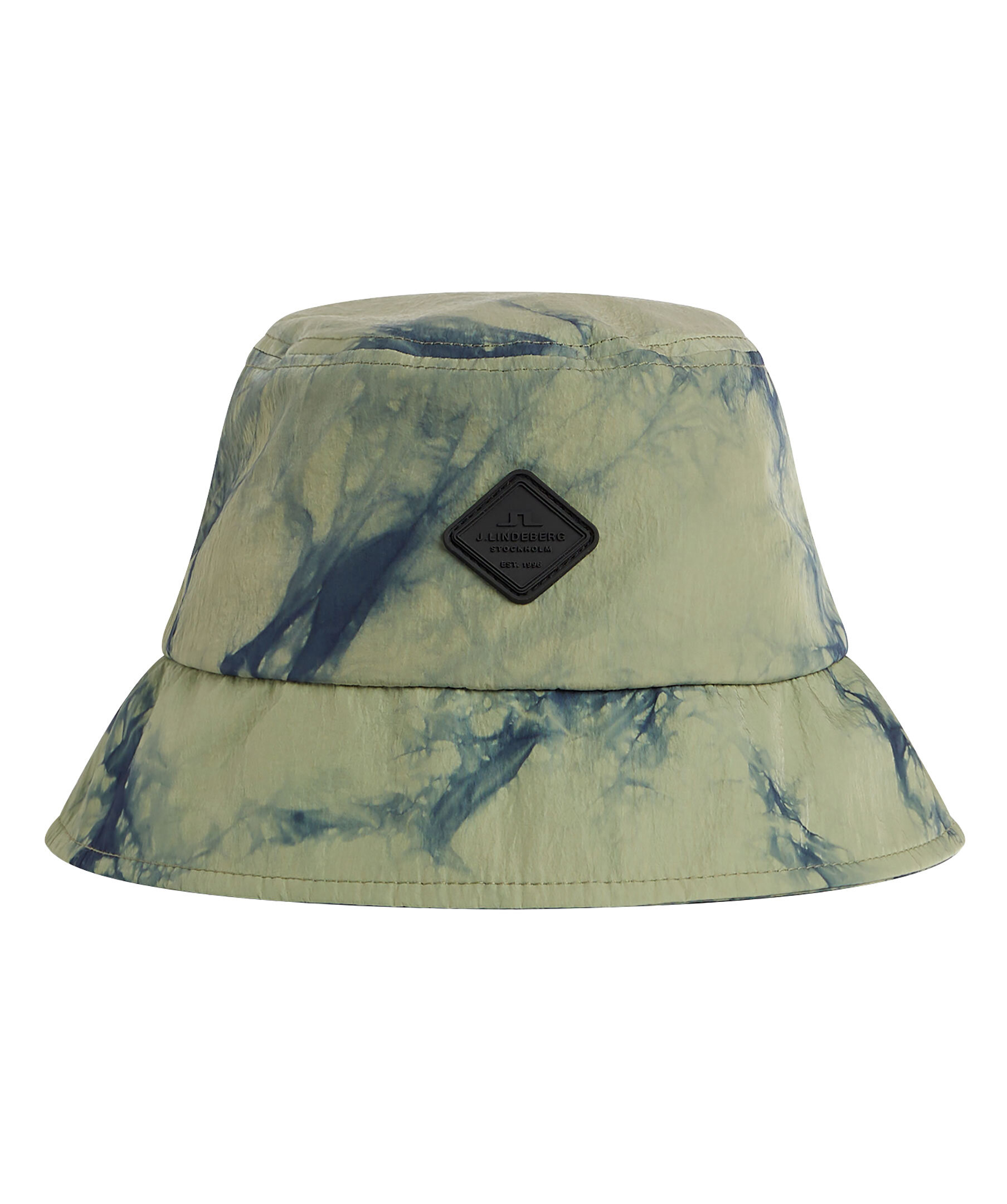 Grön och blå batikmönstrad bucket hat från J Lindeberg. Gummerad logotyp på hattens framsida. Smalt brätte. Tillverkad i 100% återvunnet nylon.