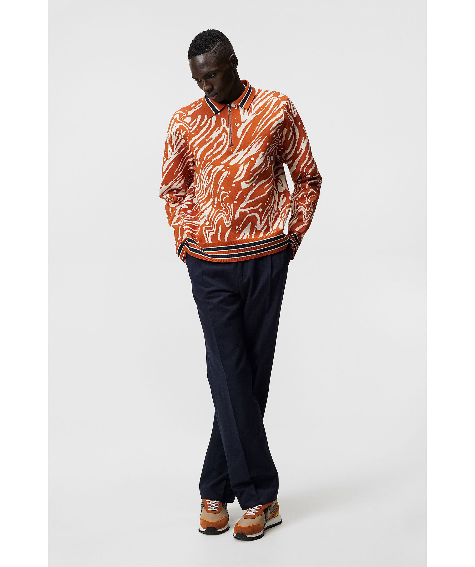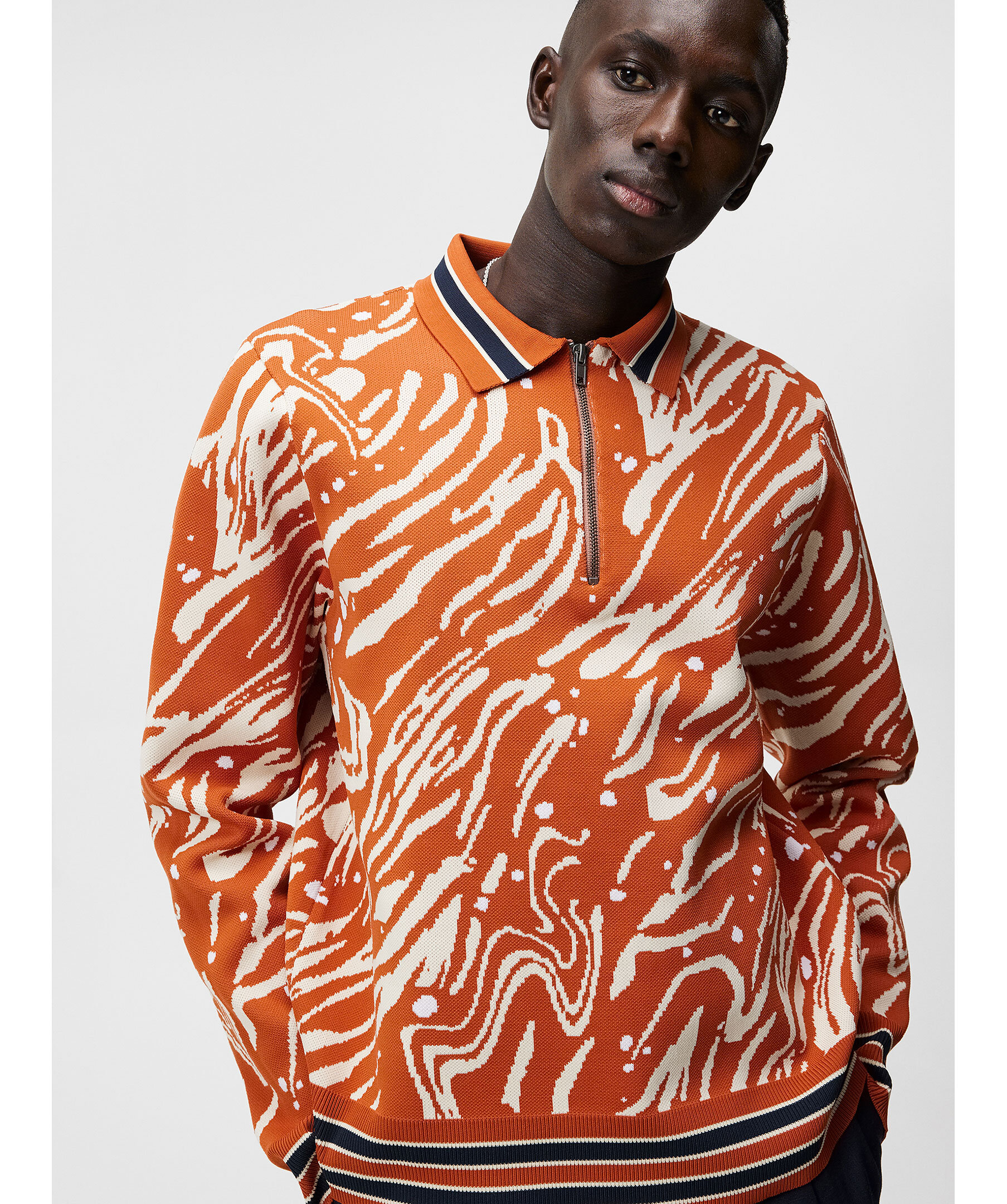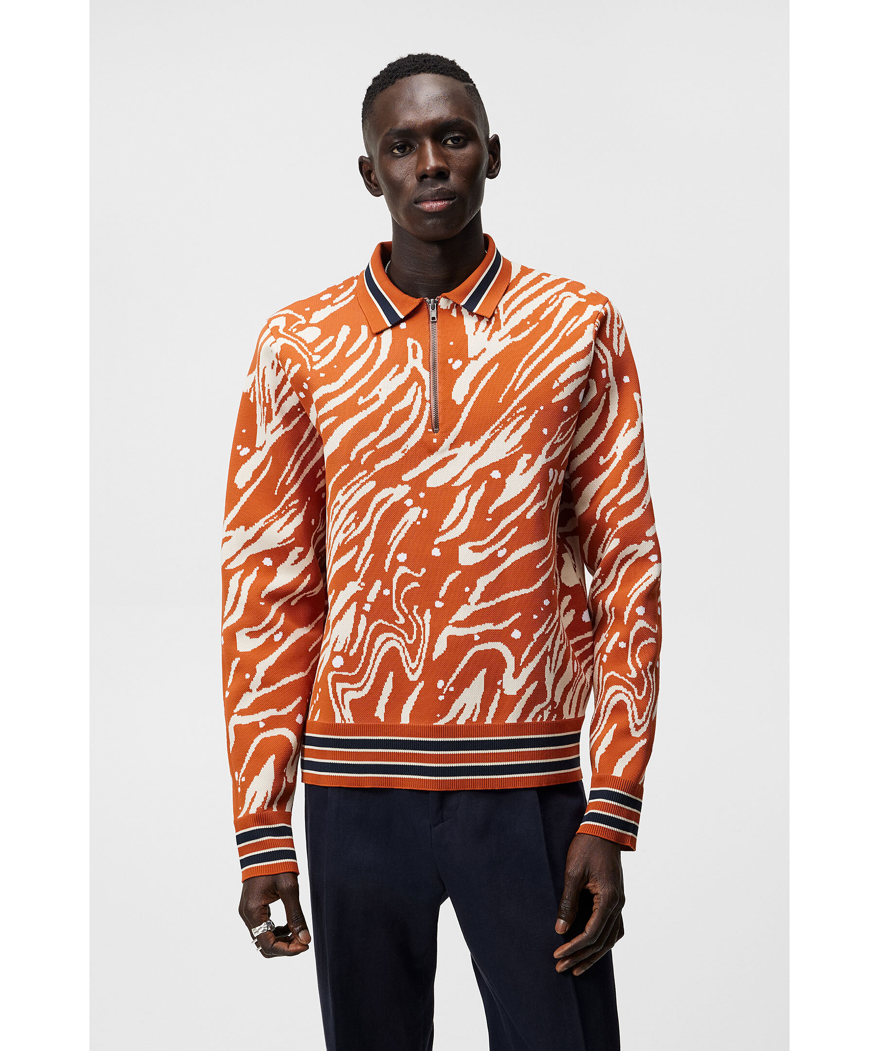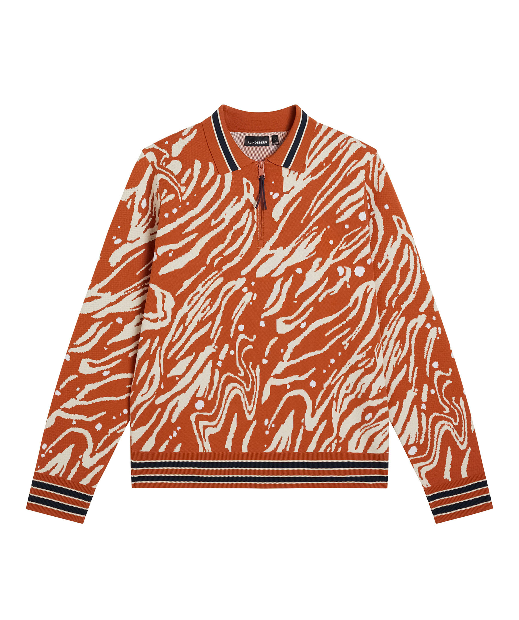 Rostbrun och krämvit mönstrad half-zip från J Lindeberg. Randig ribbstickad mudd vid ärm- och plaggslut. Finstickad krage med mörkblå och vit rand.