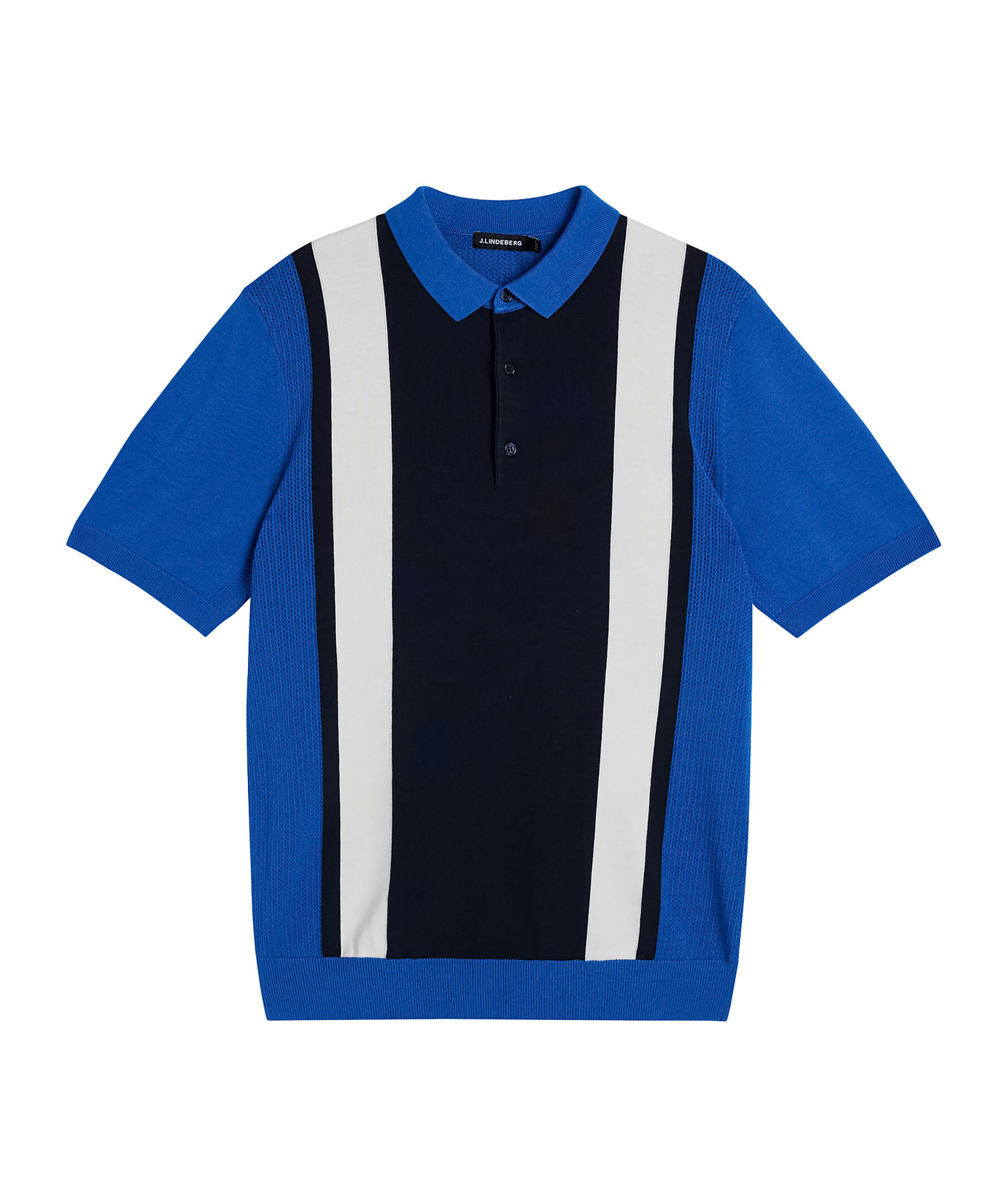 Blå, vit och svart randig piké från J Lindeberg. Ribbstickade muddar vid ärm- och plaggslut. Mesh stickade paneler i sidan av tröjan. Tillverkad i viskos och silkes blandning.