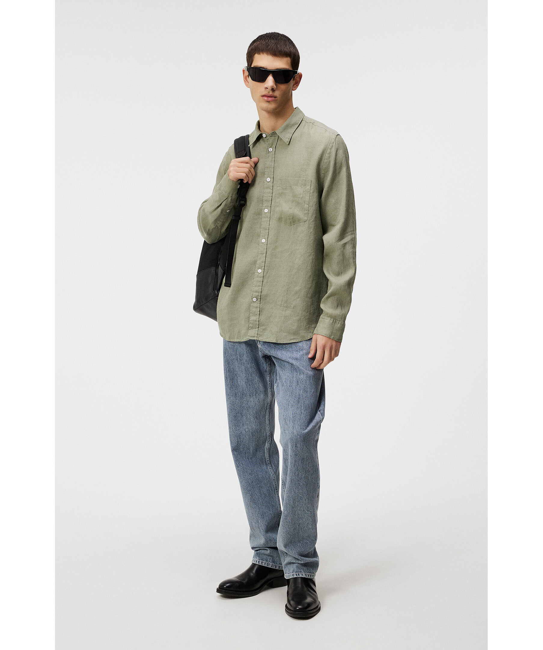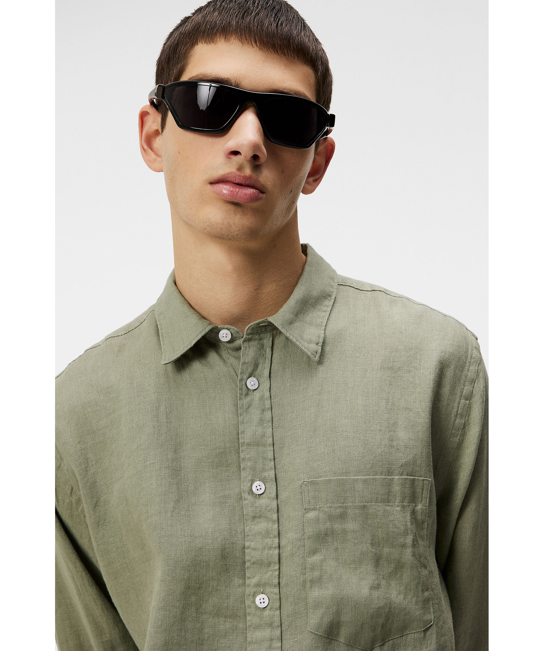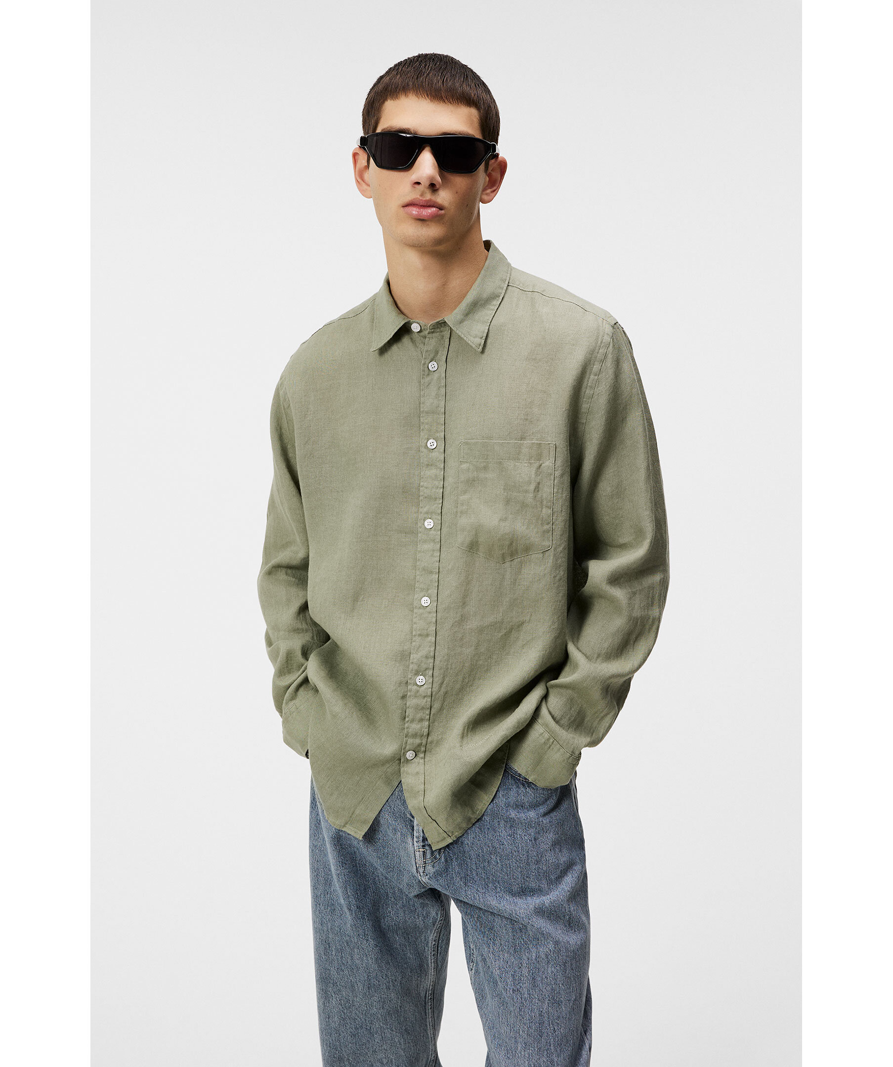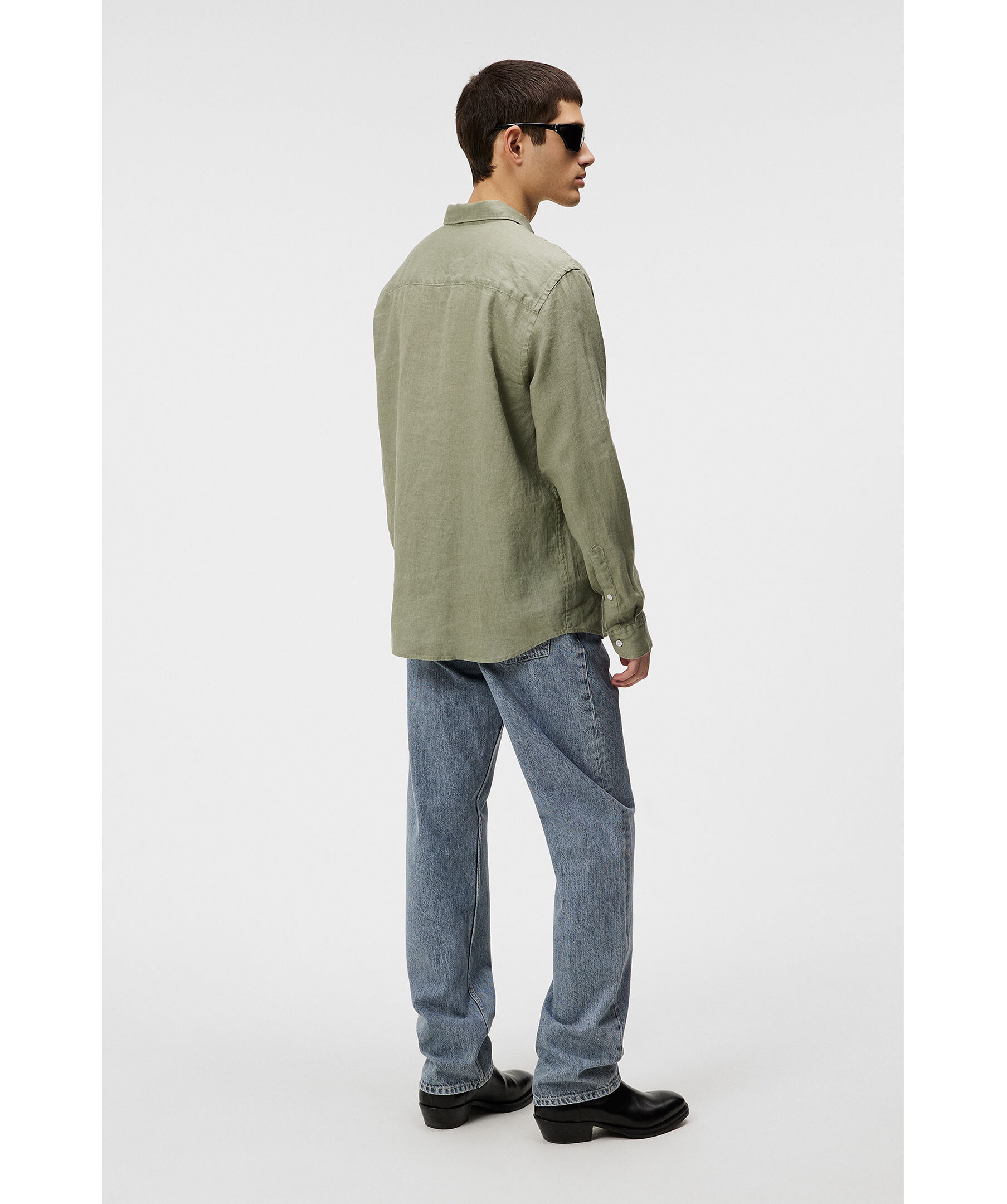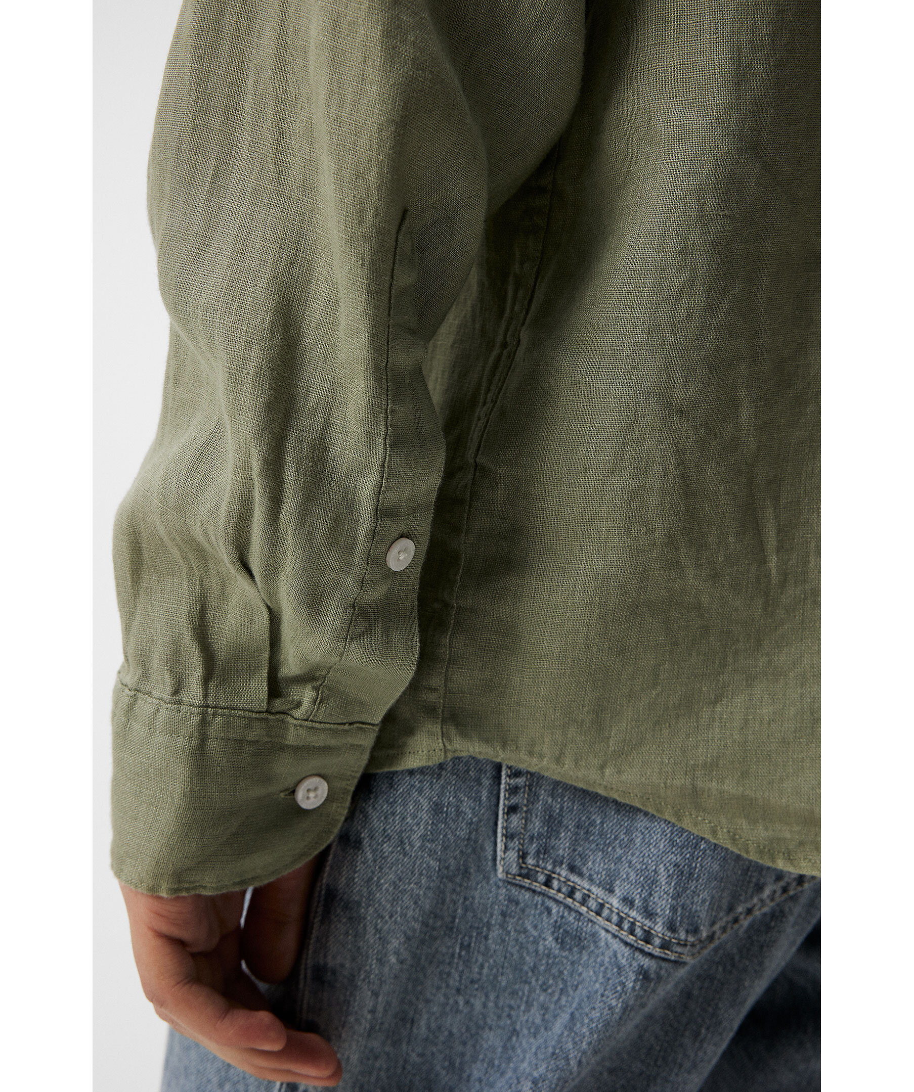 Olivgrön linneskjorta från J Lindeberg. Skjortan har button down krage, en bröstficka, ok i ryggen och rundad nederkant. Tillverkad i linne.