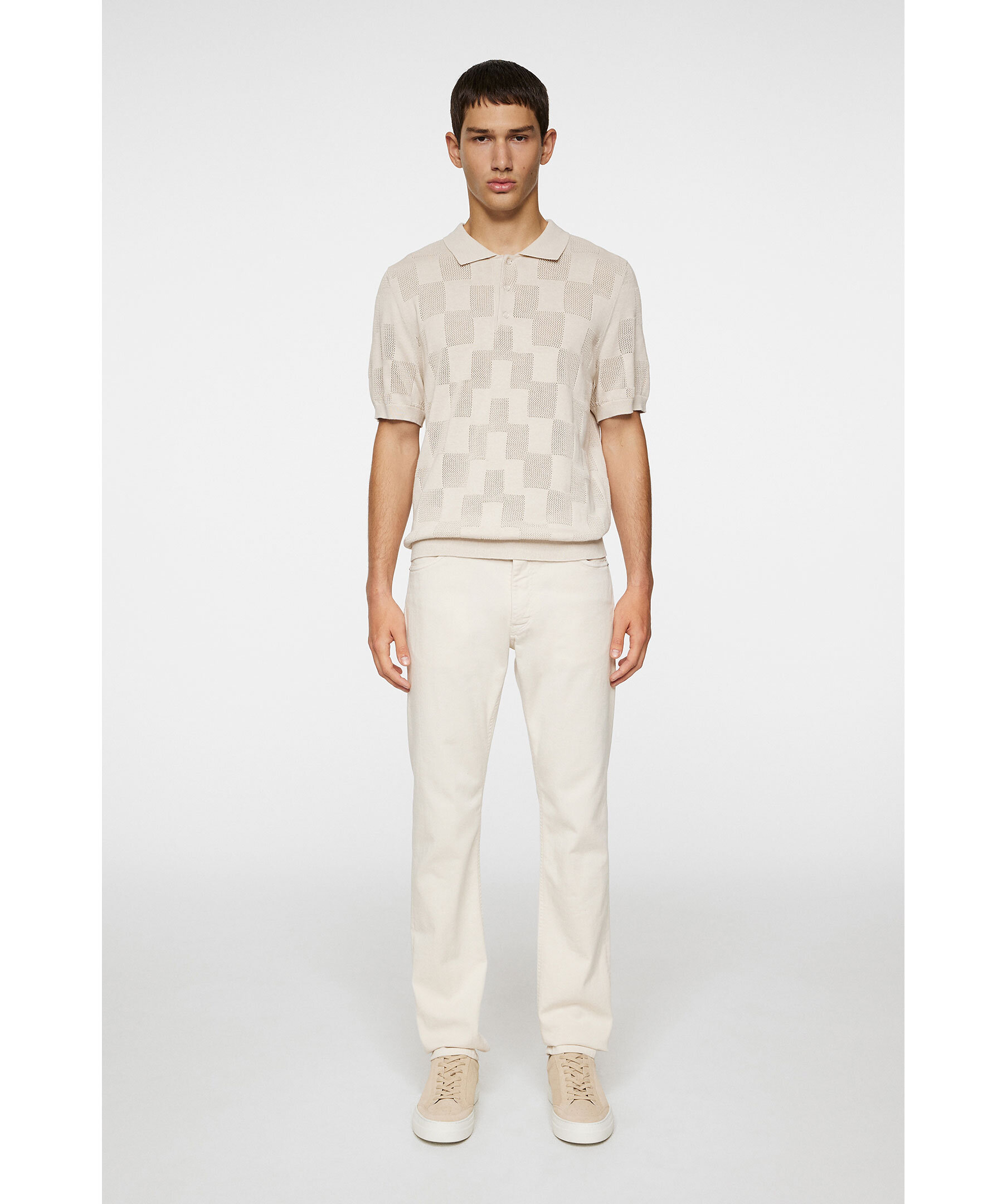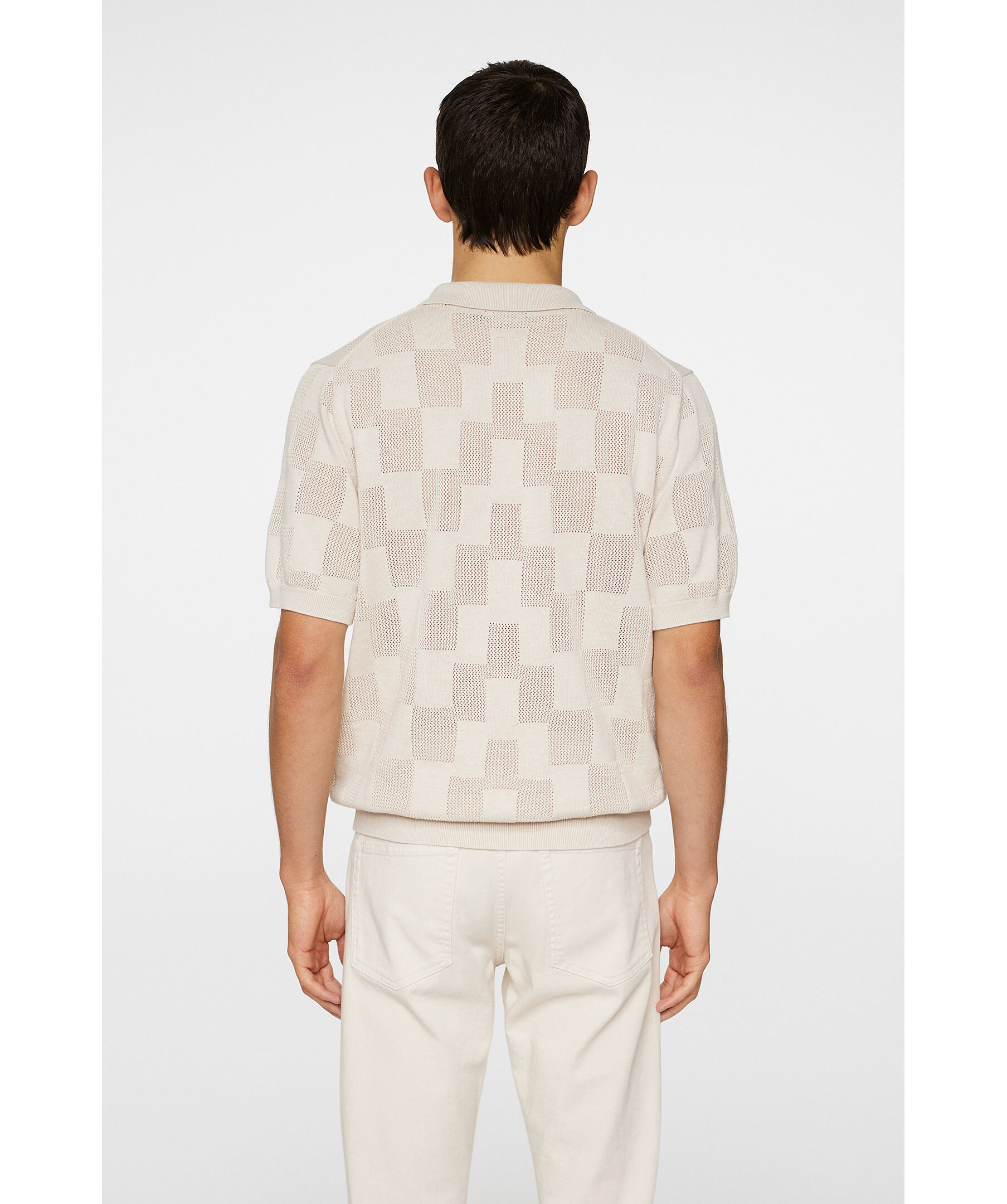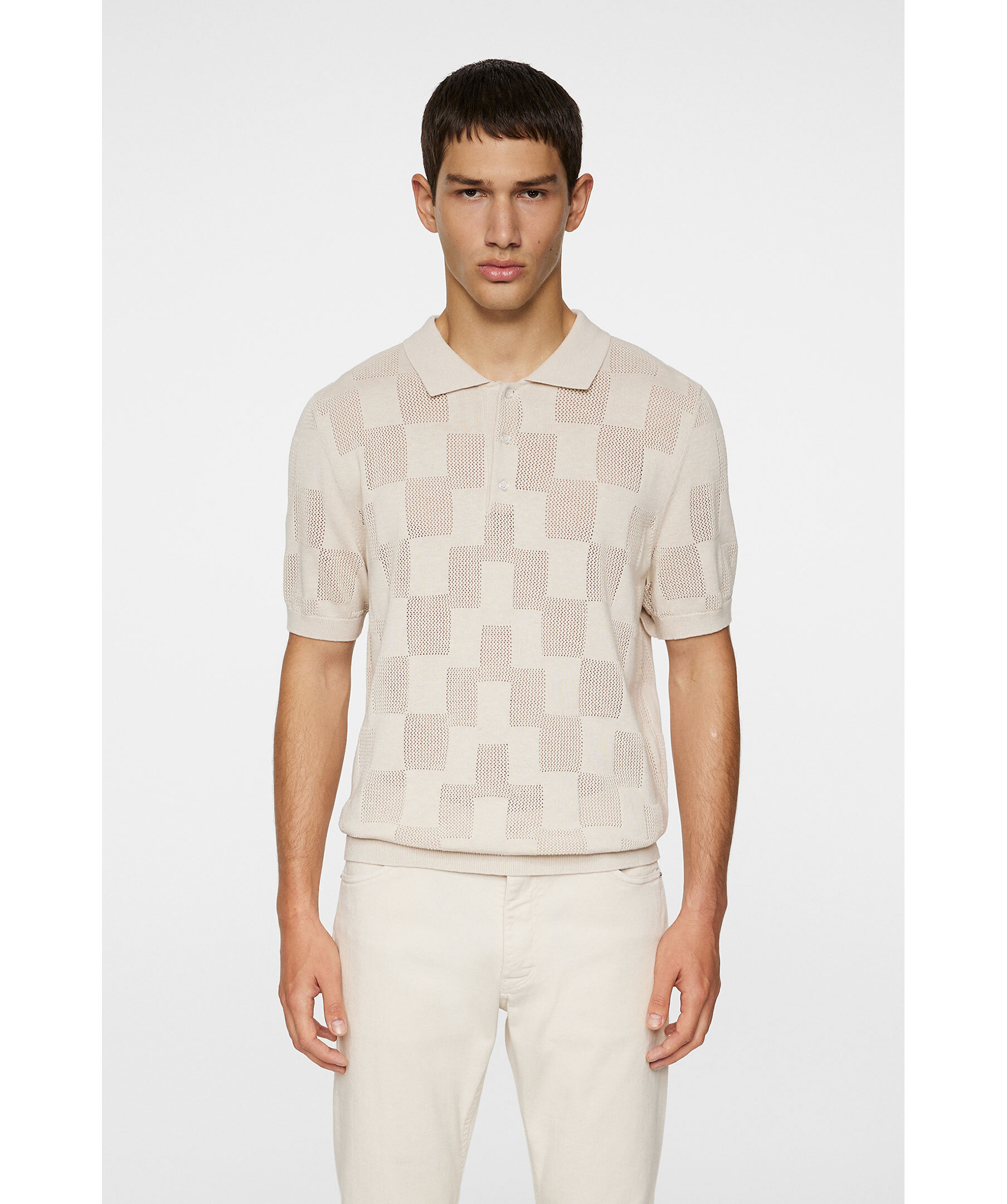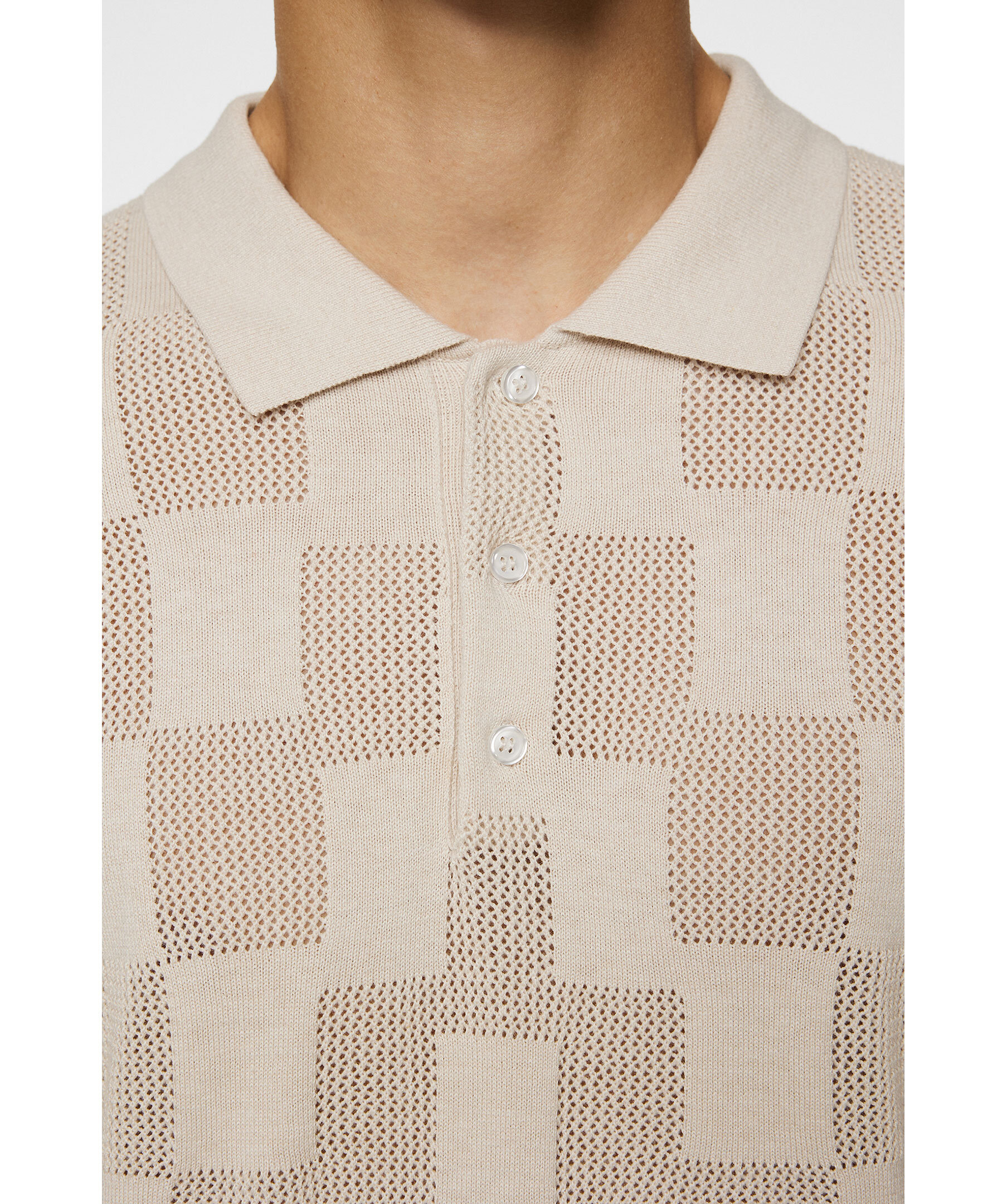 Beige, finstickad piké från J Lindeberg. Pikén har tre knappar framtill och ett rutmönster. Tillverkad i en bomull- och kashmirblandning.