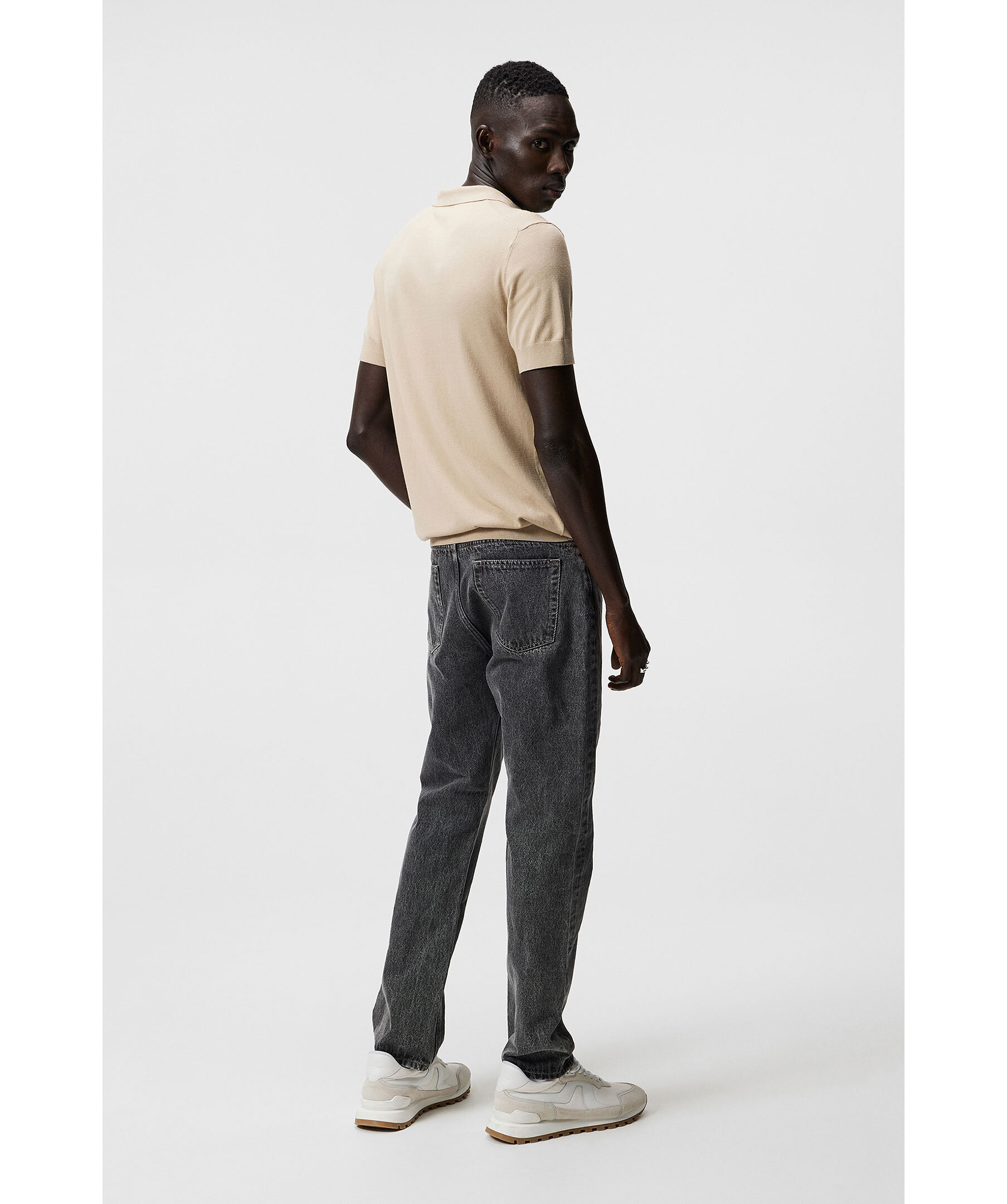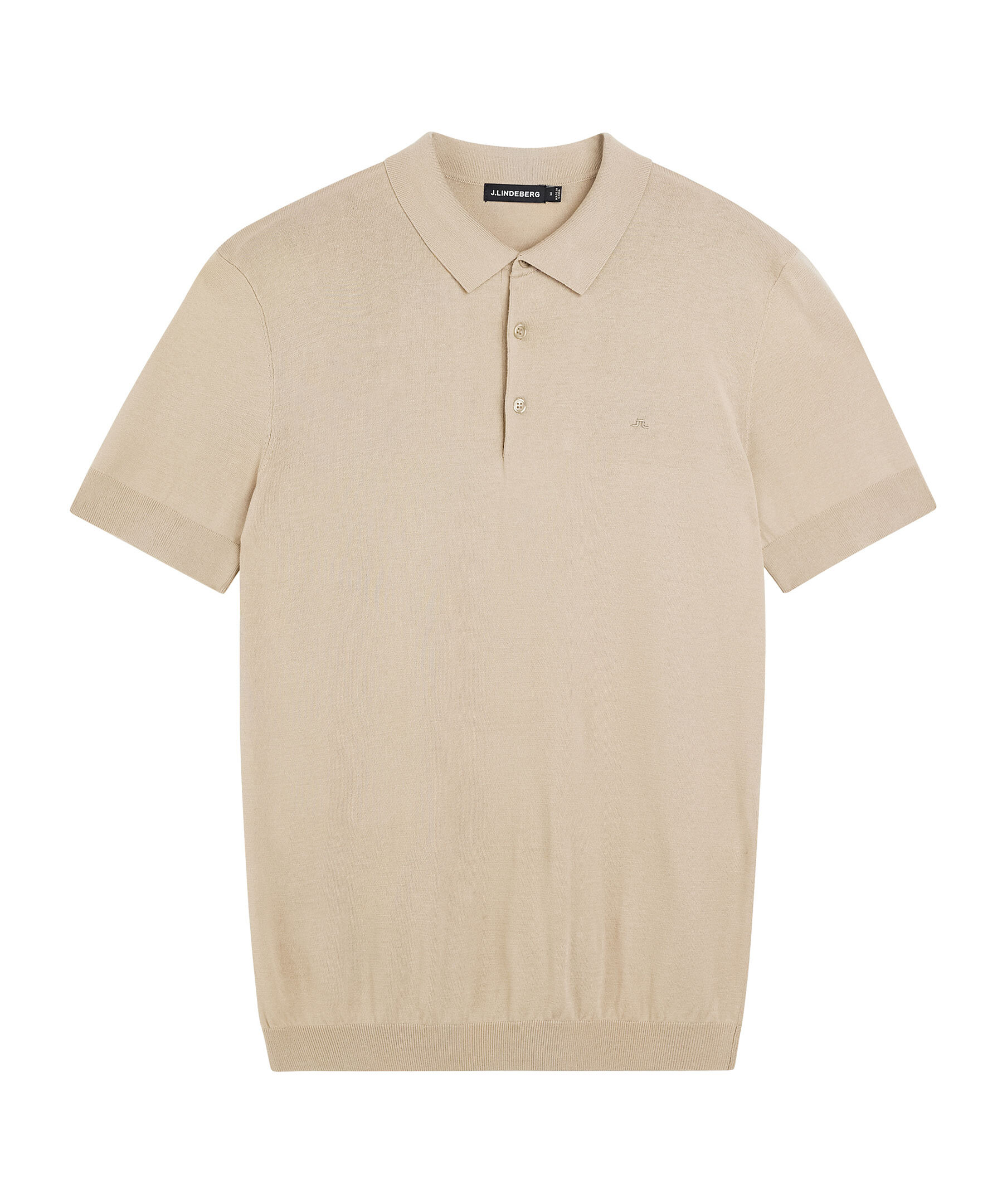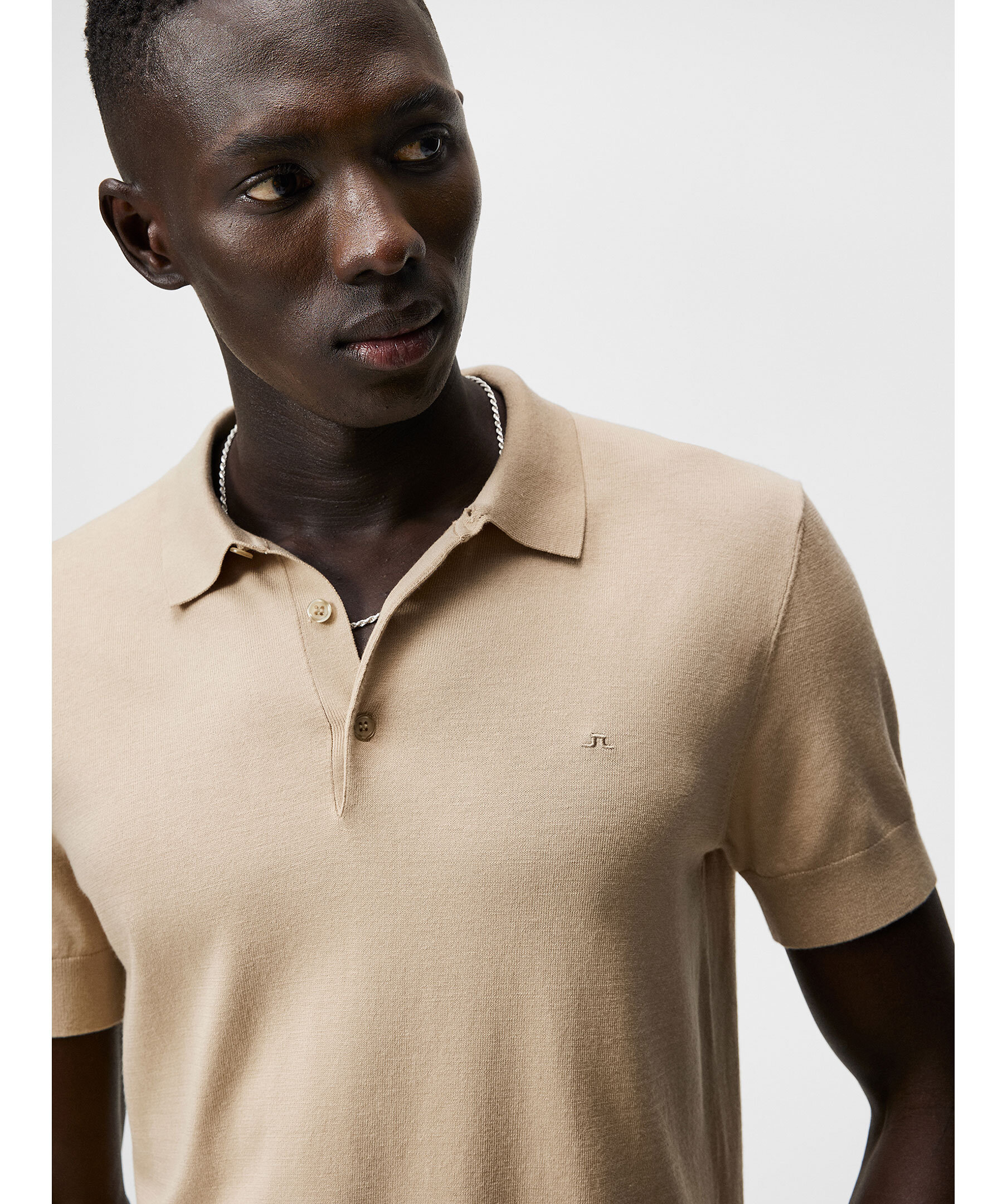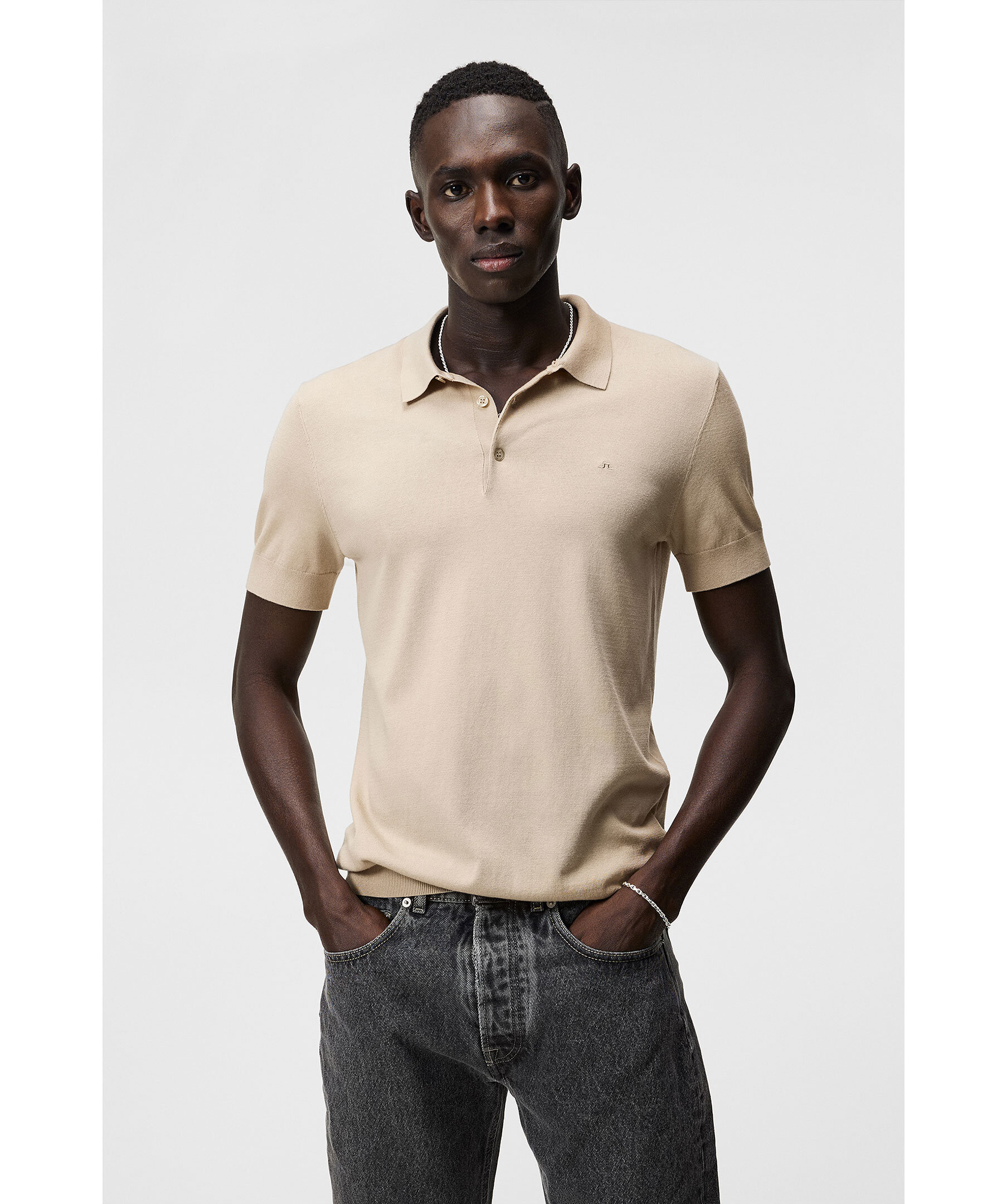 Beige finstickad piké från J Lindeberg. Ribbstickade muddar vid ärm och plaggslut. Platt stickad krage, tre knappar. Broderad logotyp på bröstet. Smal passform.