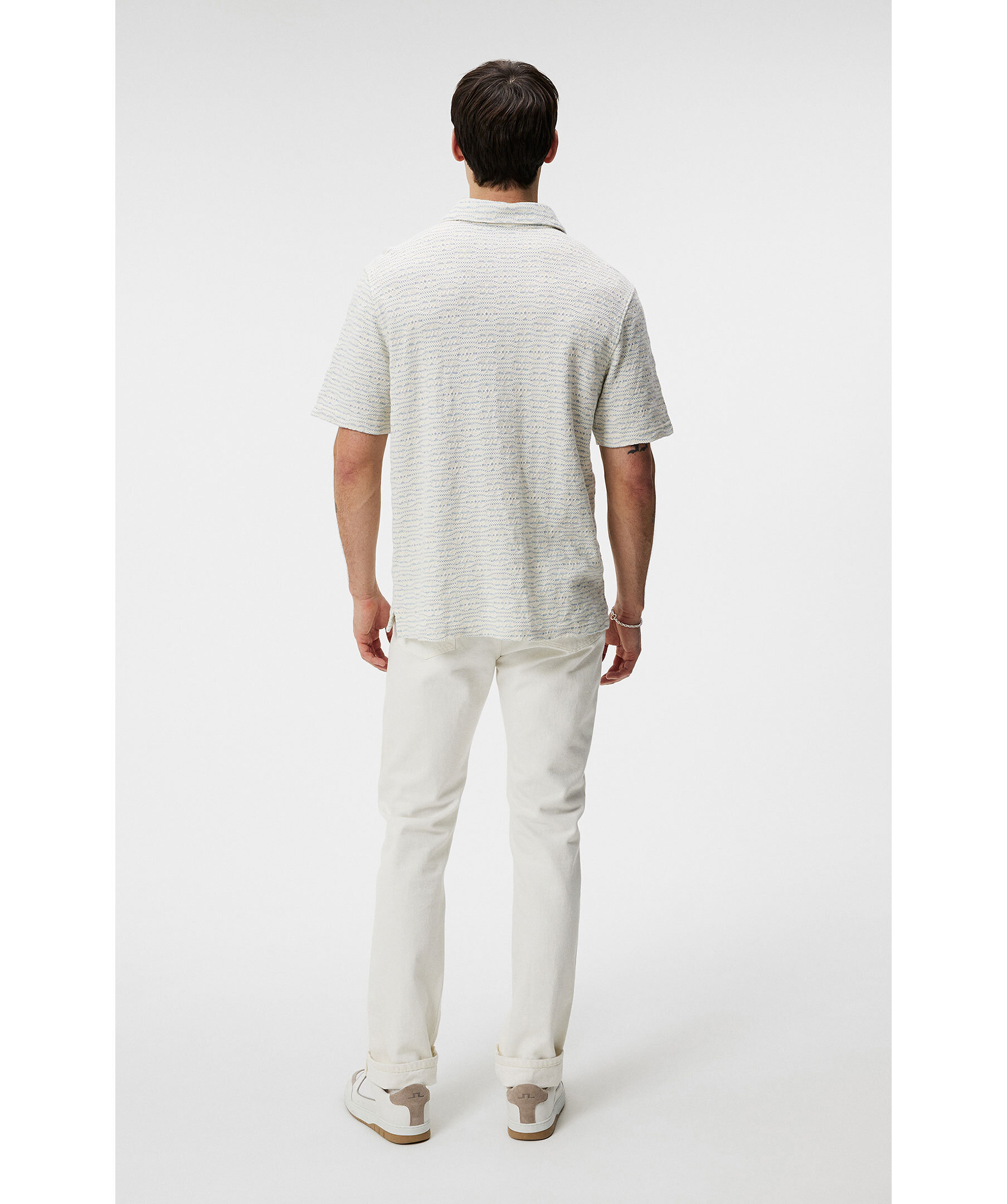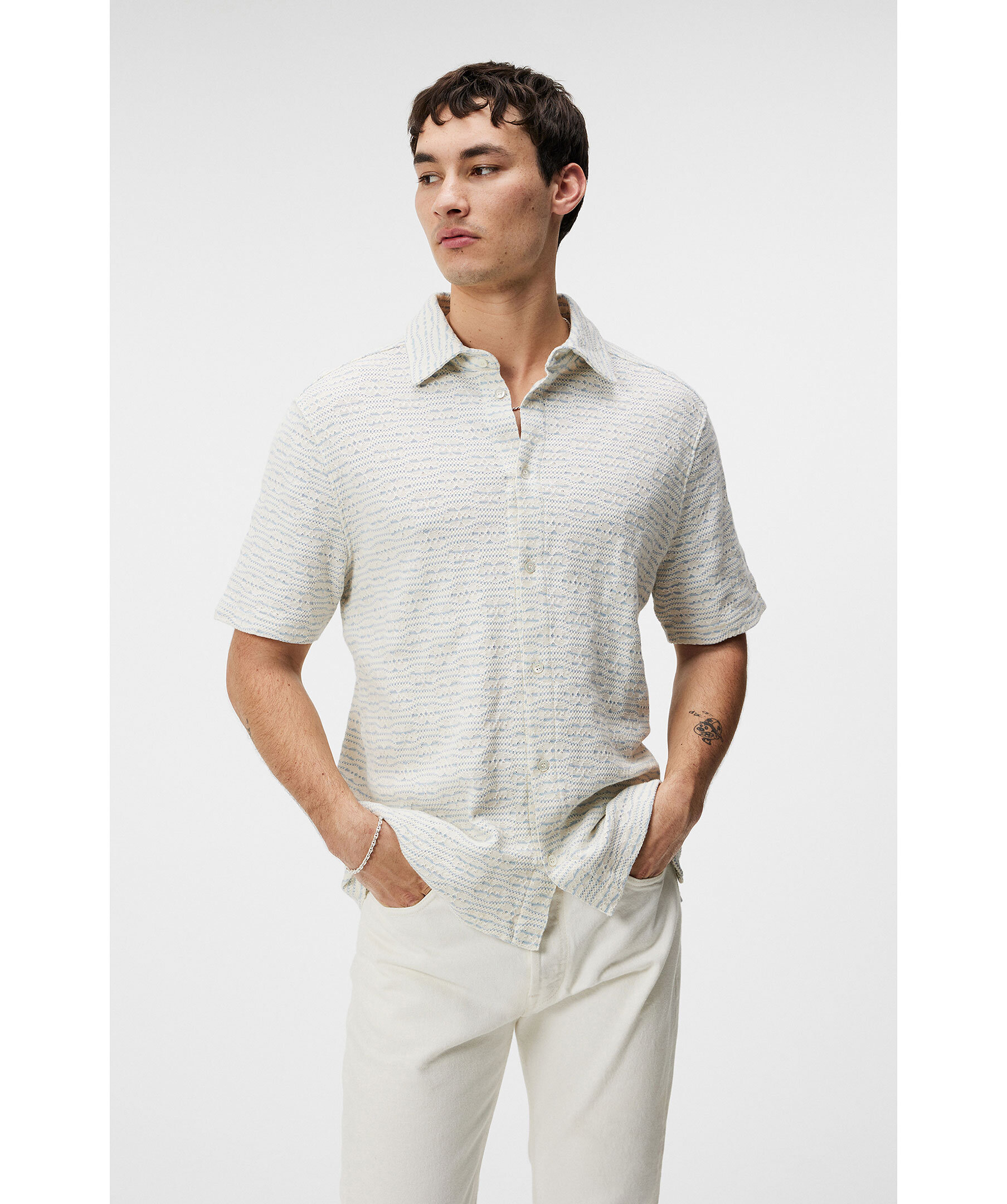 Krämvit och ljusblå, randig och strukturstickad kortärmad skjorta från J Lindeberg. Stängs framtill med knappar. Spetsig krage. Tillverkad i Bomullsblandning. Korta i slitsar i sidorna.