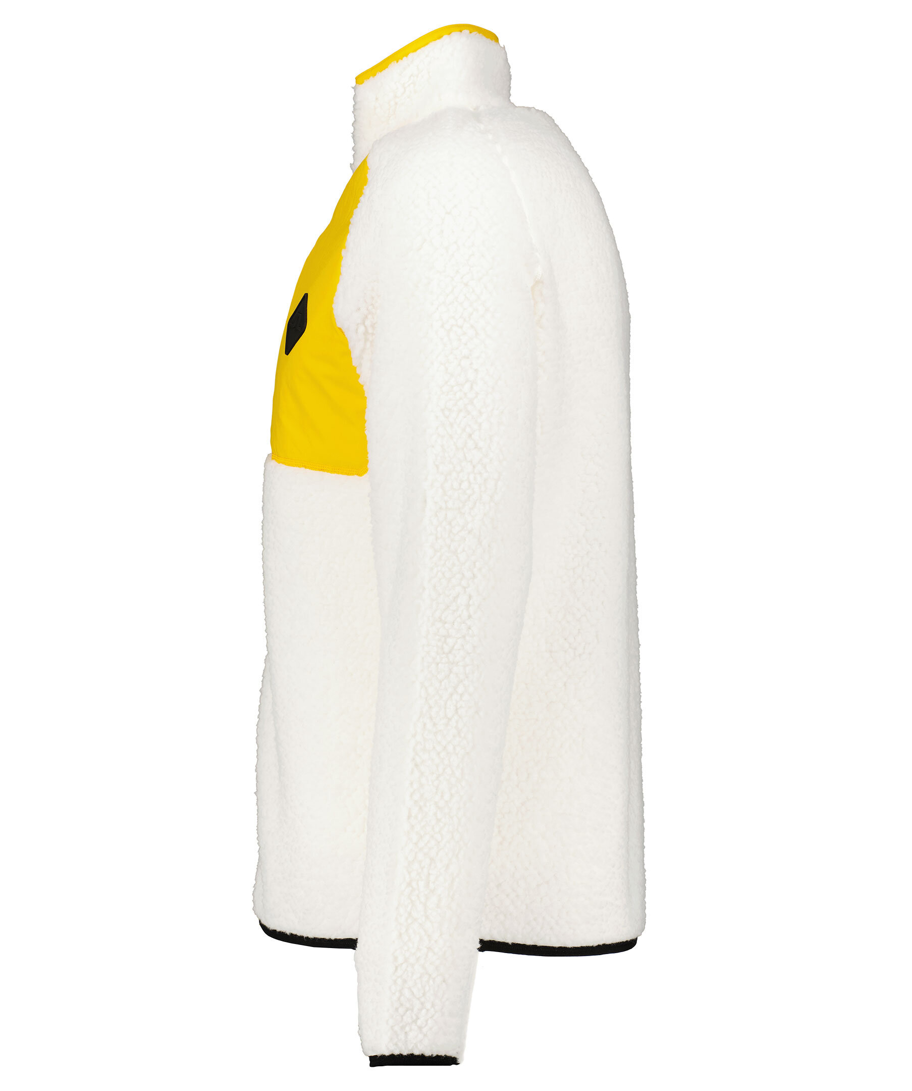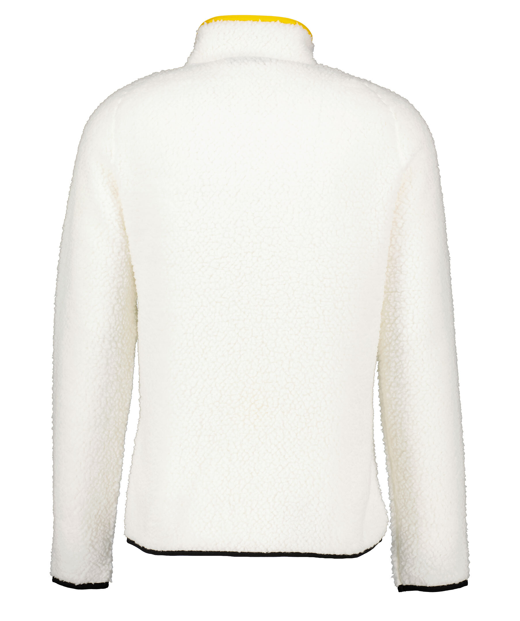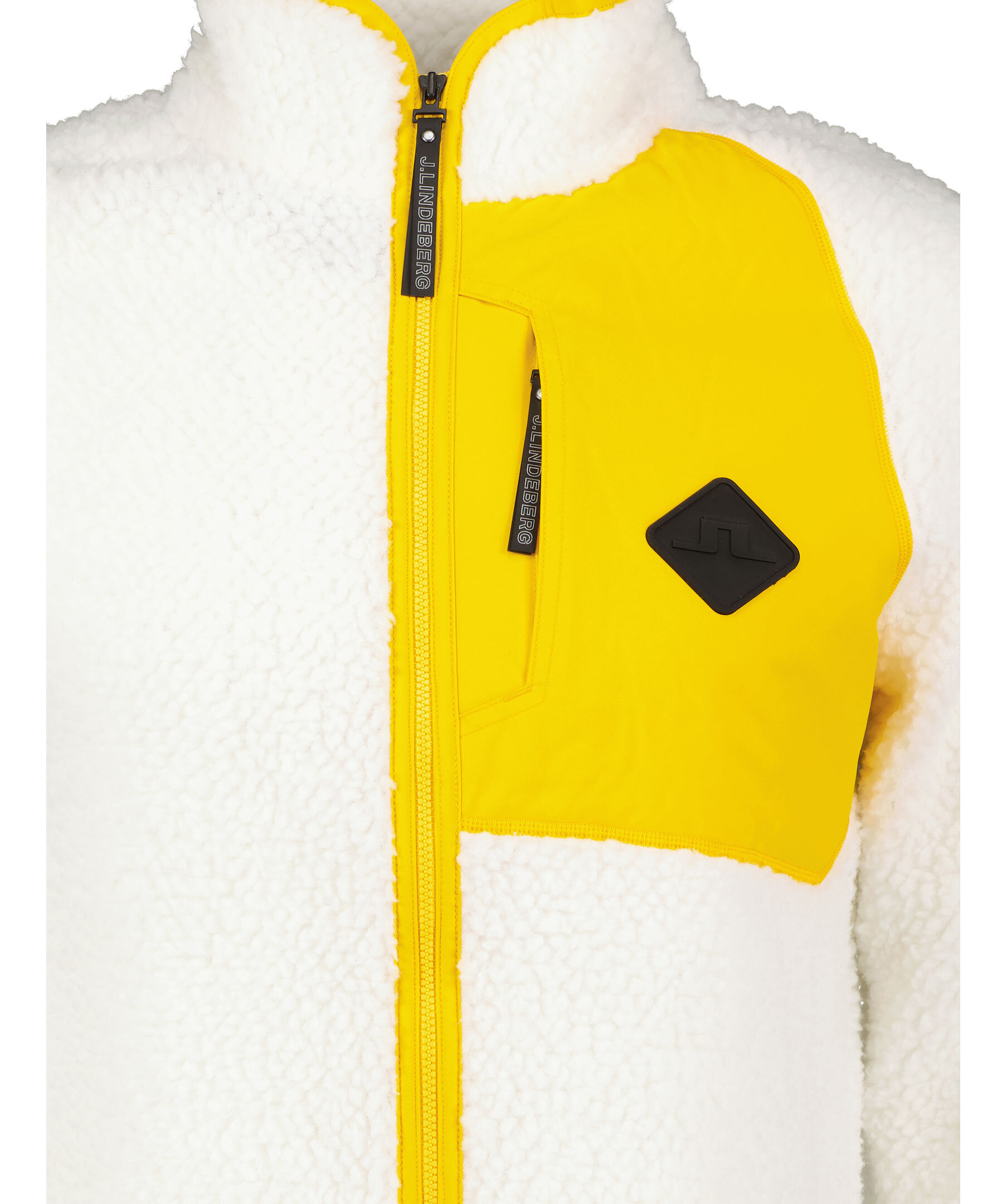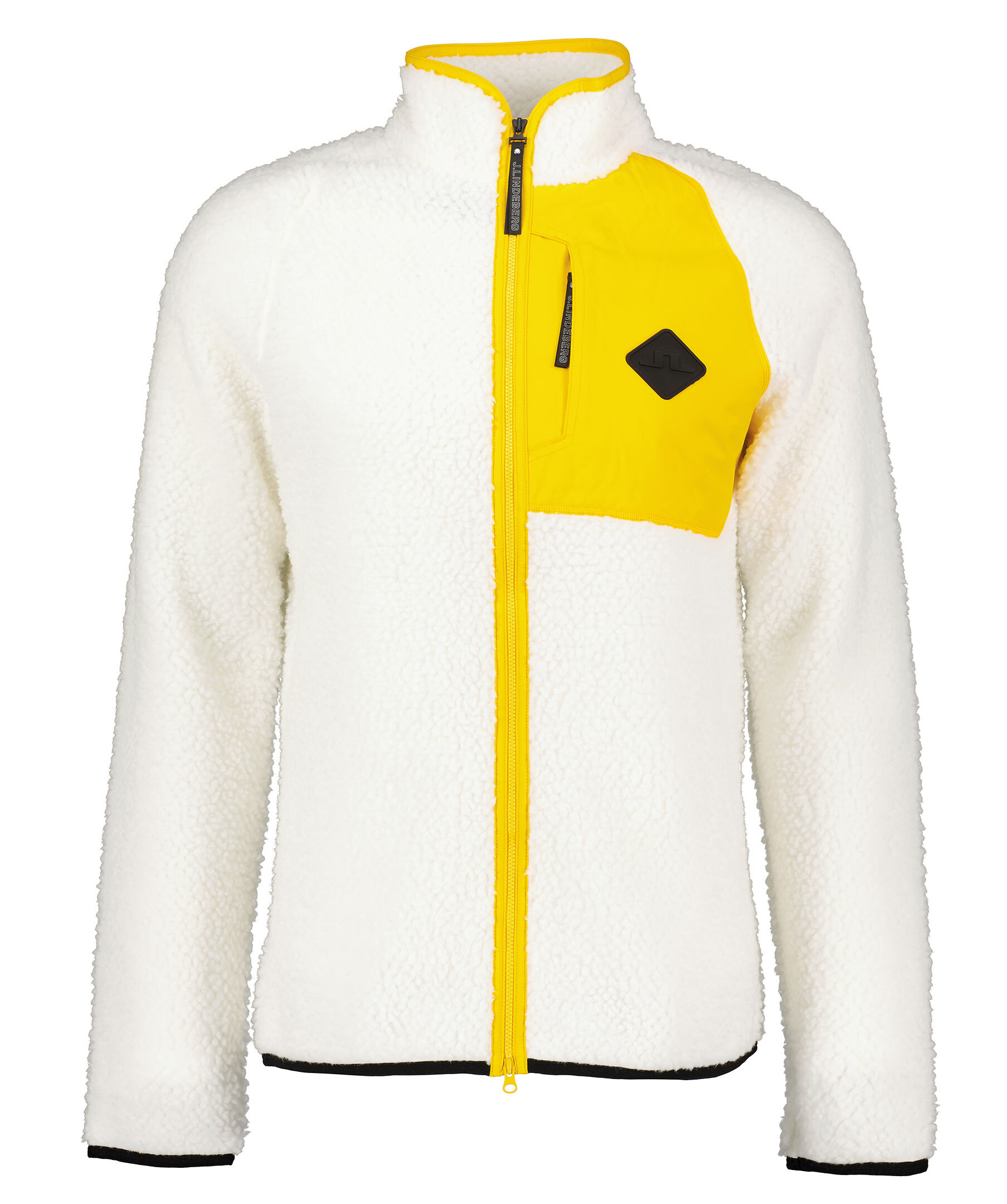 Vit fleecetröja med gula detaljer från J.Lindeberg. Stängs med tvåvägsdragkedja och gjord i mjukt pile-tyg med kontrastfärgad bröstficka med blixtlåsstängning. Hög krage, raglanärmar, elastiskt, svart band på fållar och manschetter. Diamantformat logotypeblem på bröstet. Fukttransporterande och snabbtorkande.