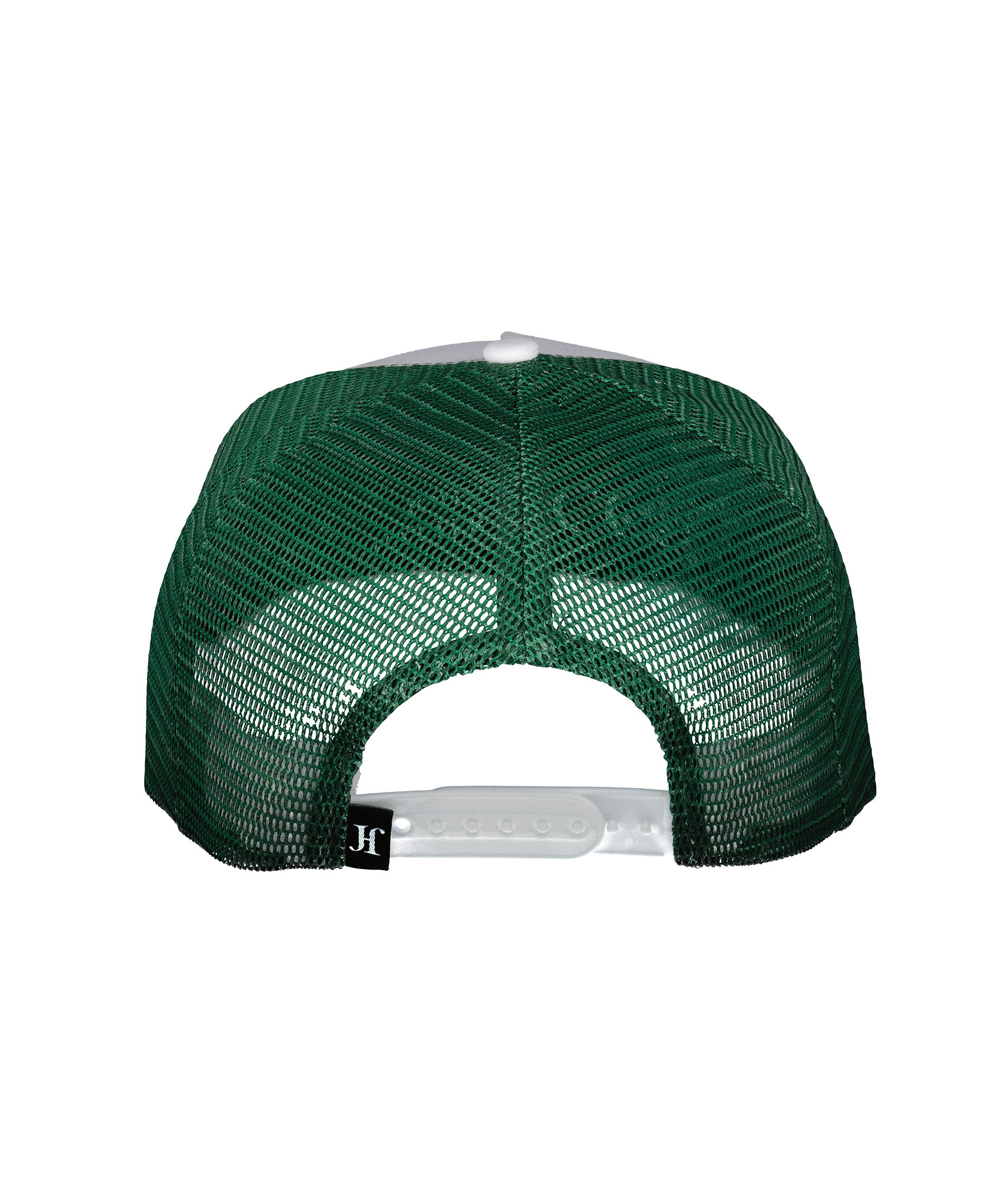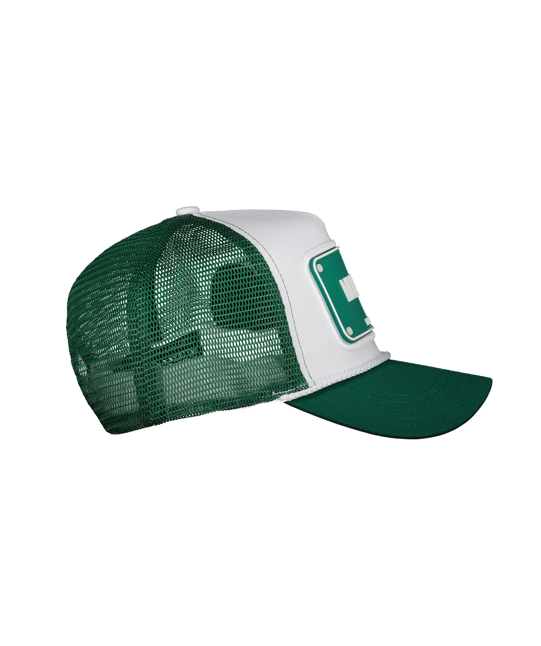 Vit och grön keps i en trucker-basebollmodell från John Hatter. Grön skärm, meshtyg och fyrkantig patch med vit logotyp. Justerbart vitt spänne baktill och snördetalj framtill. Tillverkad i en bomullsblandning.