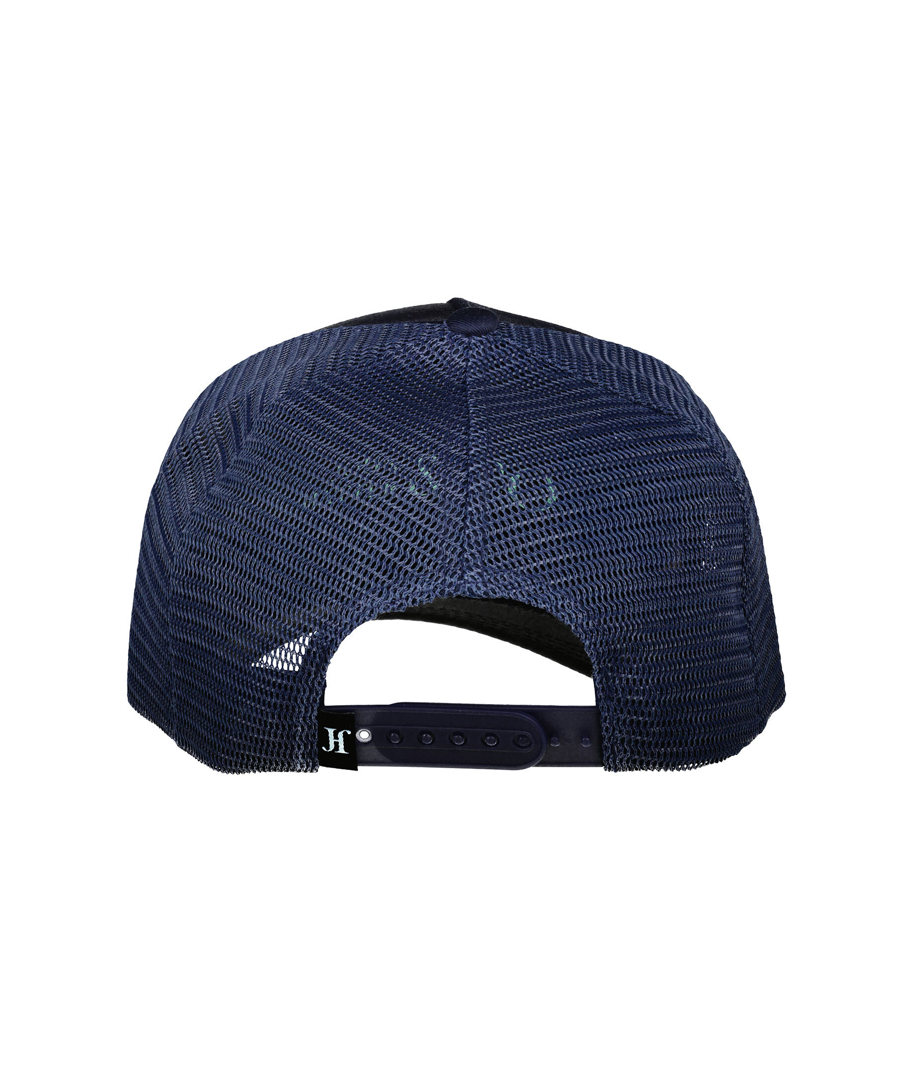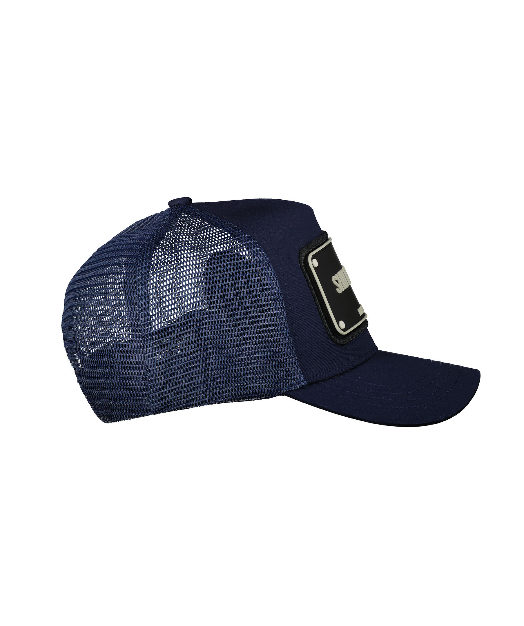 Blå keps i trucker-basebollmodell från John Hatter. Svart, fyrkantig patch med grå logotyp. Justerbart spänne baktill. Tillverkad i en bomullsblandning.