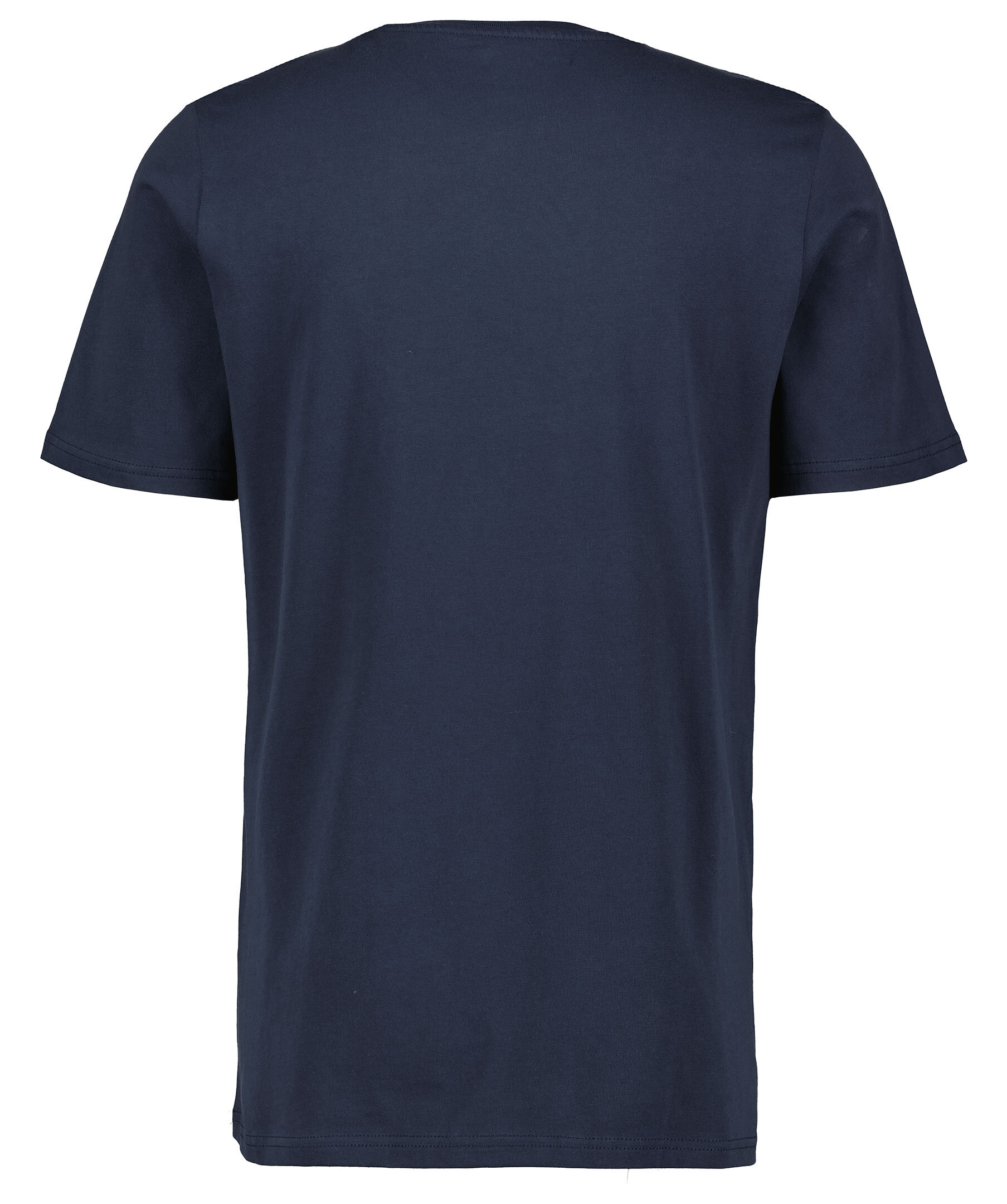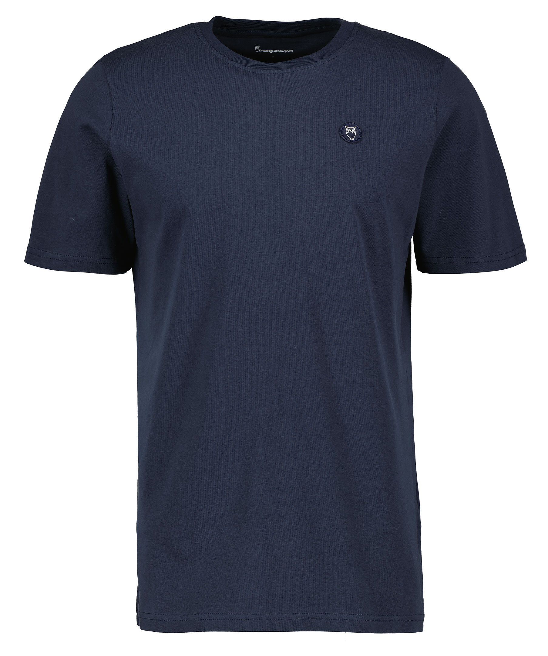 Marinblå t-shirt från Knowledge Cotton. Gjord i ett tunt bomullstyg, broderad logotyp på vänster sida på bröstet. Rundad och ribbad halsring.