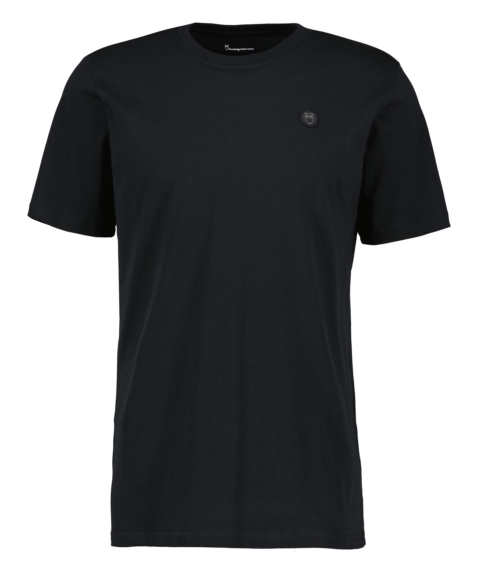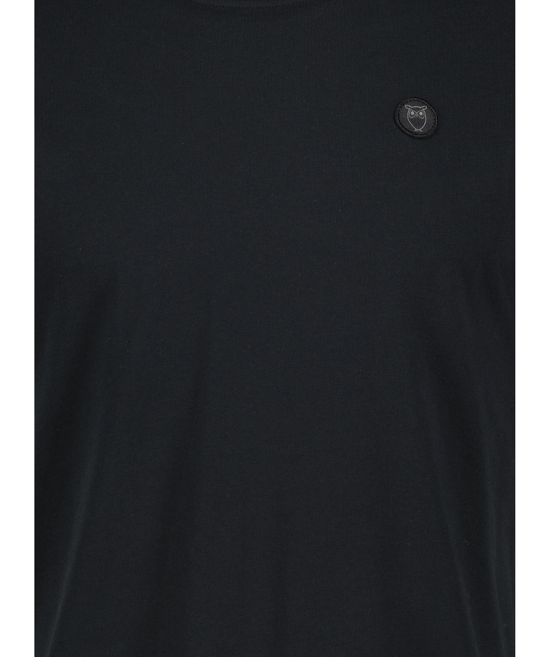 Svart t-shirt från Knowledge Cotton. Gjord i ett tunt ekologiskt bomullstyg, broderad logotyp på vänster sida på bröstet. Rundad och ribbad halsring.