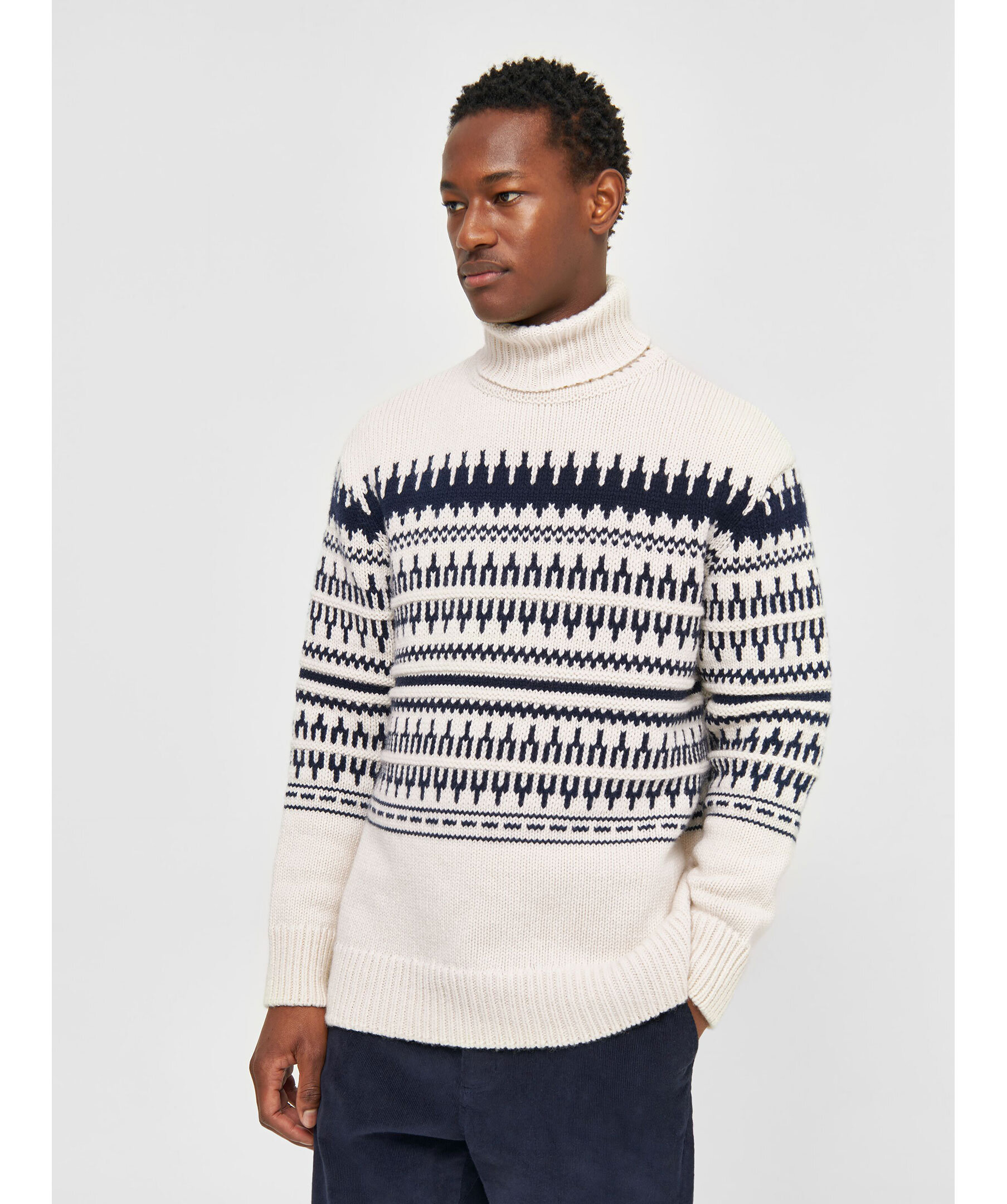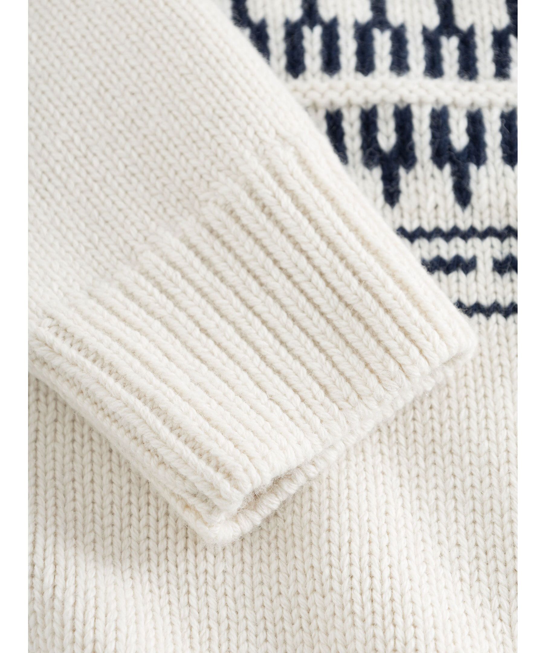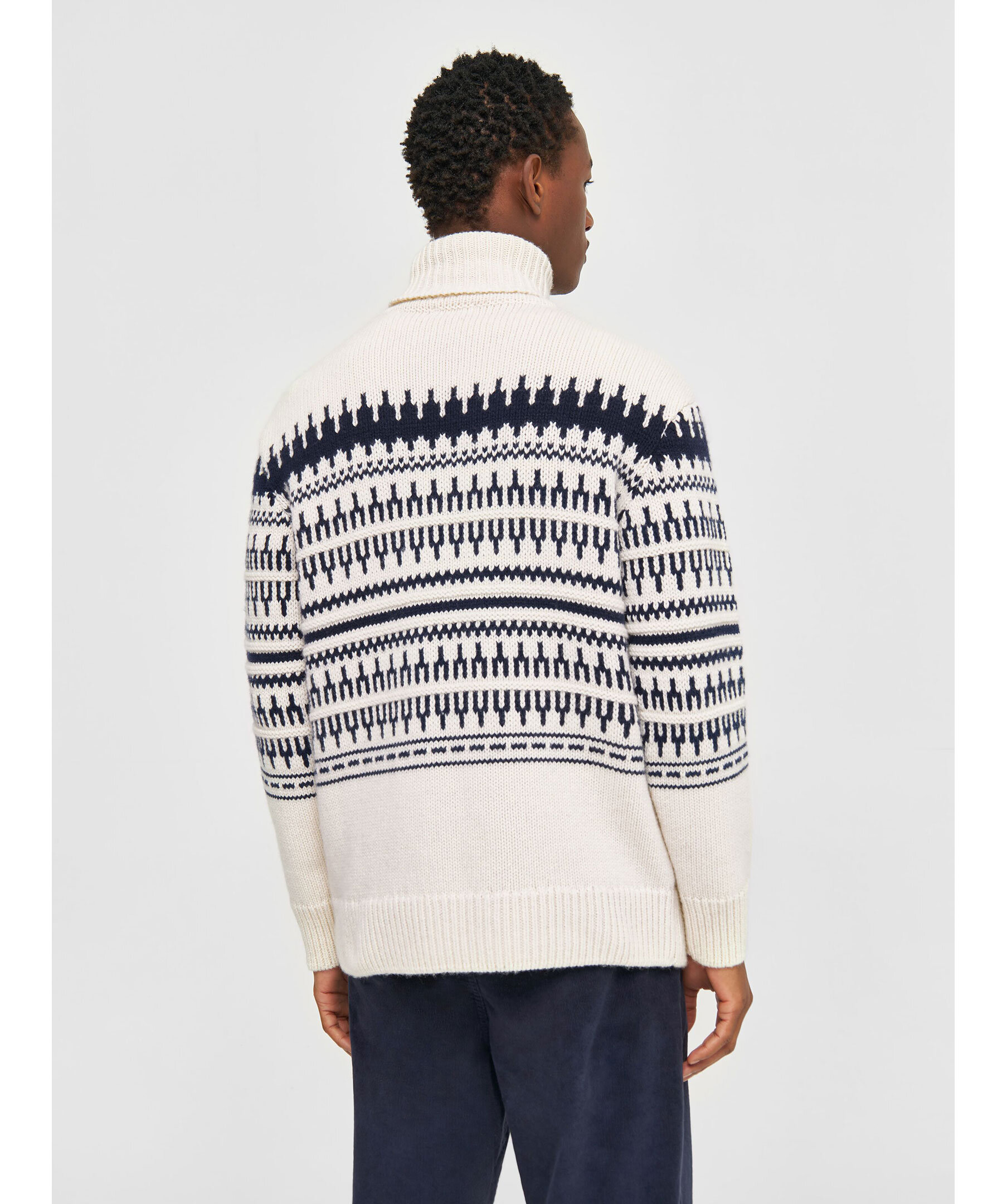 Vit och mörkblå mönstrad stickad tröja med polo från Knowledge cotton. Ribbstickad polokrage, muddar vid ärm- och plaggslut. Tillverkad i 100% Lammull.