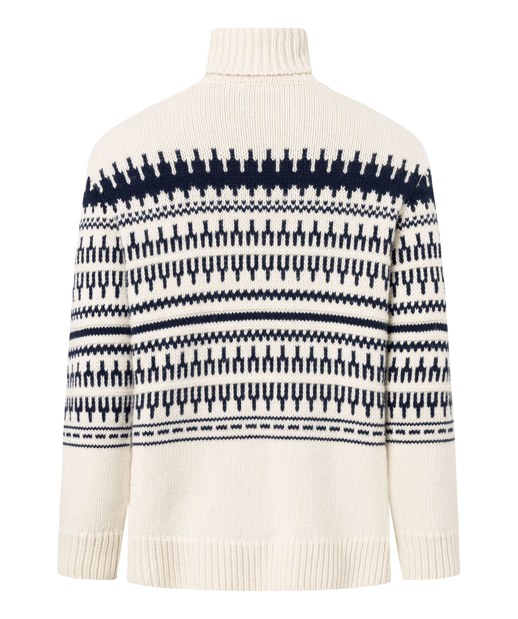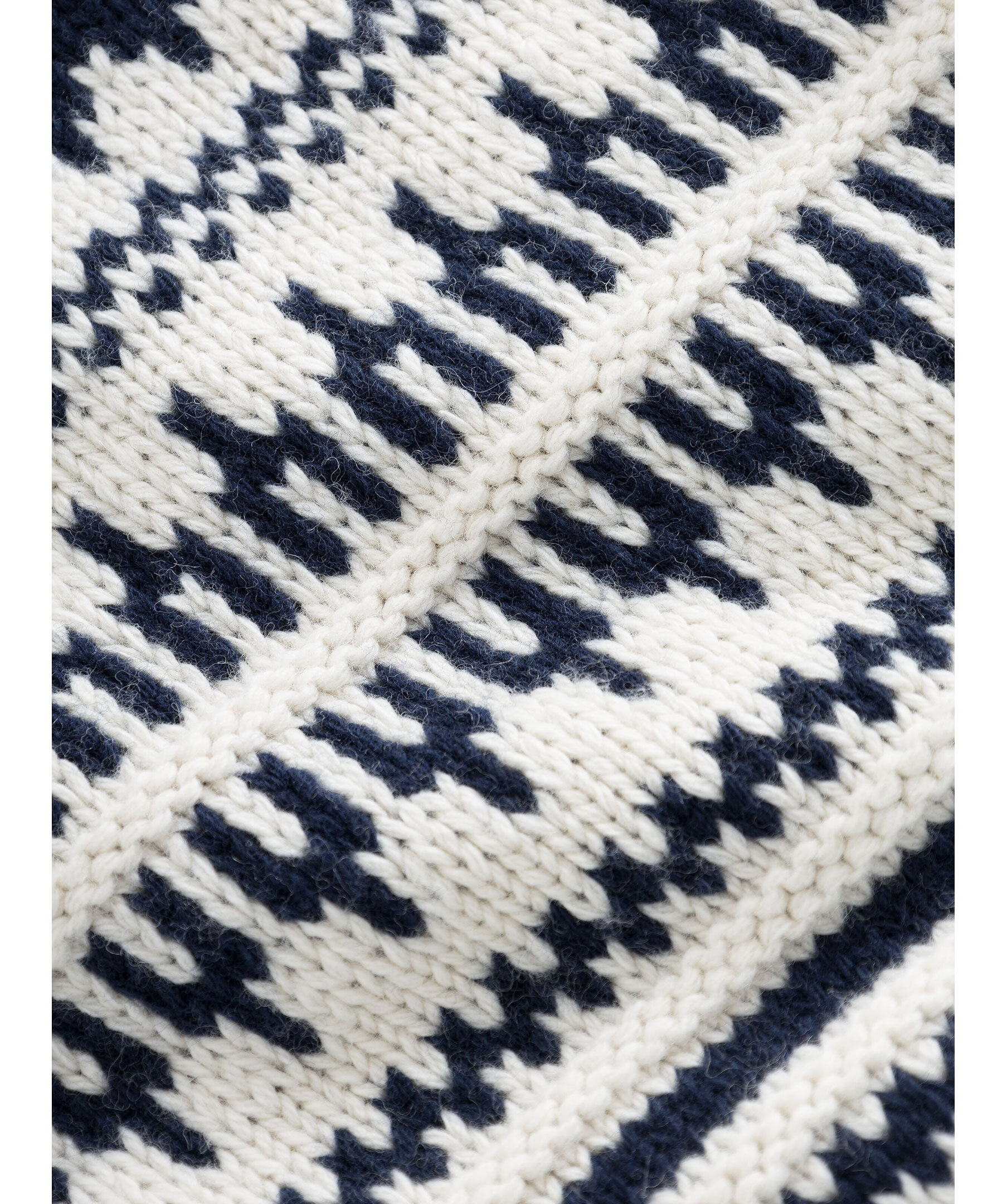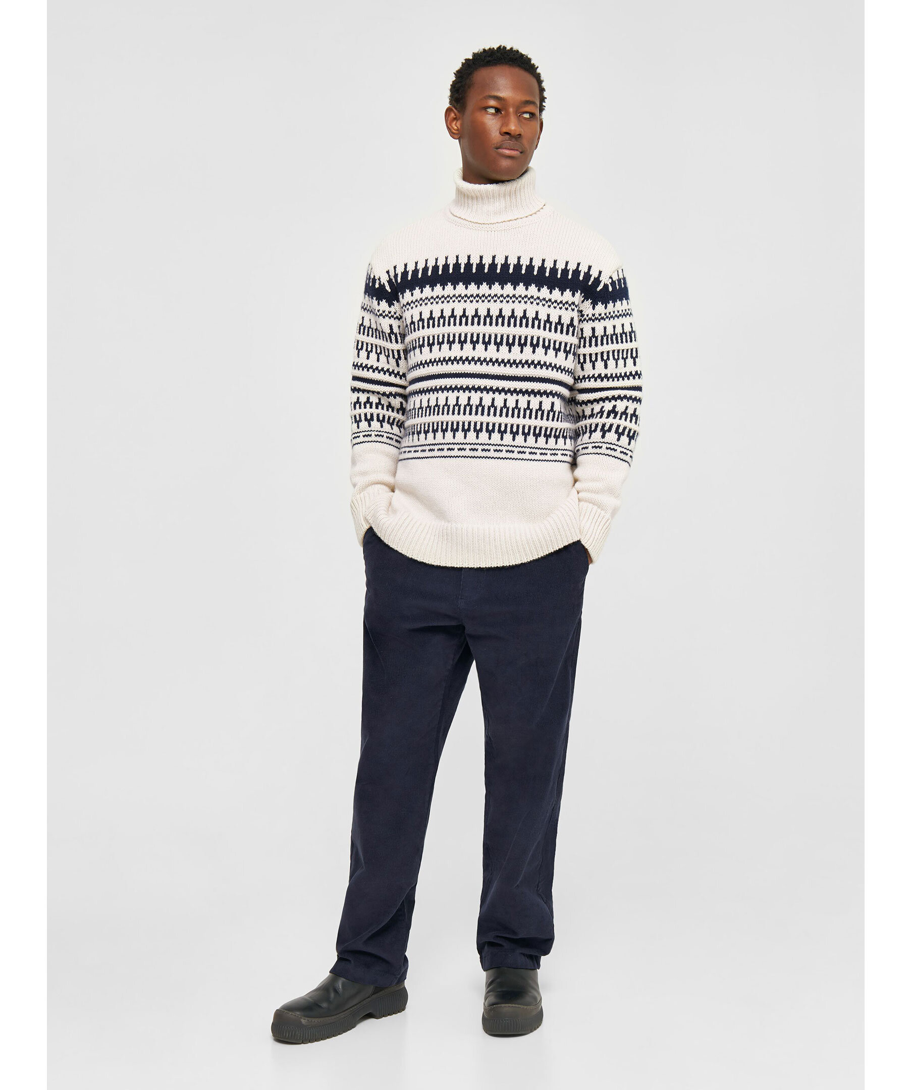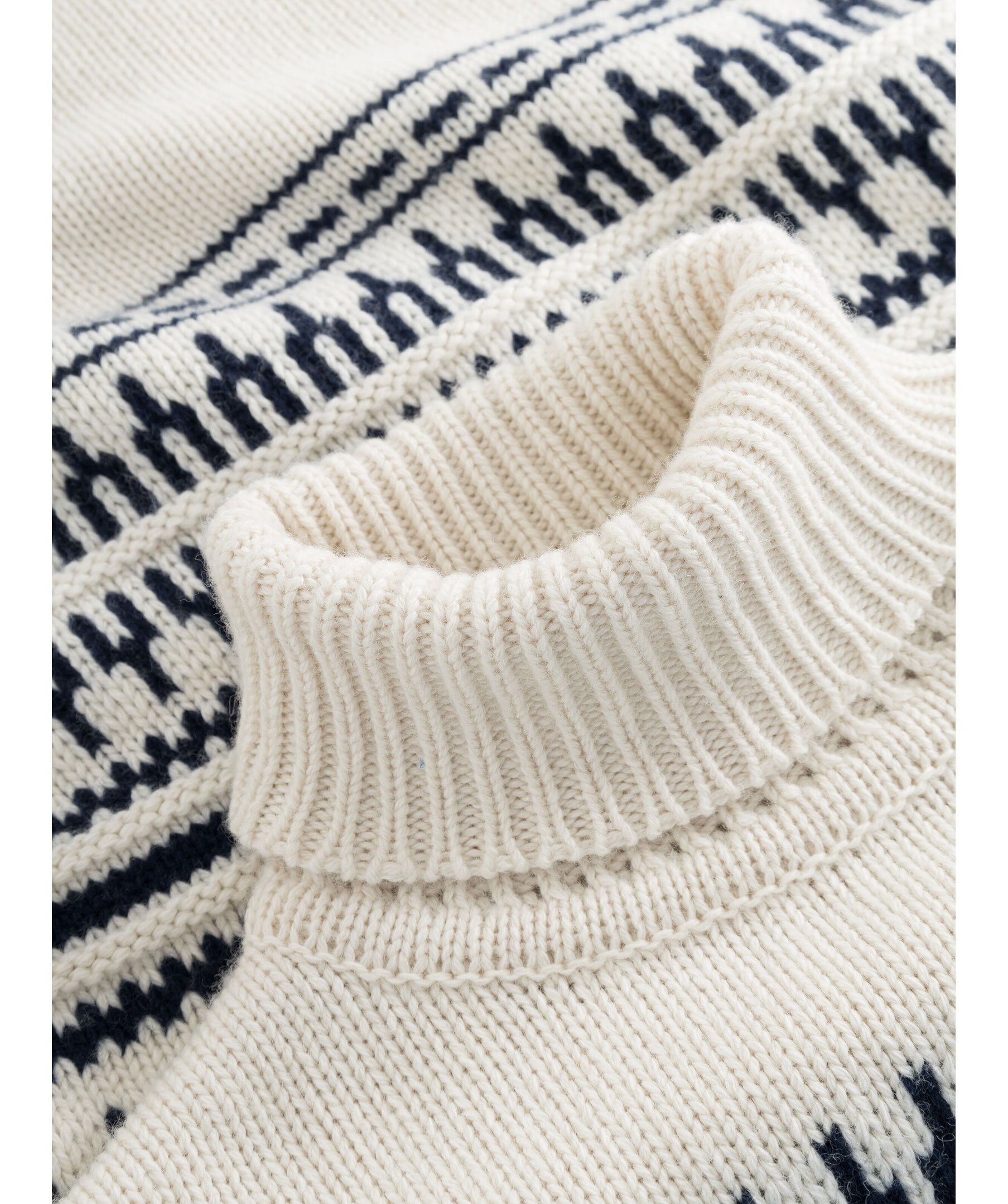 Vit och mörkblå mönstrad stickad tröja med polo från Knowledge cotton. Ribbstickad polokrage, muddar vid ärm- och plaggslut. Tillverkad i 100% Lammull.