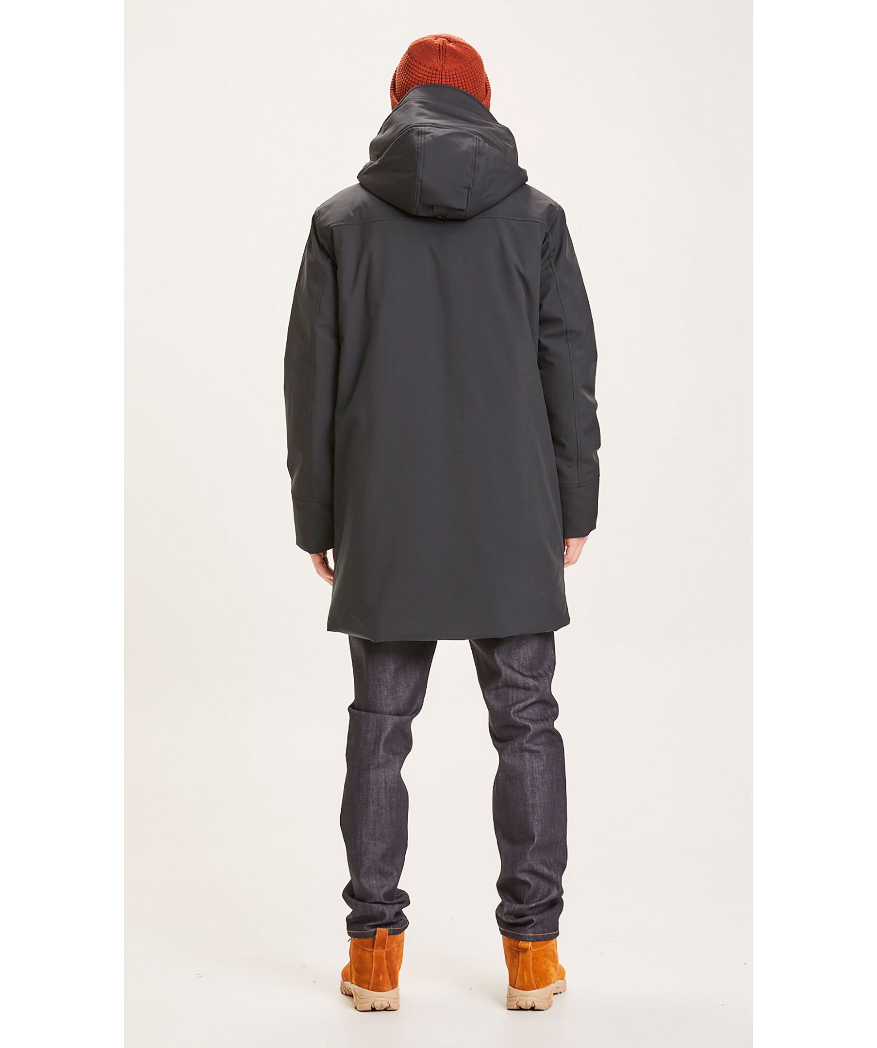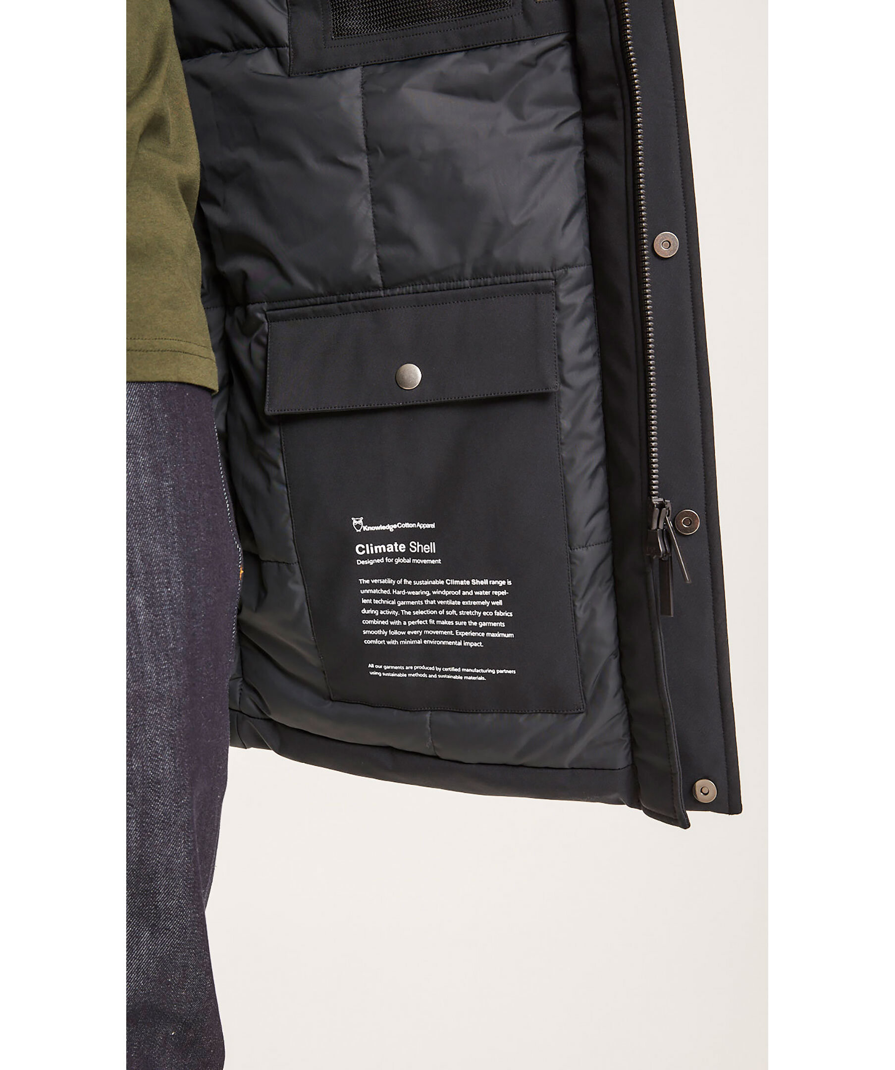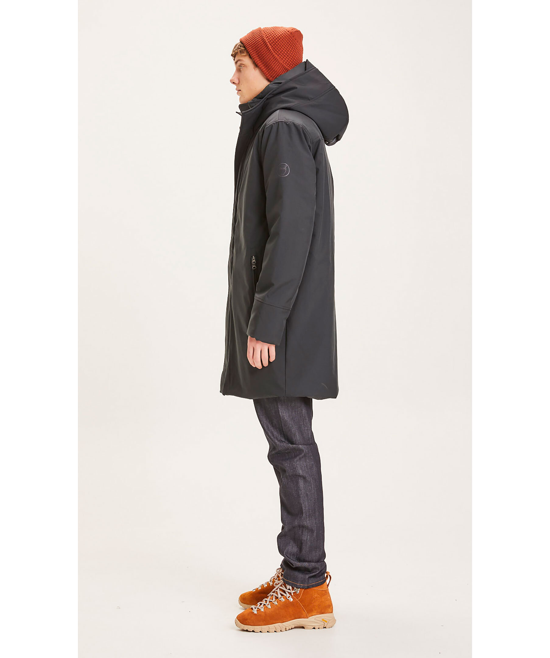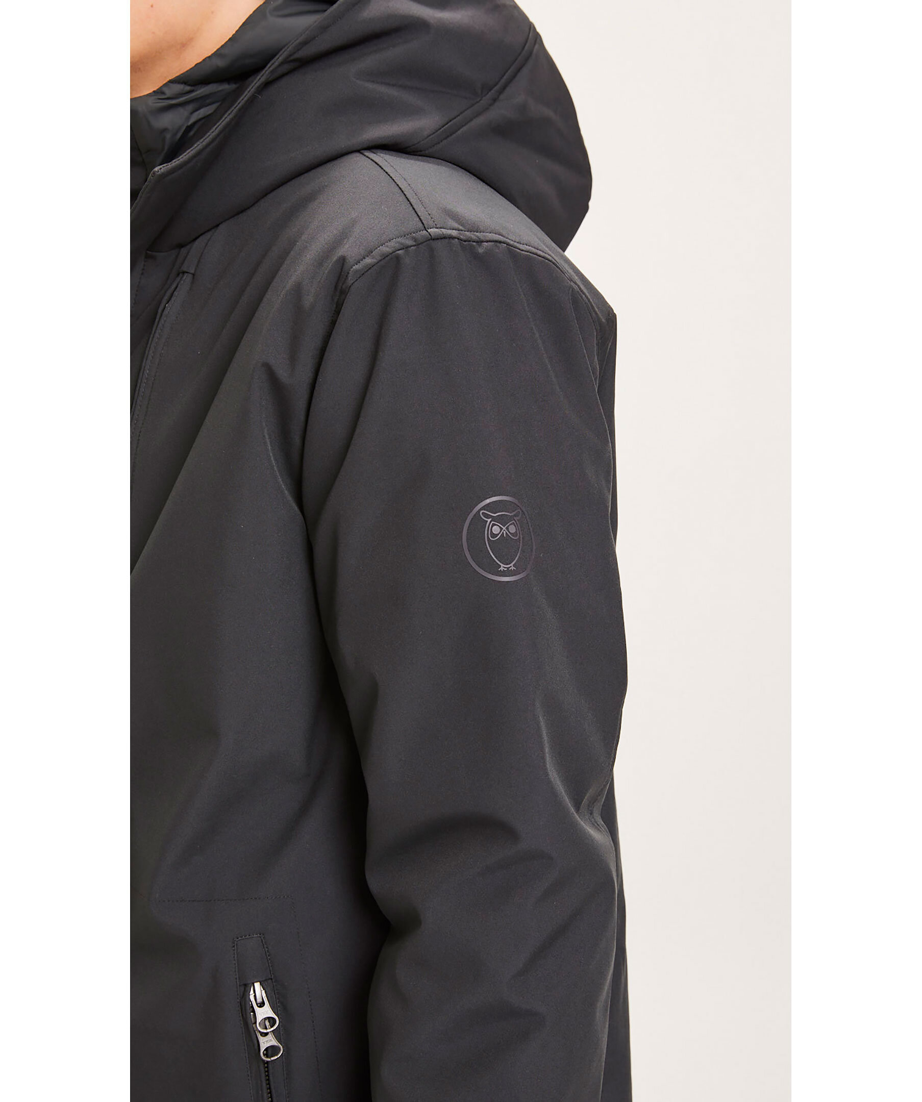 Svart parkas från Knowledge Cotton Apparel. Tillverkad i en teknisk organisk bomull blandad med återvunnen polyester. Hållbar softshell-konstruktion, med en vattentät och ogenomtränglig fuktbarriär så att du kan hålla dig helt torr. De lätta materialen hjälper till att reglera kroppstemperaturen och hålla dig bekväm. Tvåvägs dragkedja och dold magnetisk knäppstängning framtill. Två framfickor med tvåvägsdragkedja, en bröstficka med dragkedja och tre innerfickor med dragkedja och tryckknapp. Vattentät (5000 mm), andas (5000/gr/m2 24h) och vindtät. Tryckt, svart logotyp på vänster ärm.