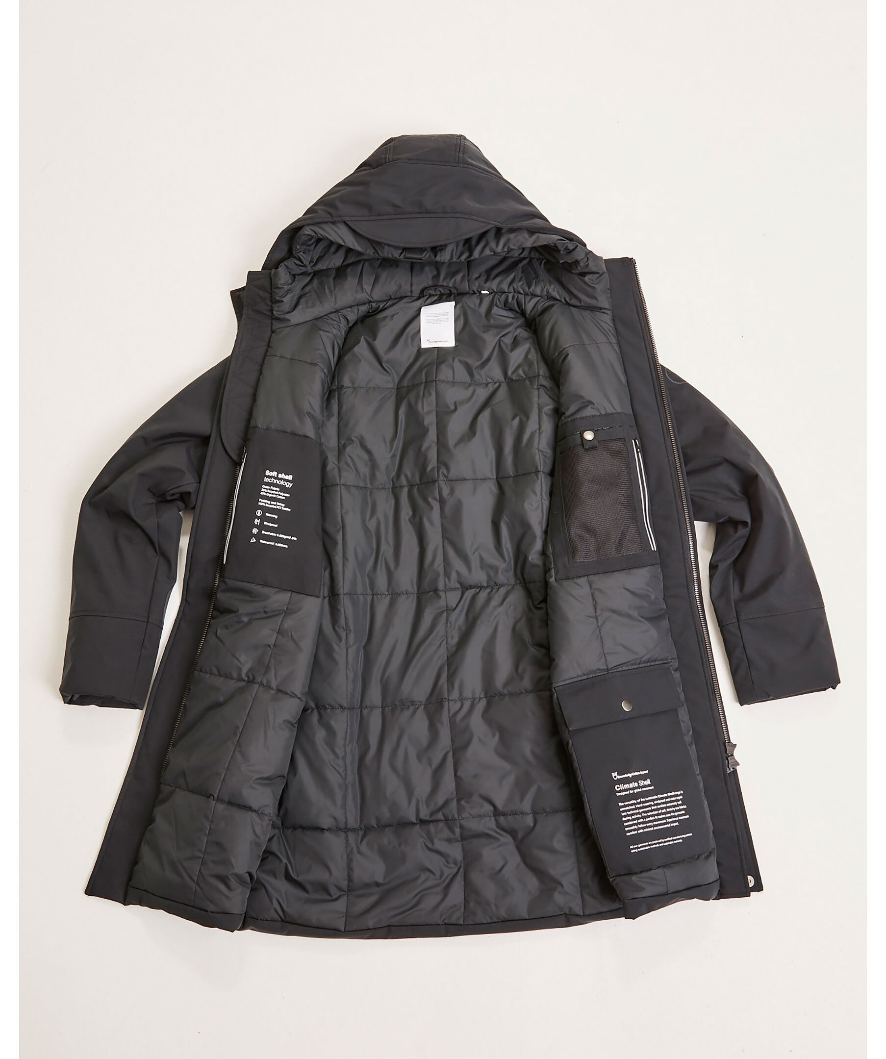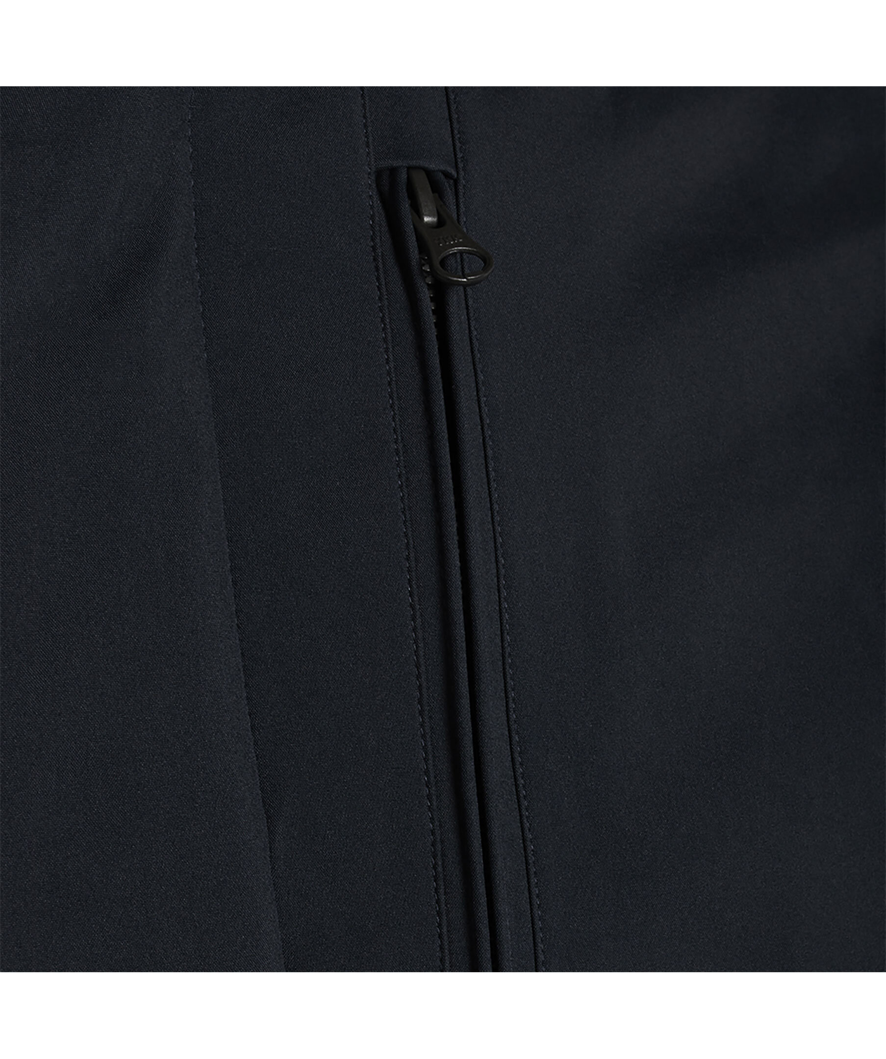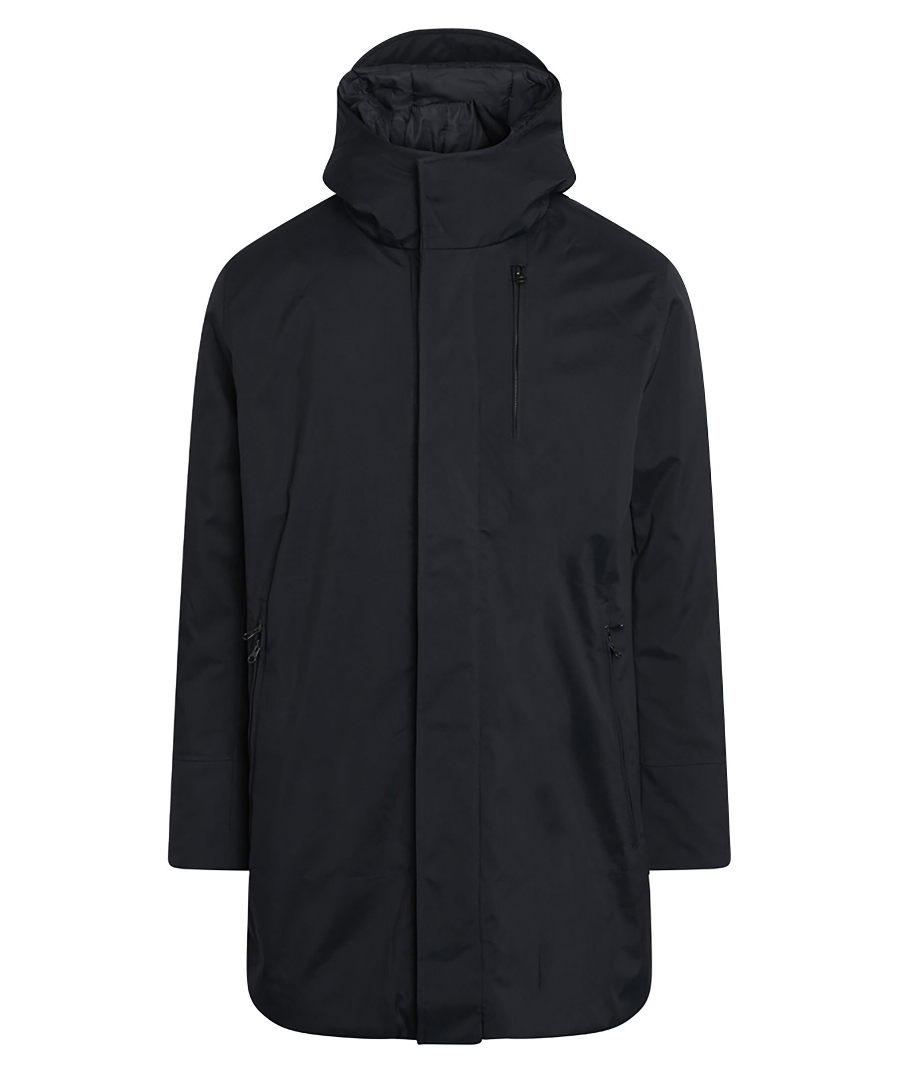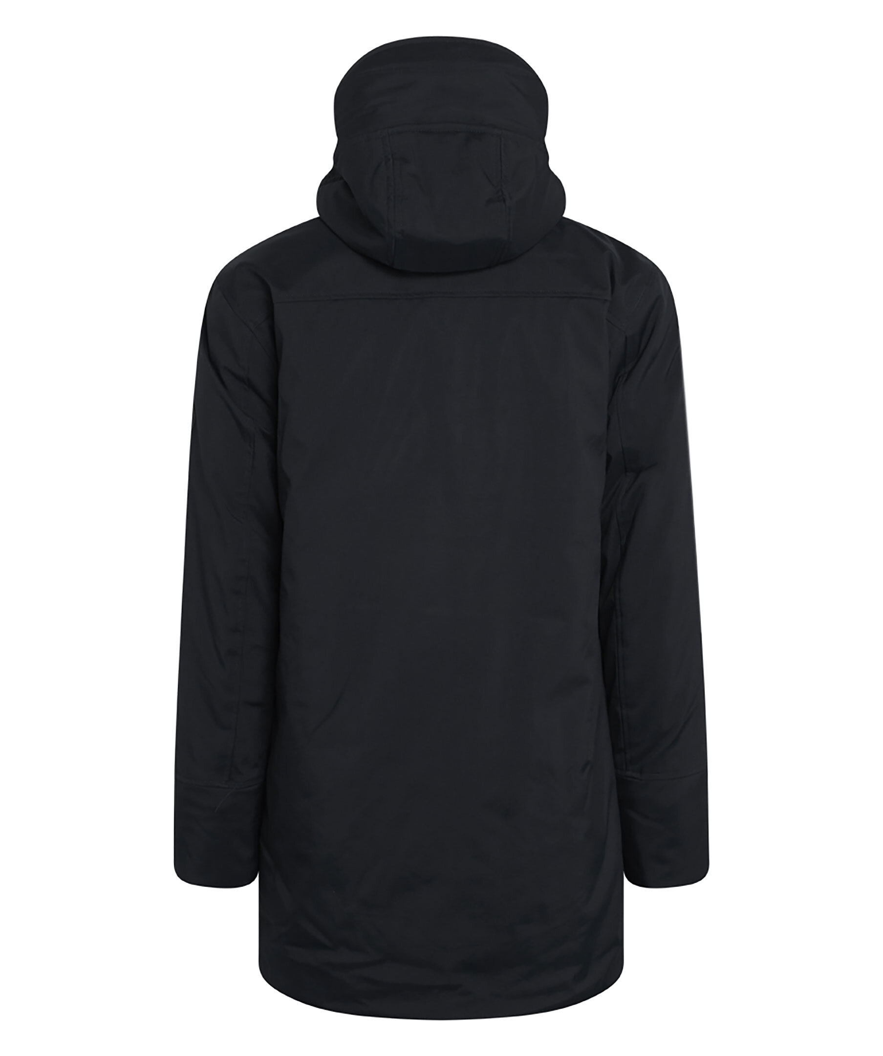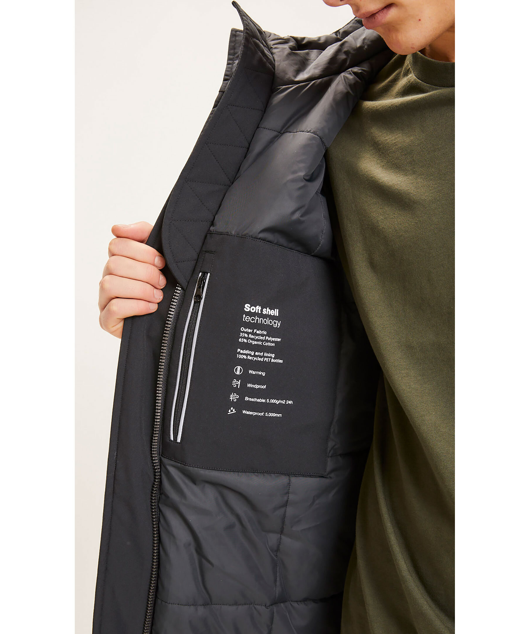 Svart parkas från Knowledge Cotton Apparel. Tillverkad i en teknisk organisk bomull blandad med återvunnen polyester. Hållbar softshell-konstruktion, med en vattentät och ogenomtränglig fuktbarriär så att du kan hålla dig helt torr. De lätta materialen hjälper till att reglera kroppstemperaturen och hålla dig bekväm. Tvåvägs dragkedja och dold magnetisk knäppstängning framtill. Två framfickor med tvåvägsdragkedja, en bröstficka med dragkedja och tre innerfickor med dragkedja och tryckknapp. Vattentät (5000 mm), andas (5000/gr/m2 24h) och vindtät. Tryckt, svart logotyp på vänster ärm.