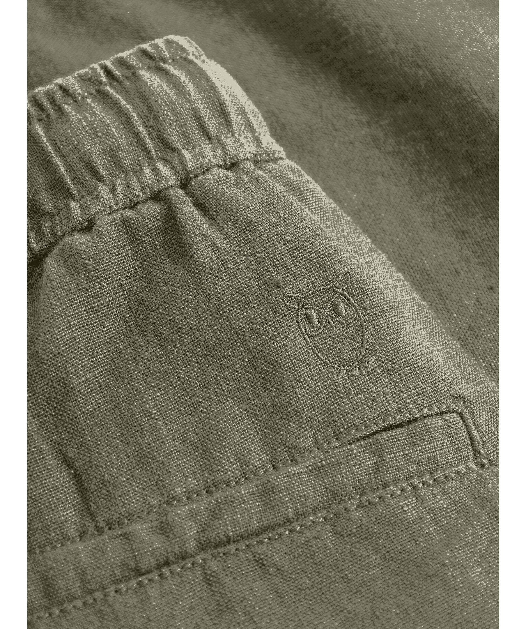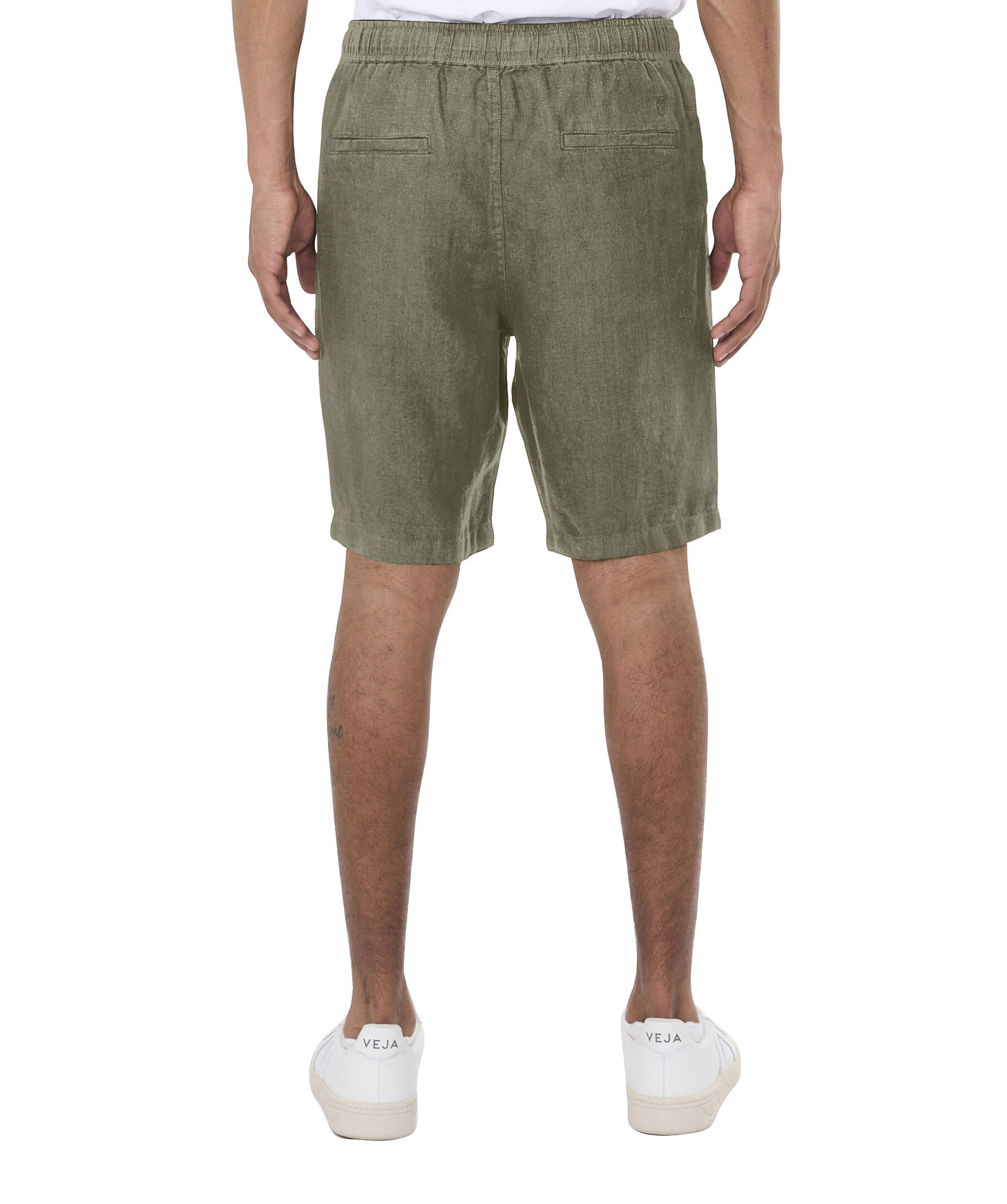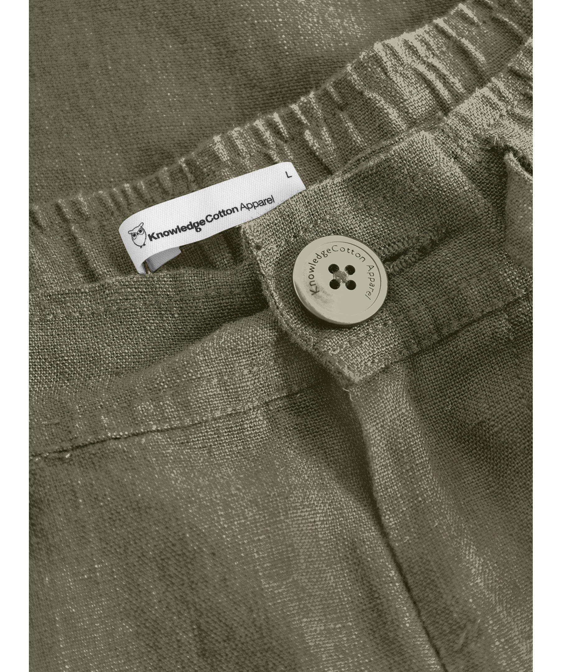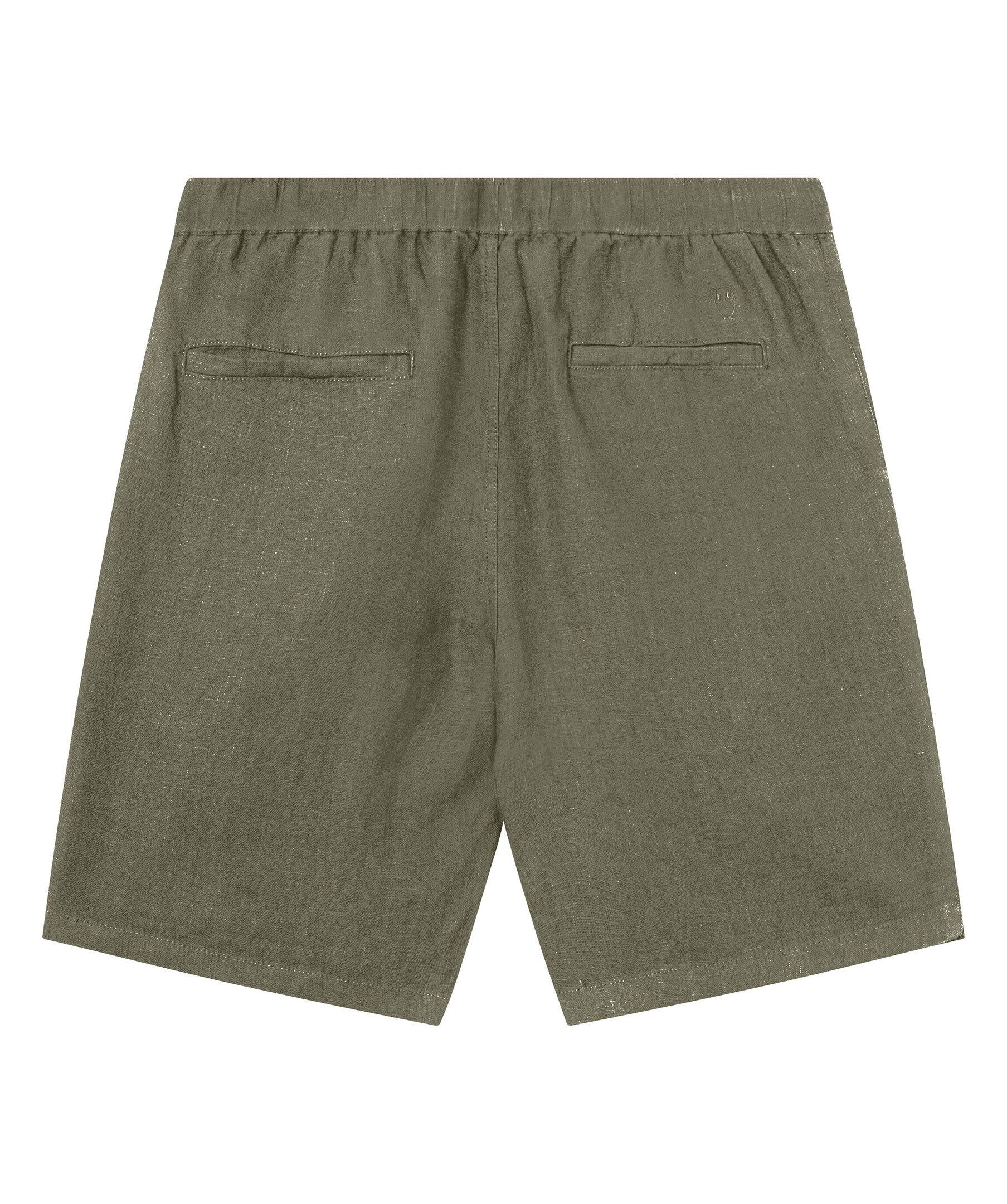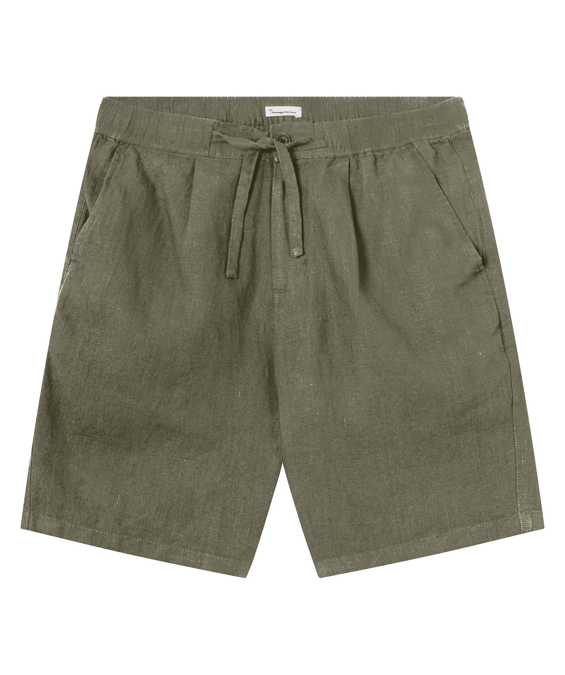 Olivgröna linneshorts från Knowledge Cotton. Tillverkad i 100% ekologisk linne. Rak passform med elastisk midja samt snörning i midjan. Två sidofickor och diskreta bakfickor.