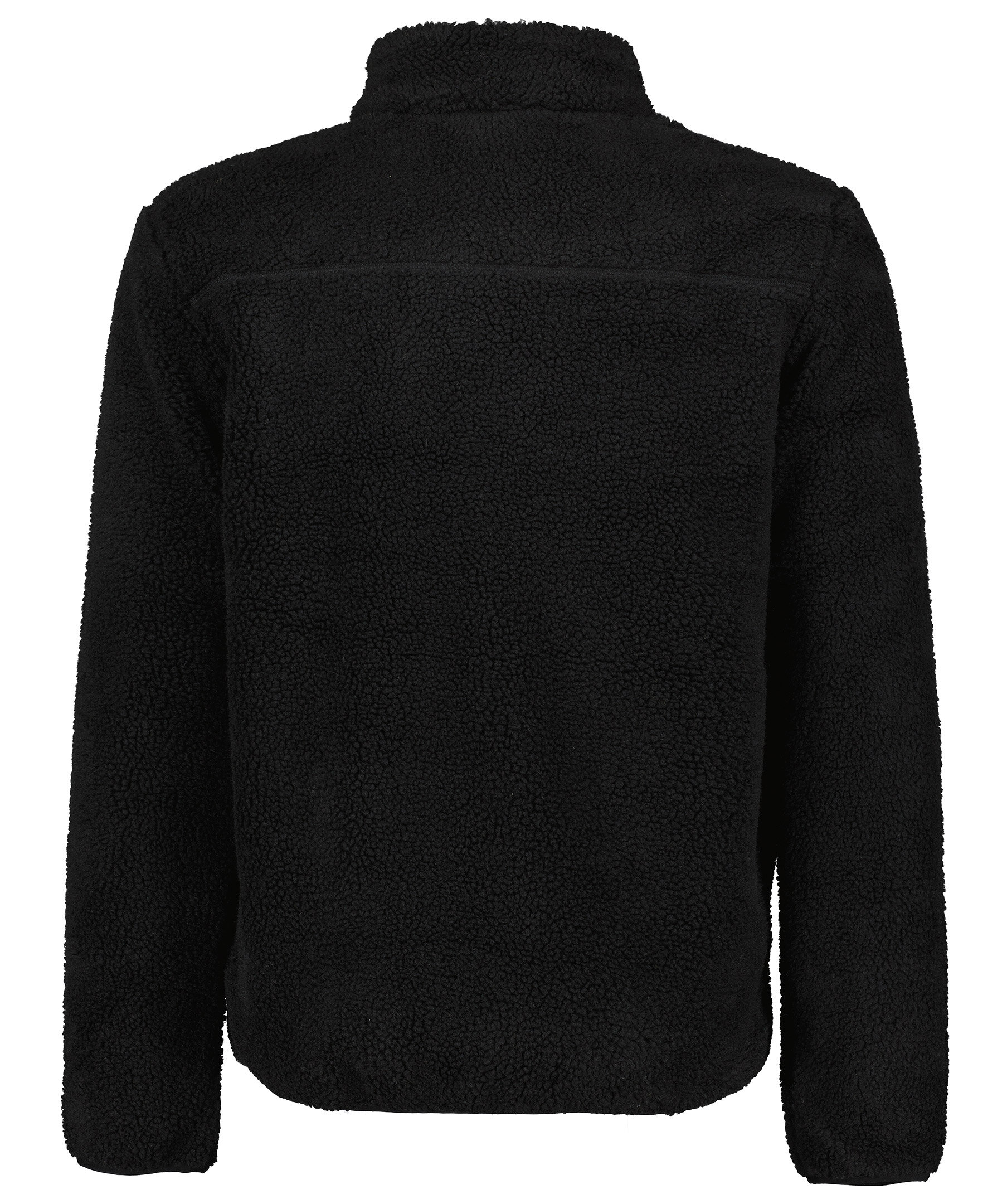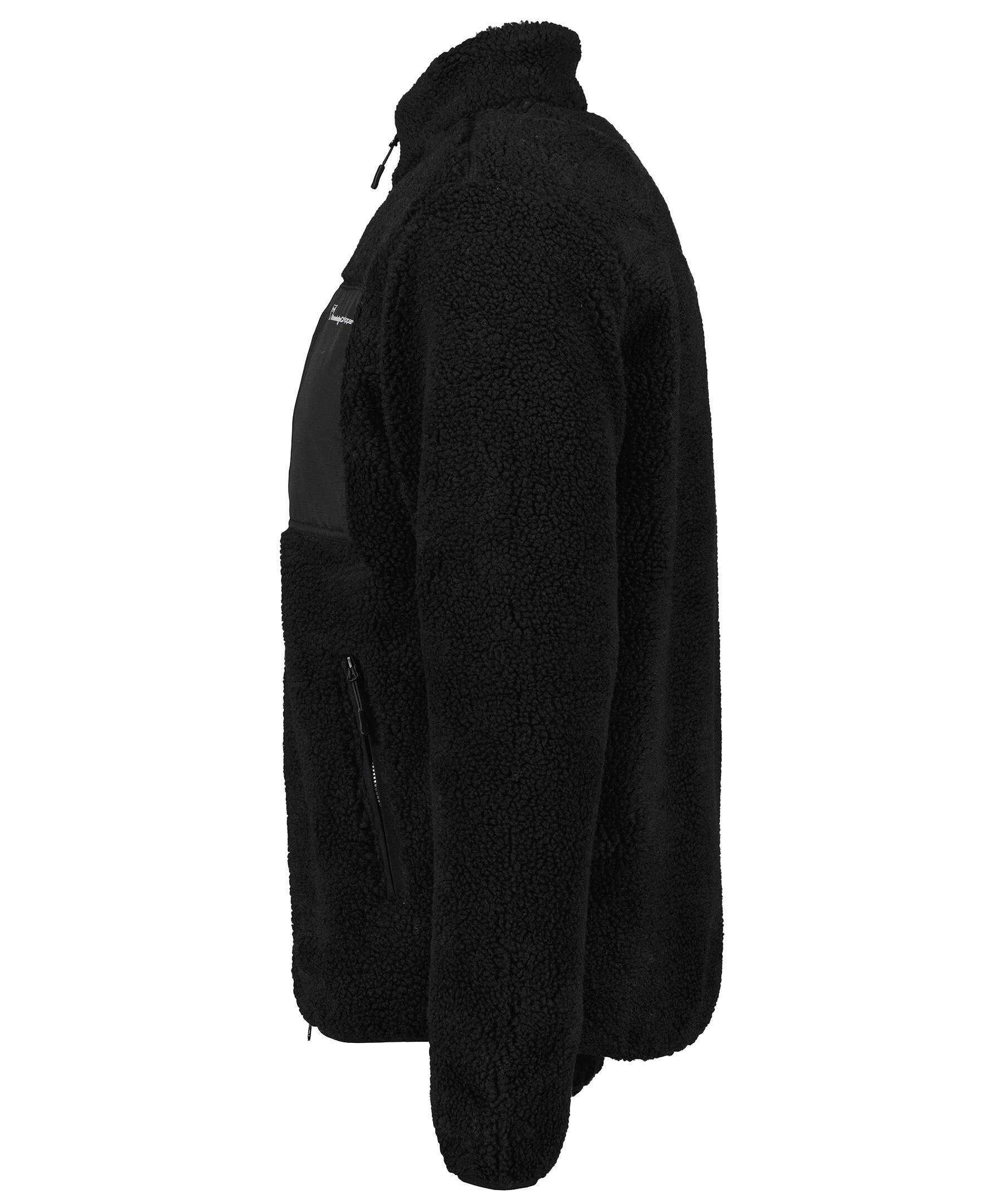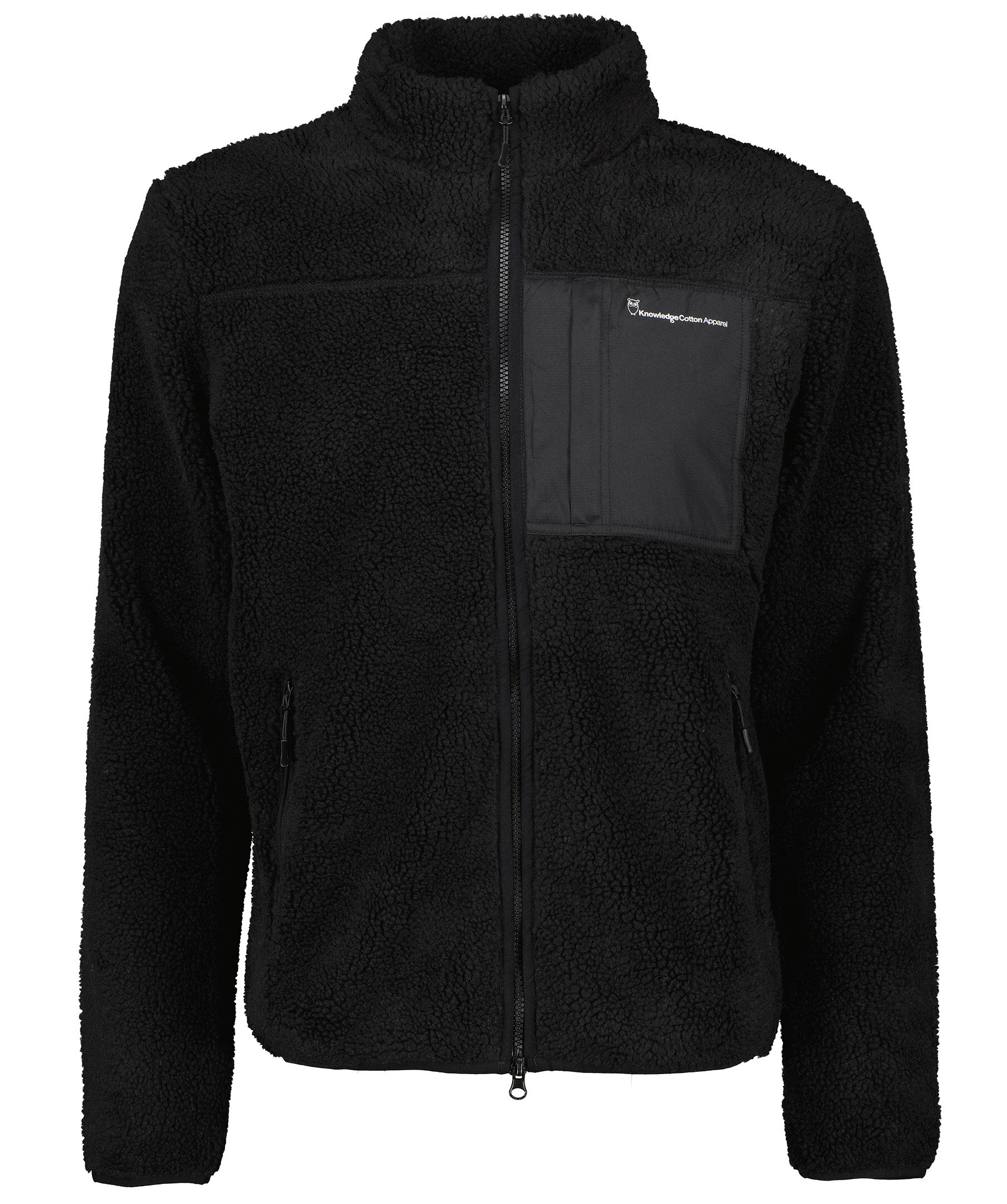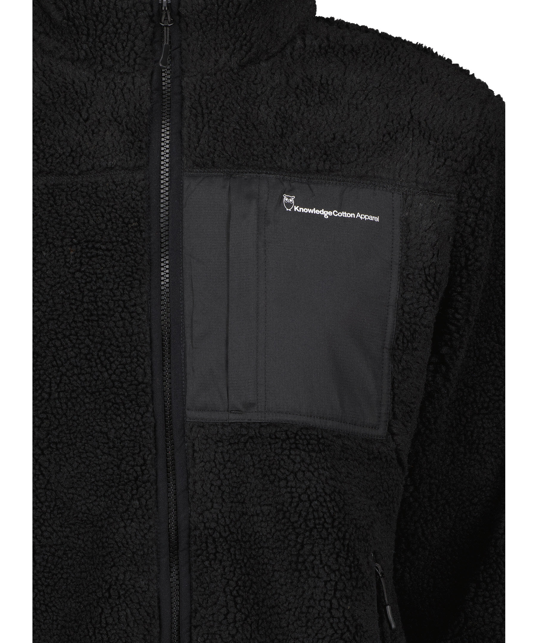 Svart fleecetröja från KnowledgeCotton Apparel. Tröjan har en stor svart bröstficka med en vit logotyp och två framfickor med dragkedja. Västen har en hög krage och stängs med en tvåvägsdragkedja. Svart meshfoder på insidan. Tunna svarta elastiska muddar vid ärm och plaggslut.