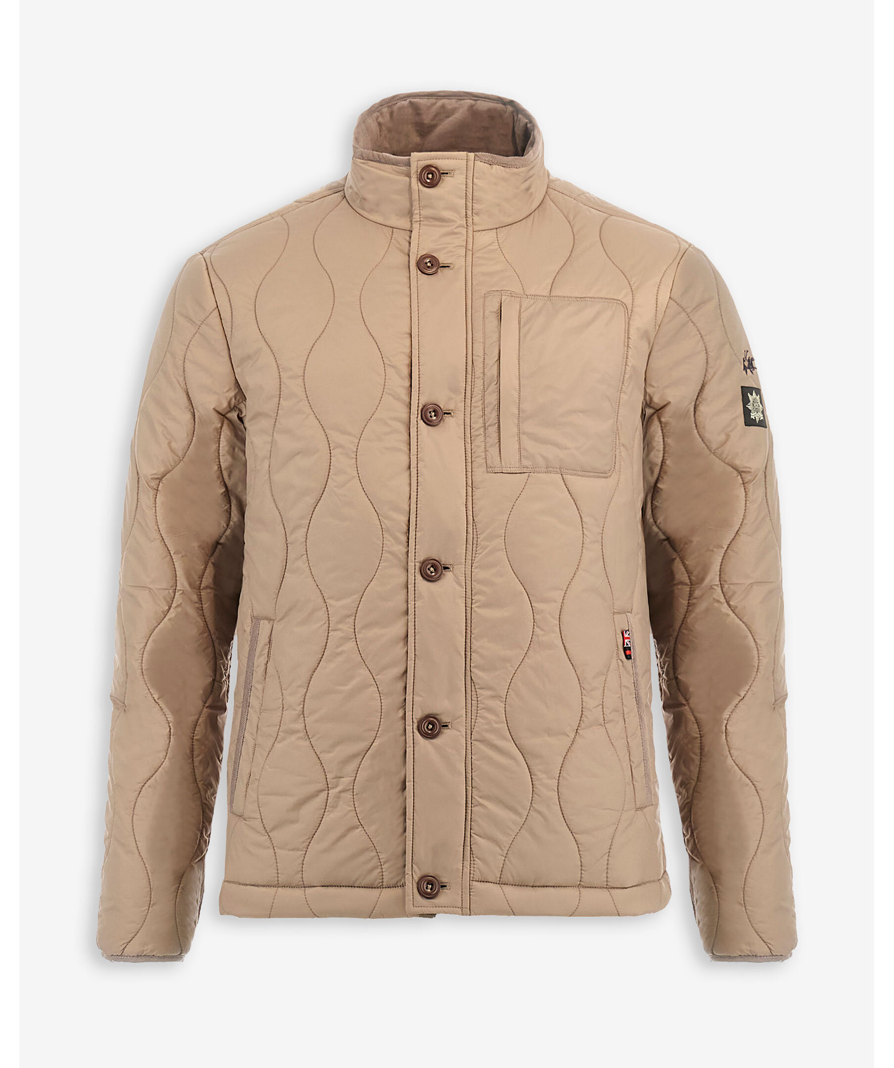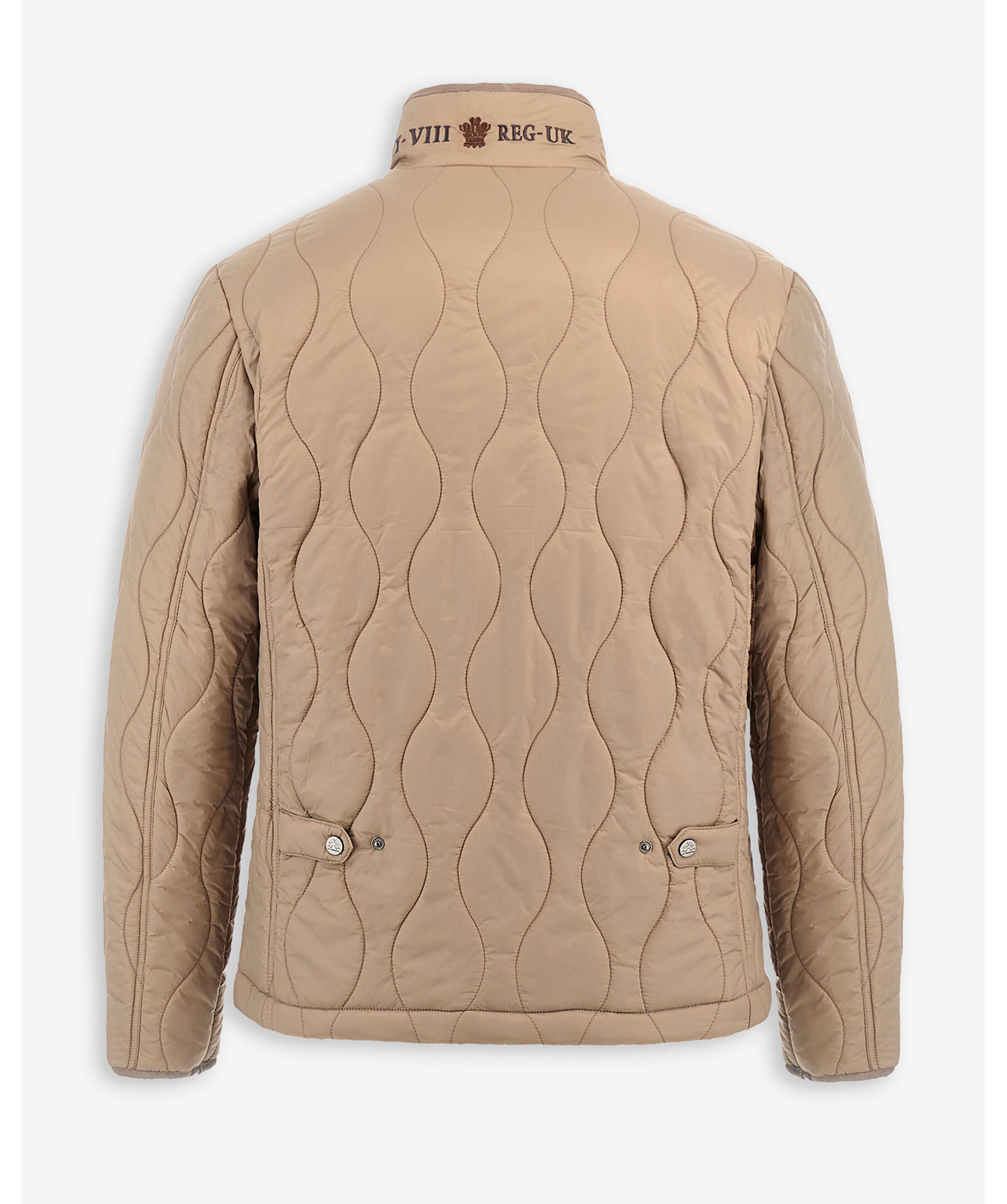 Jacka i quiltat nylontyg med hög krage från La Martina. Jackan har frontstängning med både specialdesignad dragkedja och stora knappar i konstläder för en klassisk look. Insidan är helfodrad med tvåfärgat, randigt polyestertyg och detaljer i kontrastfärg vid fickor, kanter och nackparti. Designen är ren och genomtänkt, med bröstficka med dragkedja, vertikala sidofickor och justerbara remmar baktill med metallknappar. Ärmarna pryds av logopatchar, medan kragen har broderad text i flera färger.