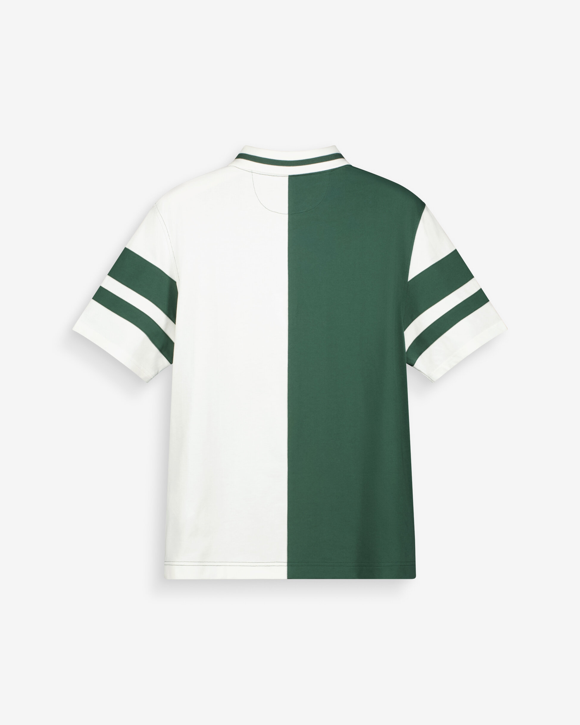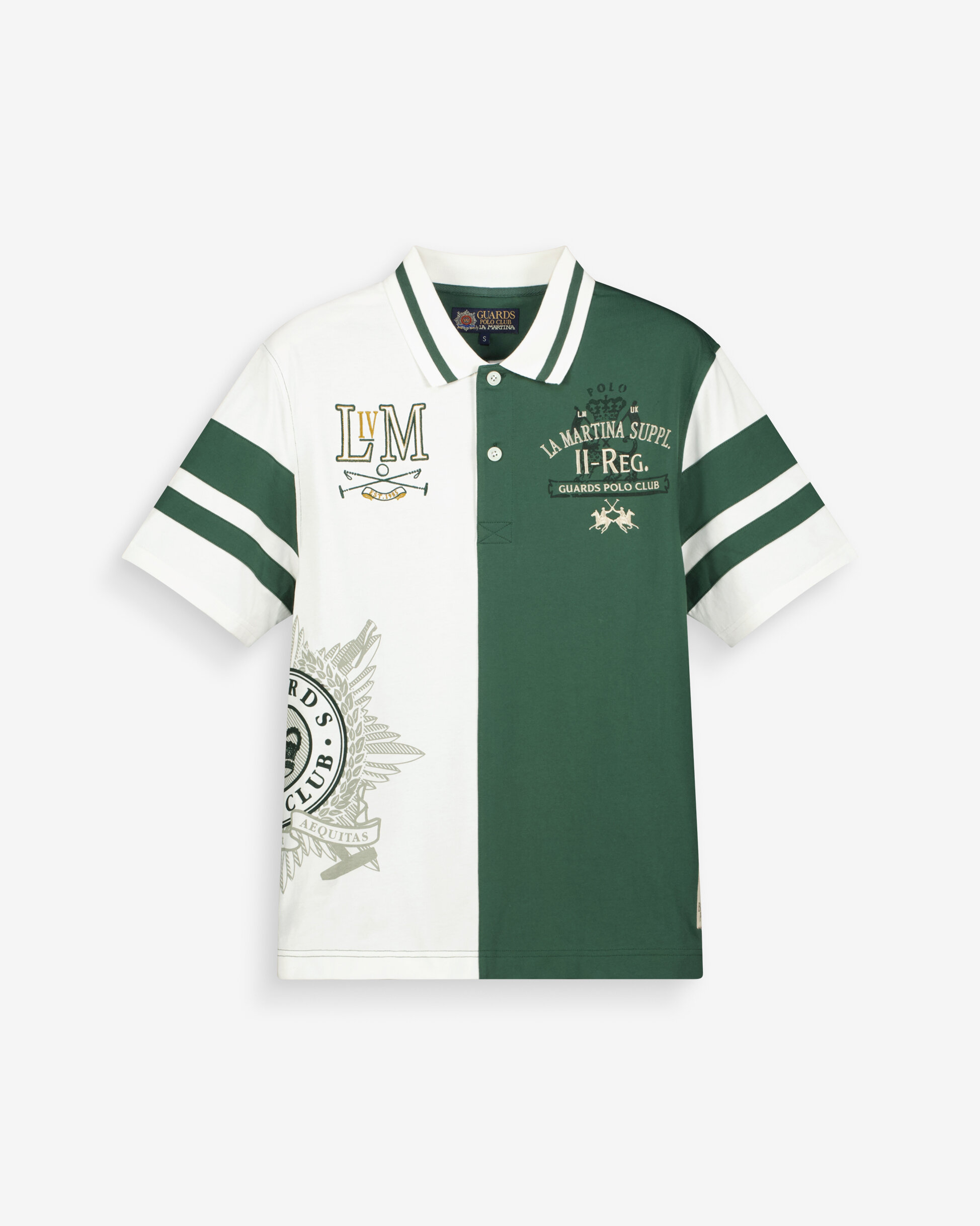 Kortärmad pikétröja från La Martina i kraftig bomullsjersey. Den tvåfärgade designen i cream och skogsgrönt skapar ett tydligt color-block-mönster, medan kontrasterande ränder på ärmarna ger extra visuellt djup. Modellen har modern, generös passform med nedhasade axlar och vida ärmar, samt detaljer som ribbad krage med kontrastkant, heraldikinspirerade tryck och broderade logotyper som ger ett uttrycksfullt, arkivinspirerat helhetsintryck.