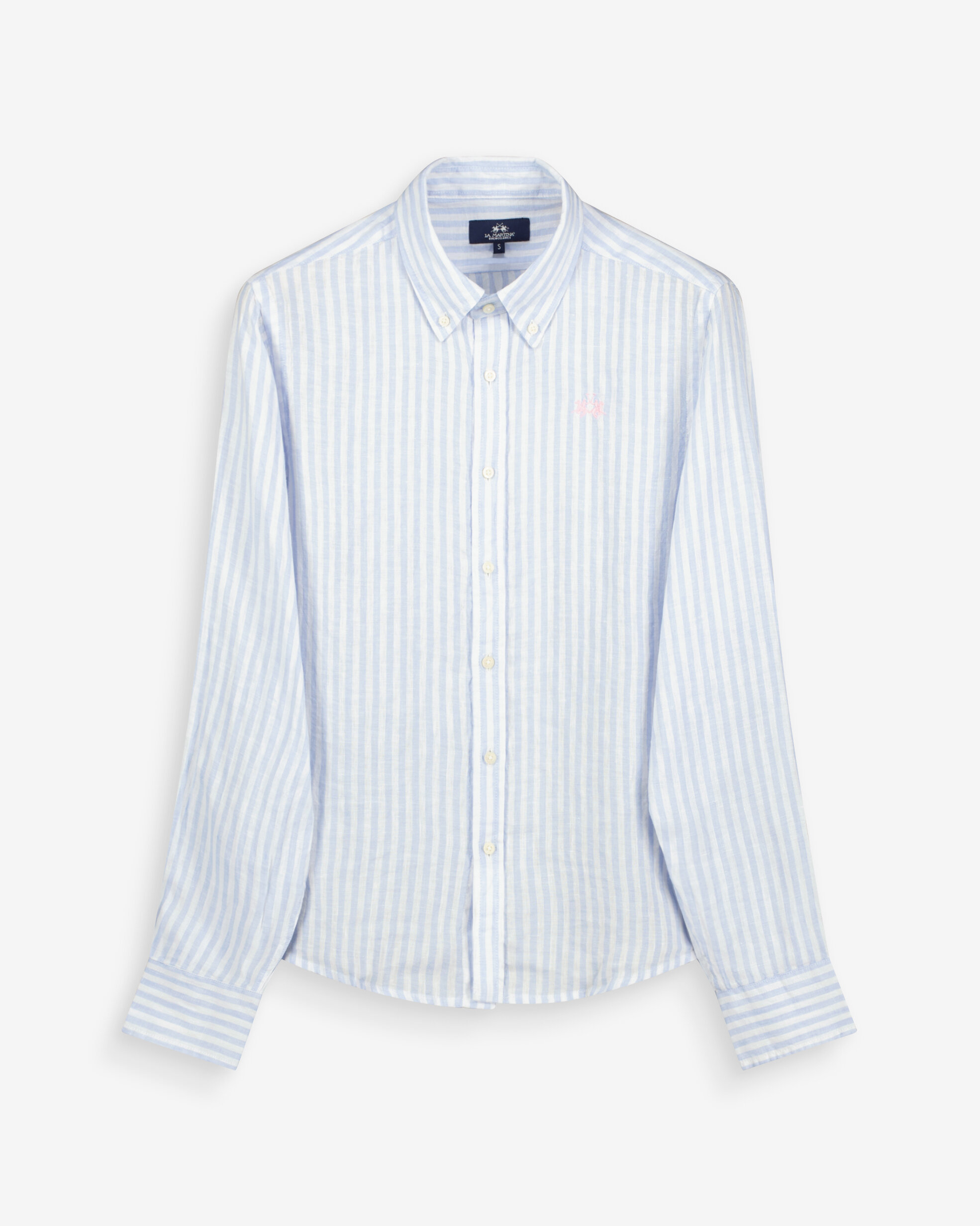 Randig linneskjorta från La Martina med button down-krage och en diskret broderad kontrastlogotyp på bröstet sätter en elegant signatur.