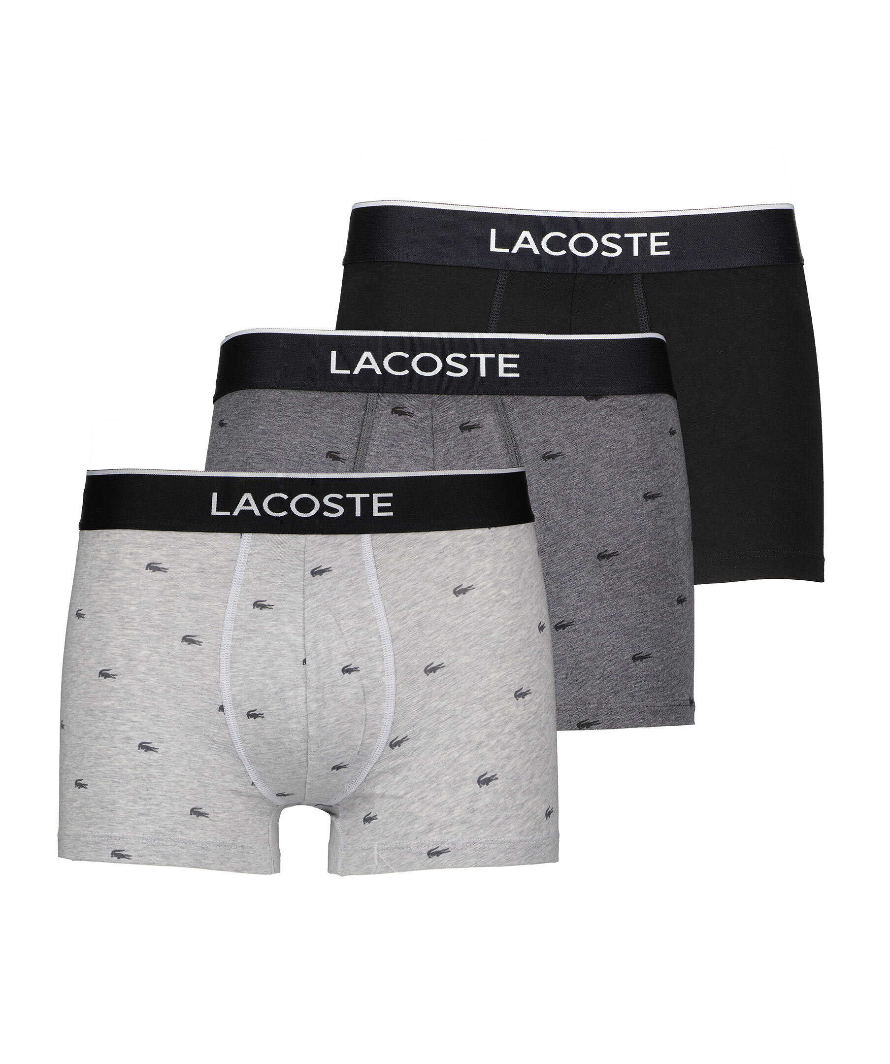 Svarta, Gråa och Mörkgråa kalsonger från Lacoste. Svart elastisk resår i midjan med logotyper. Tillverkad i Bomullsblandning.