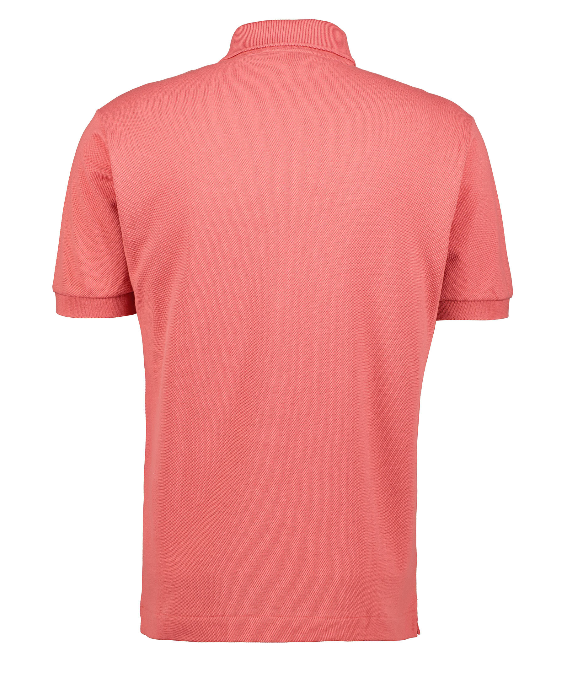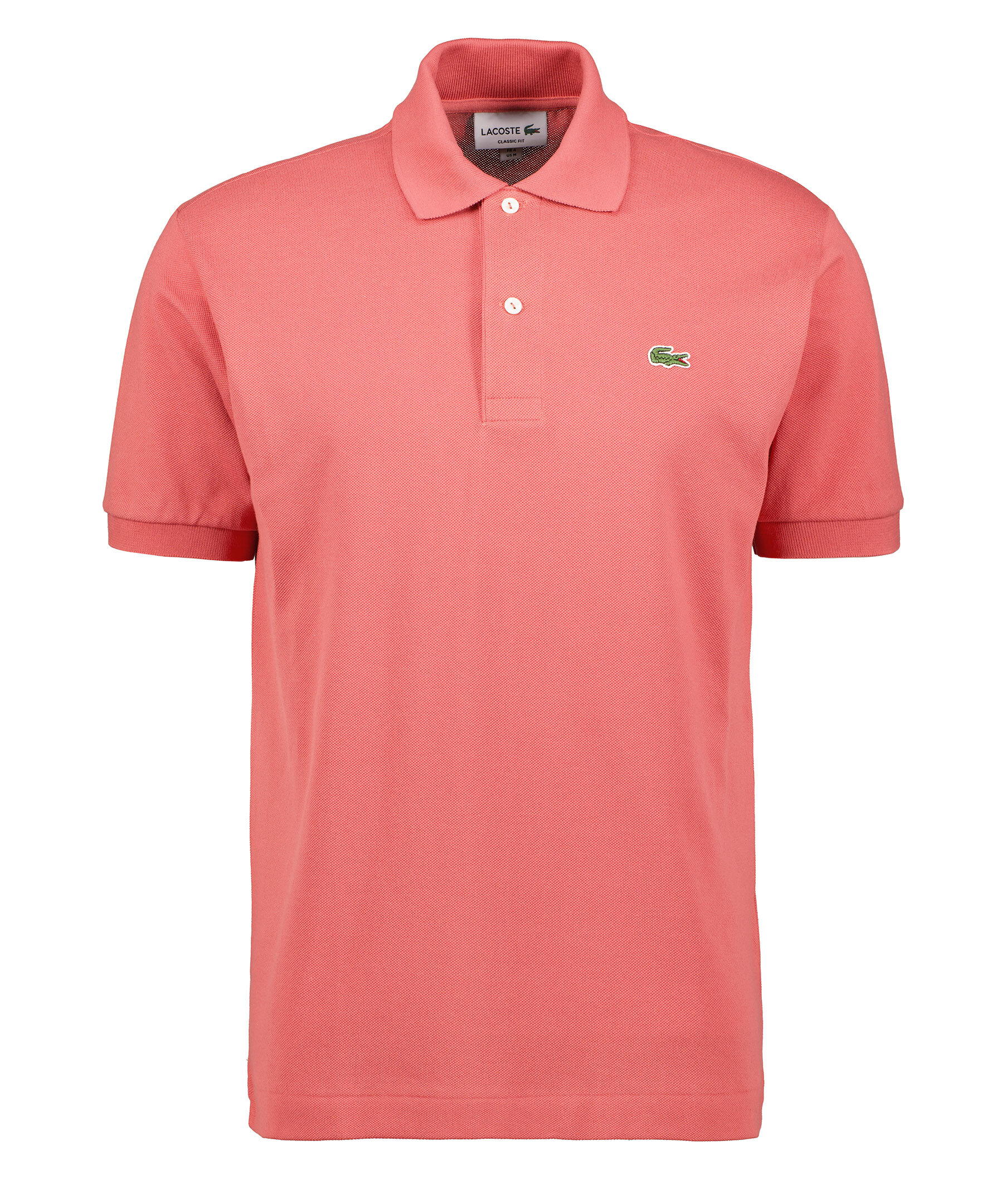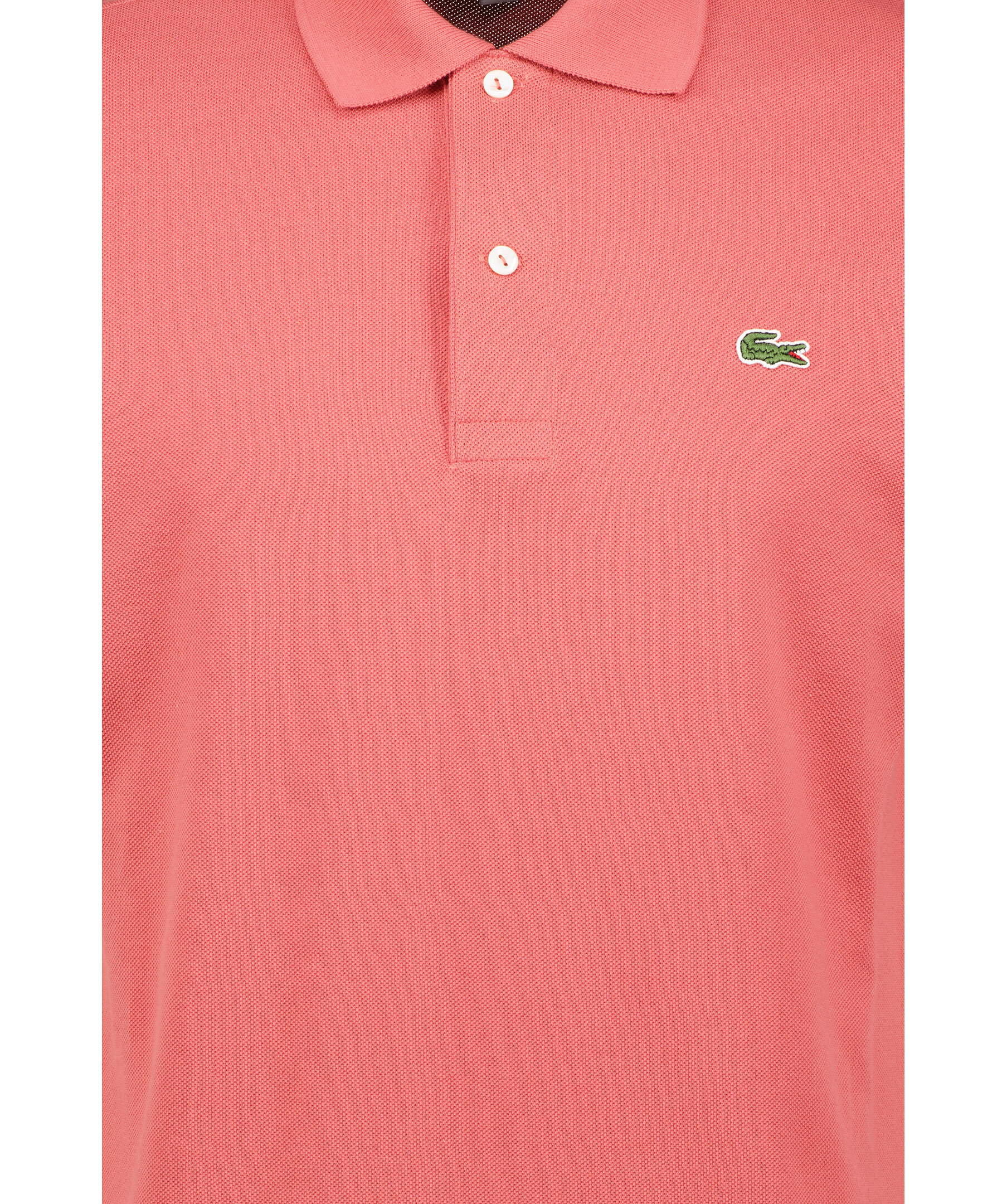 Korallröd pikétröja från Lacoste. Tillverkad i 100% Bomull. Broderad logotyp på bröstet, två knappar fram, spetsig krage och korta slitsar i sidorna.