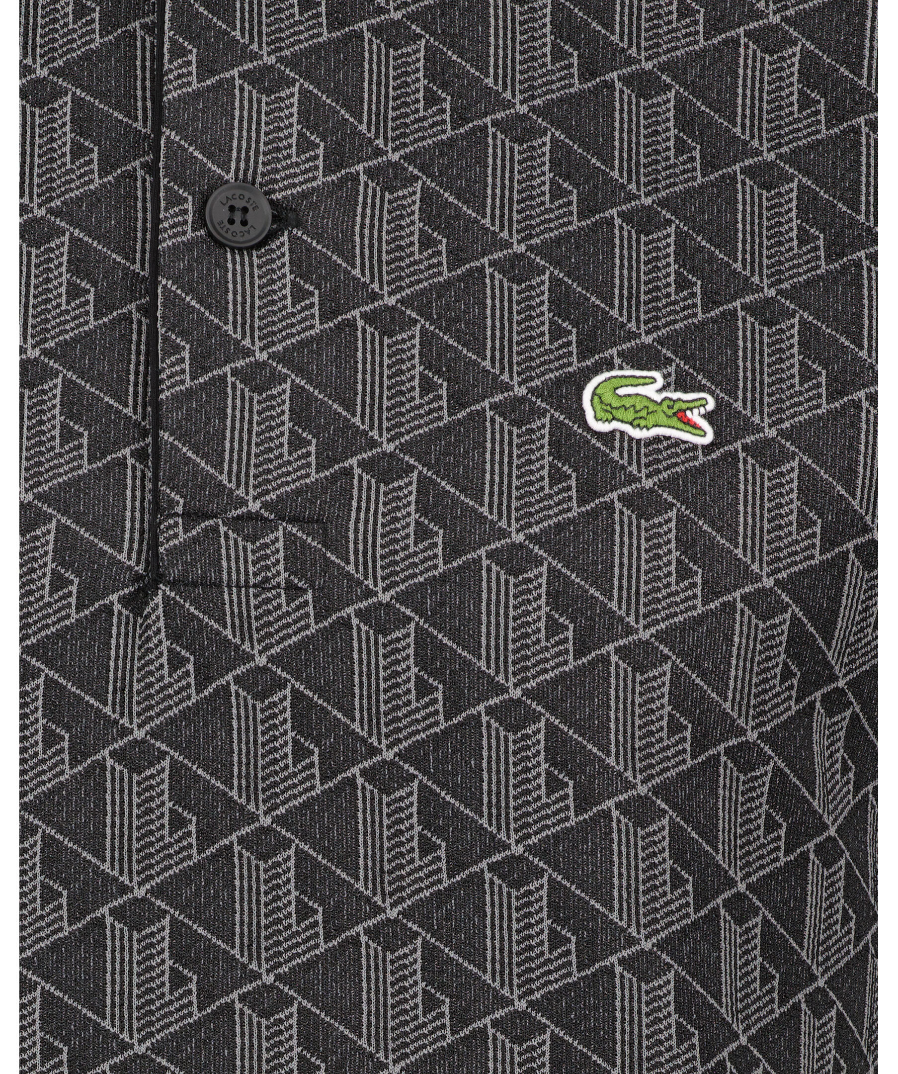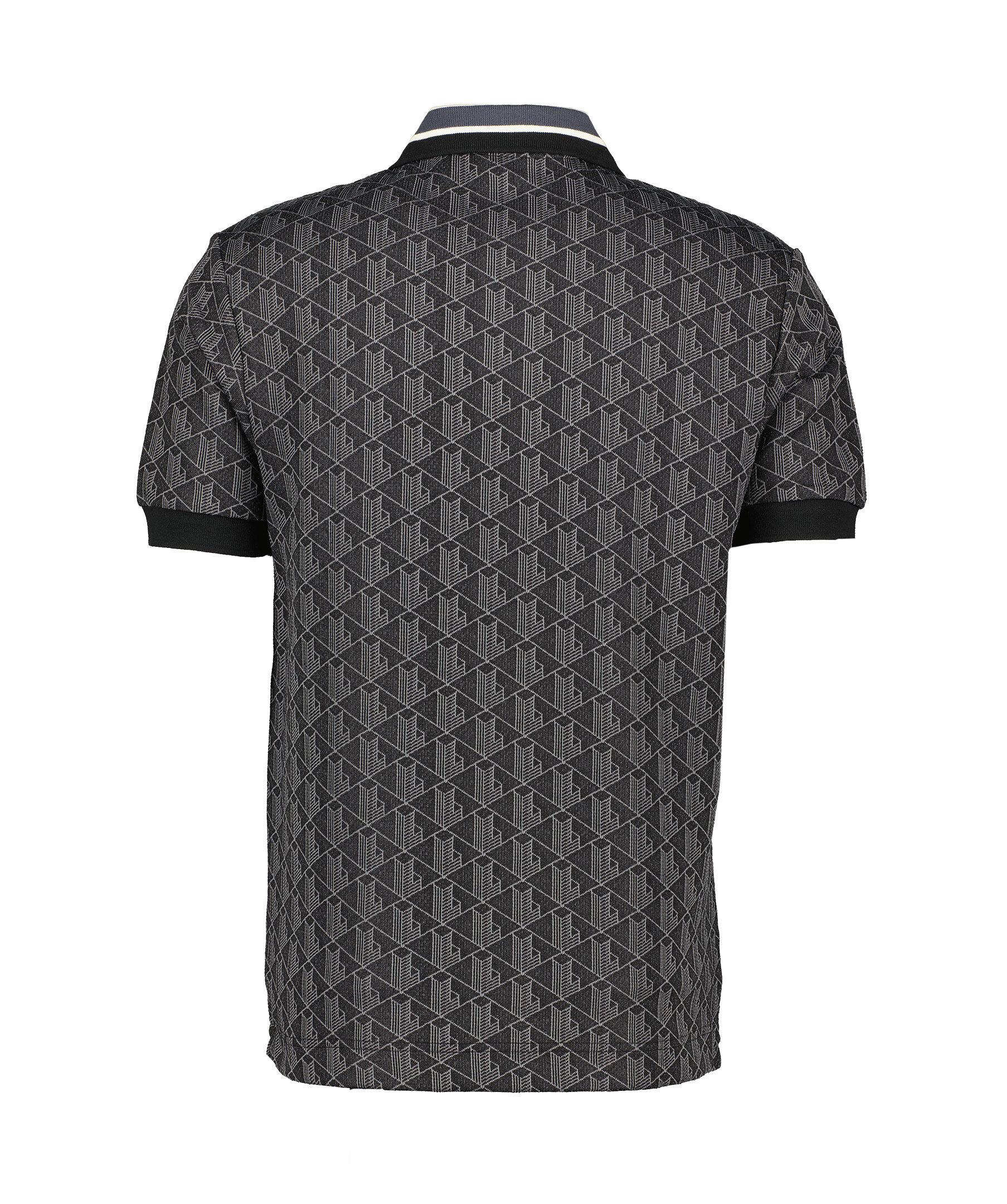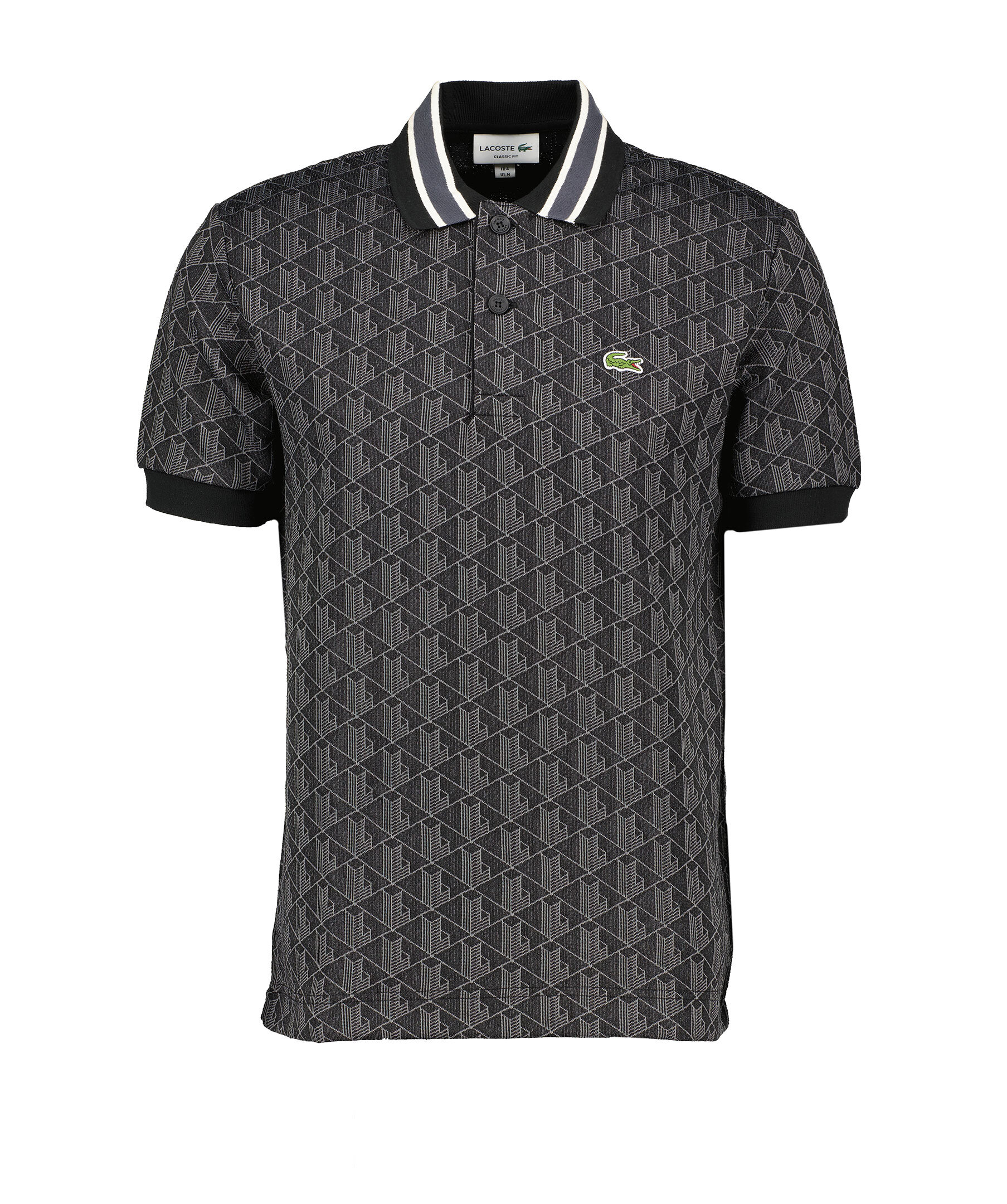 Svart mönstrad piké från Lacoste. Ribbstickad krage med flerfärgade ränder och muddar vid ärmslut. Två knappar. Broderad patch med logotyp på vänster bröst. Korta slitsar i sidorna. Tillverkad i bomullsblandning.