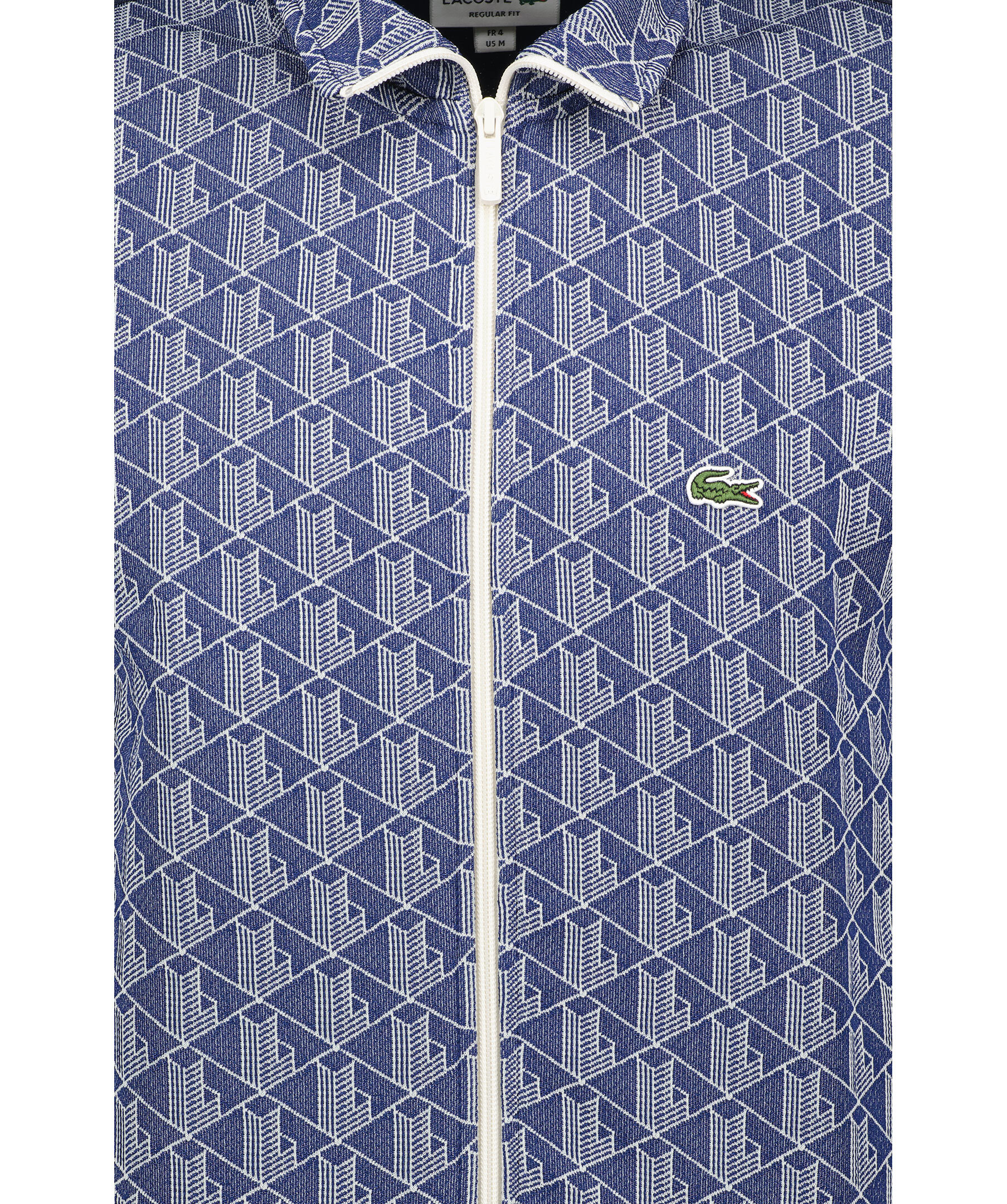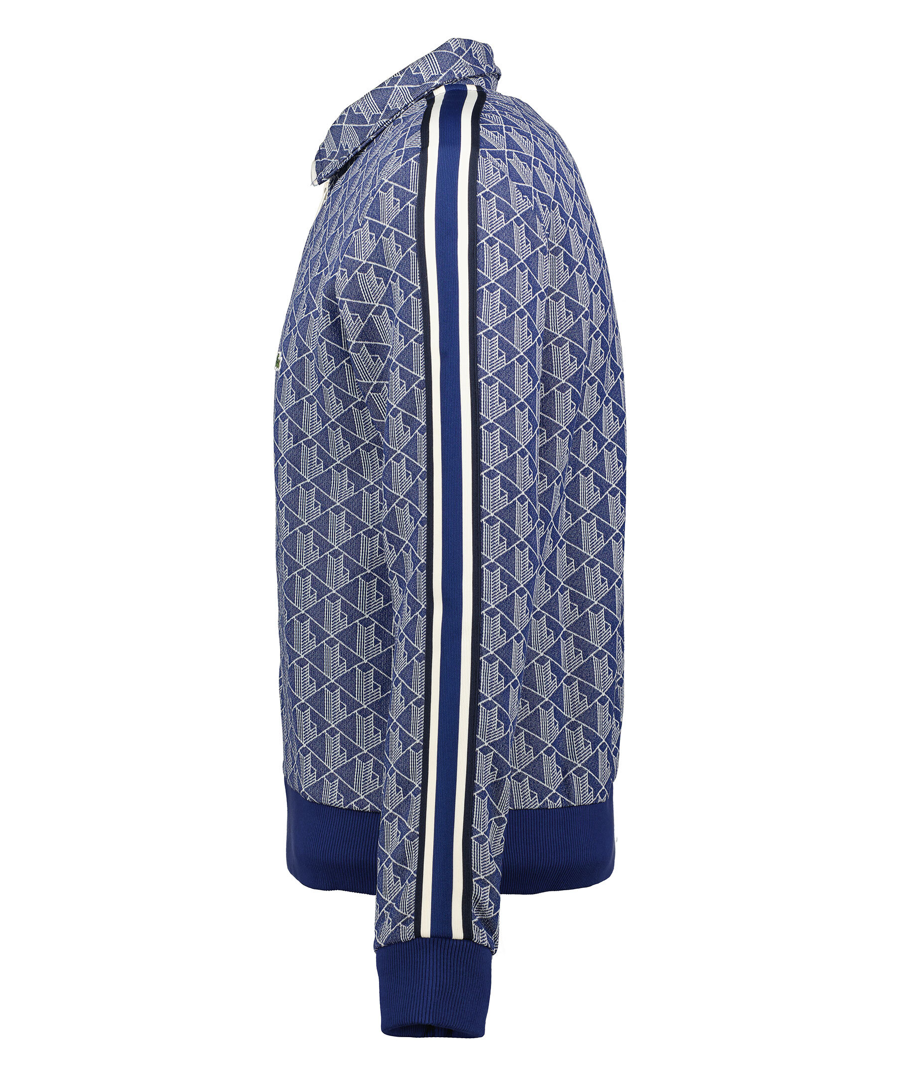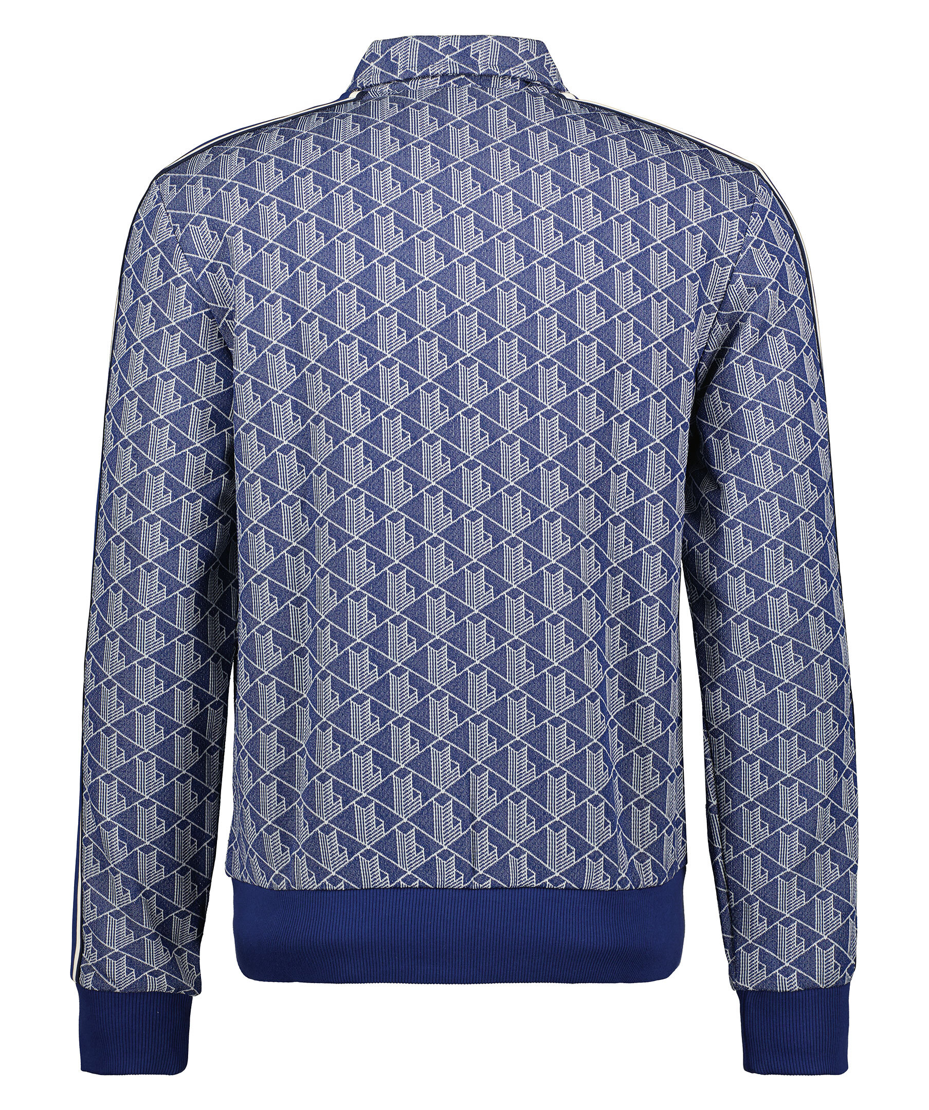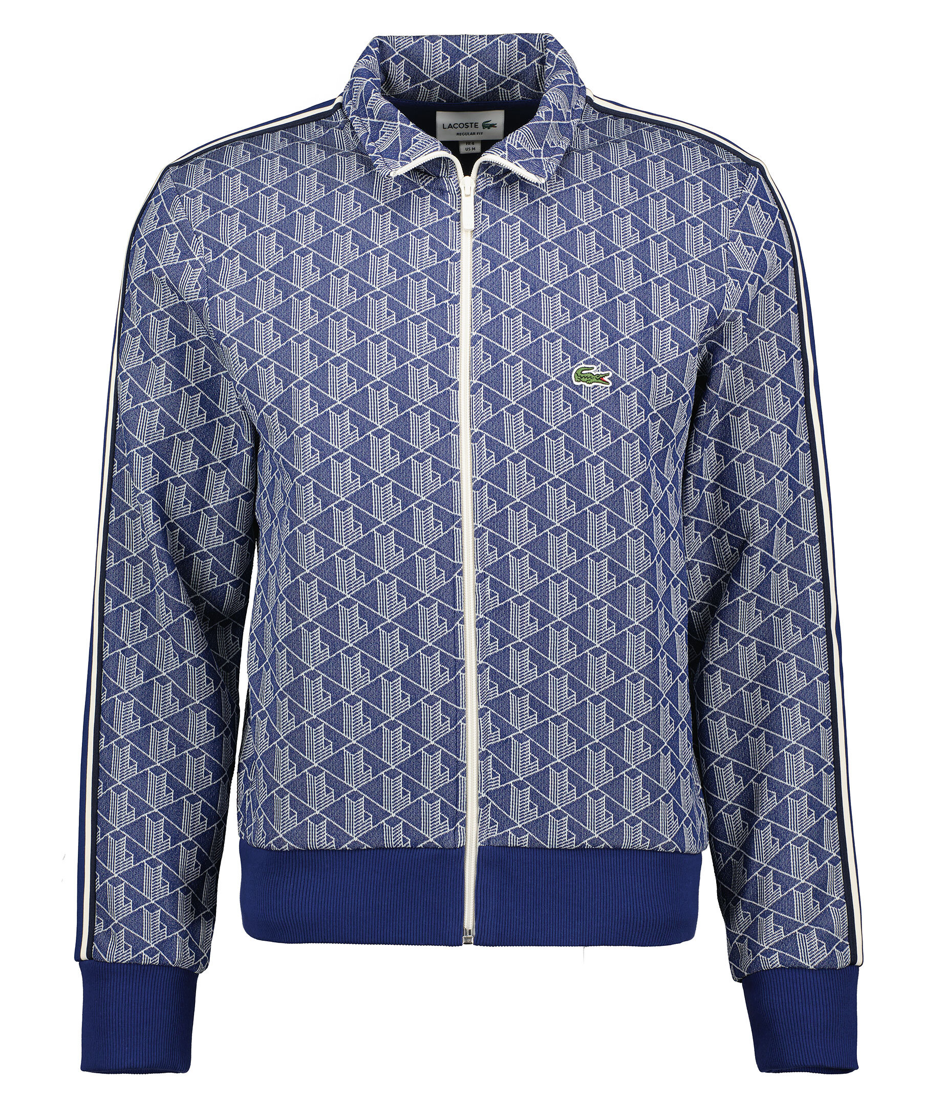 Blå och vit mönstrad tracksuit jacka från Lacoste. Broderad patch med logotyp på vänster bröst. Revärer i vitt och blått på ärmarna. Ribbstickade muddar i blått vid ärm- och plaggslut. Två fickor framtill. Tillverkad i bomullsblandning.