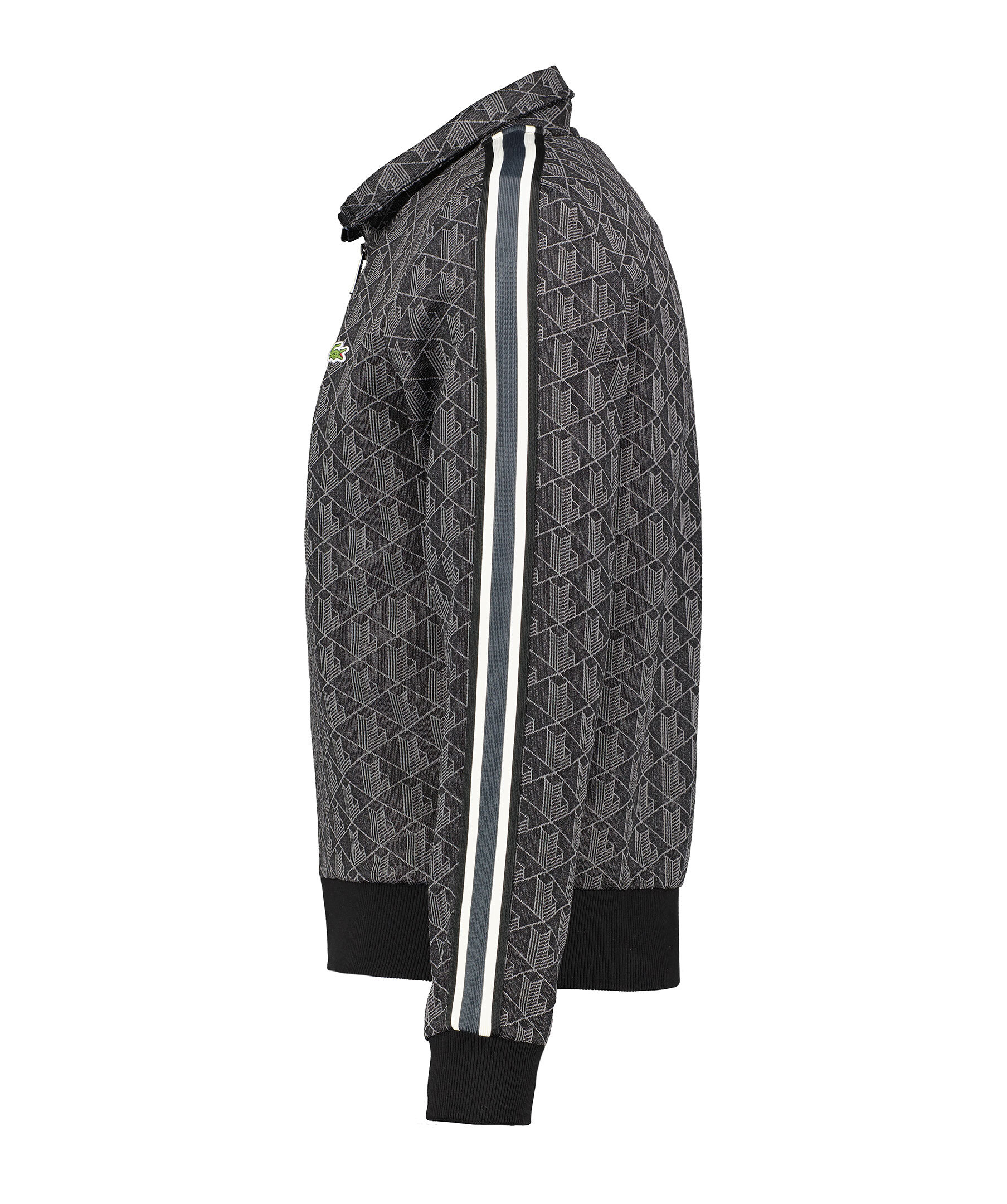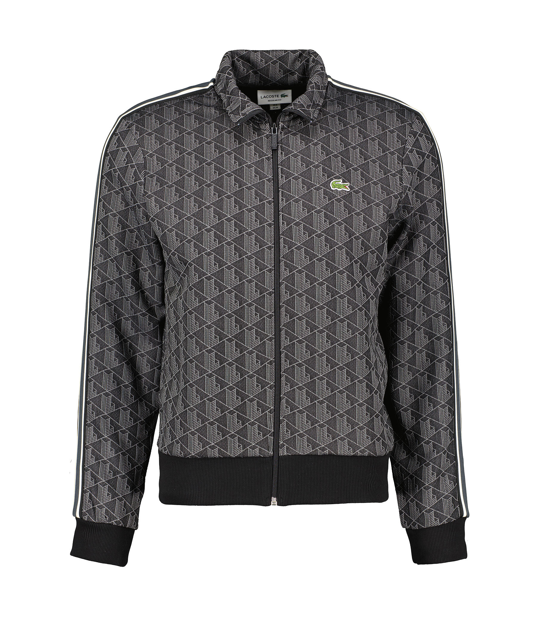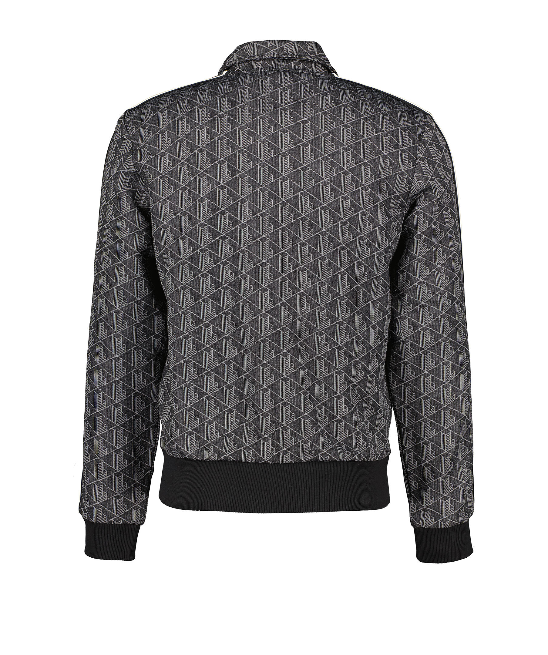 Svart, mönstrad tracksuit jacka från Lacoste. Stängs framtill med dragkedja. Randiga revärer på ärmarna. Broderad patch med logotyp på vänster bröst. Ribbstickade muddar vid ärm- och plaggslut. Två fickor framtill. Tillverkad i en bomullsblandning.