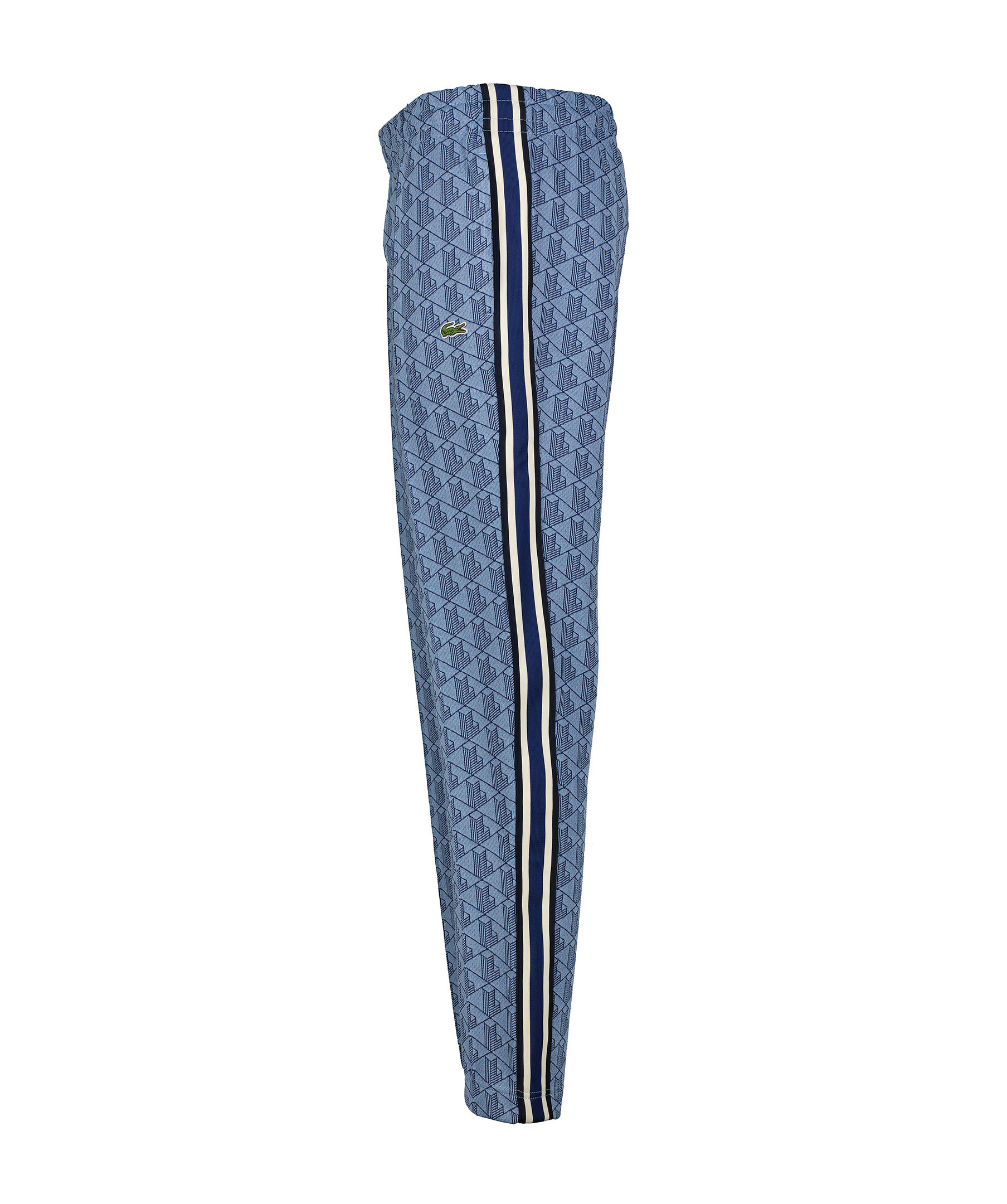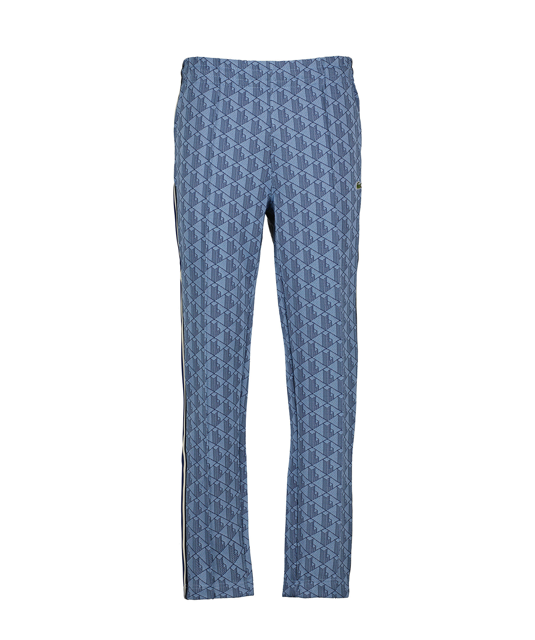 Blå mönstrade tracksuit byxor från Lacoste. Revärer längst byxbenen. Dragsko i midjan. Två fickor framtill, en ficka baktill. Broderad patch med logotyp på vänster lår. Tillverkad i en polyester och bomullsblandning.