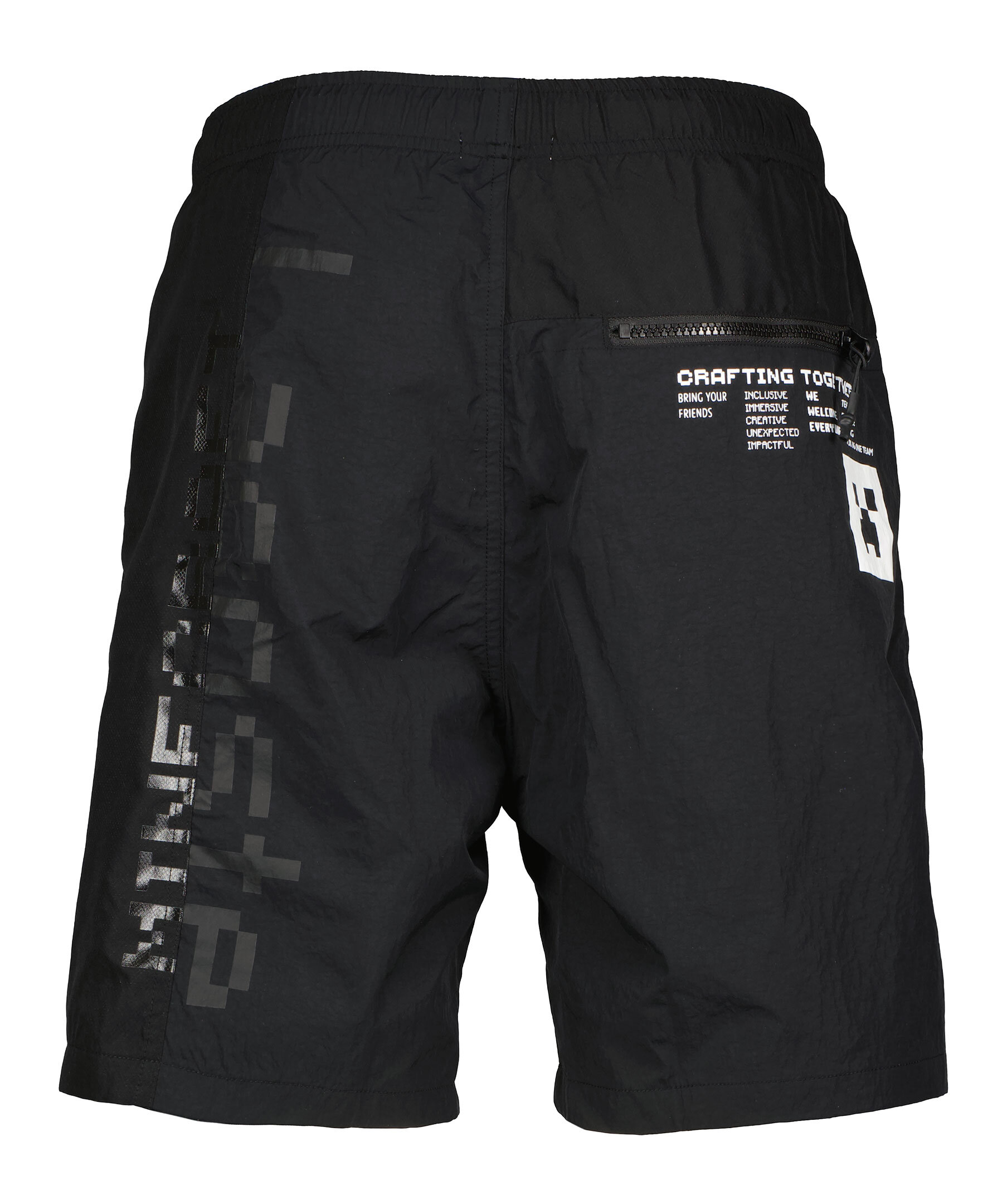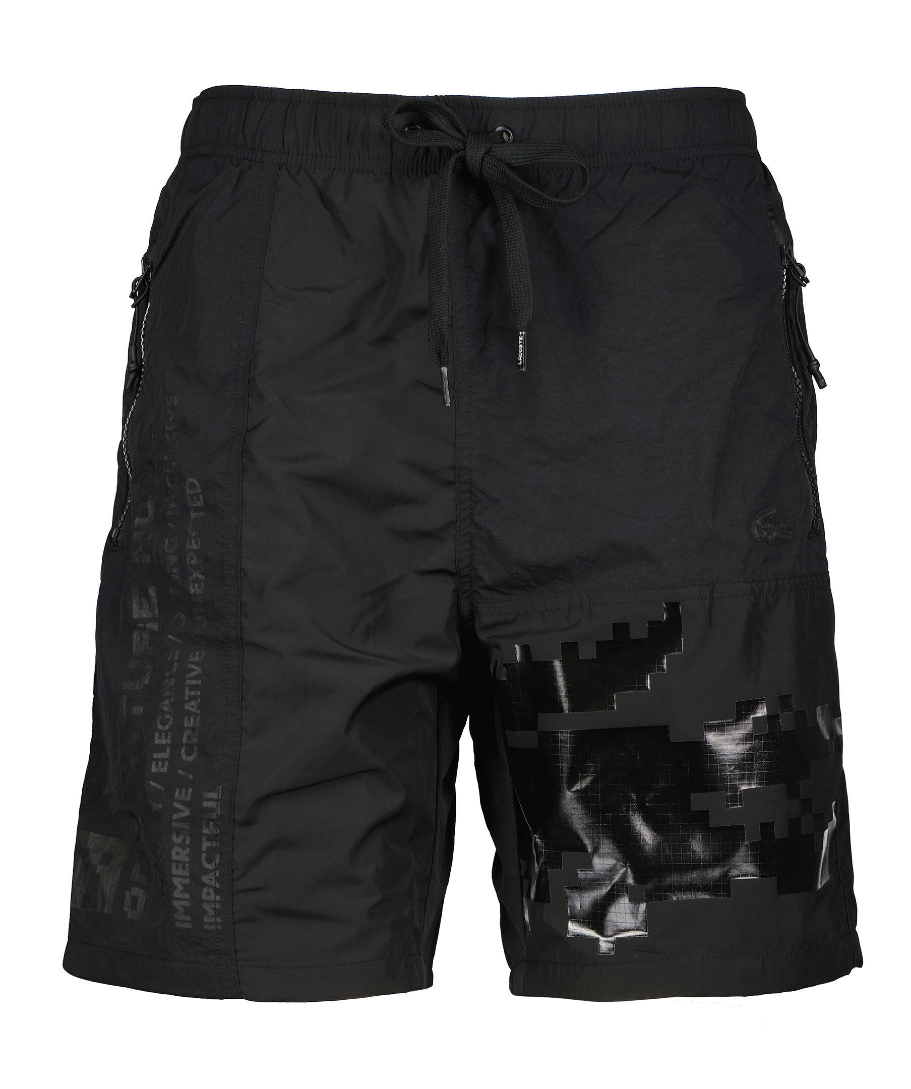 Svarta shorts från Lacoste. Resår och dragsko midjan. Två fickor framtill som stängs med dragkedja, och en baktill på höger sida som stängs med dragkedja. Liten gummerad logotyp på vänster lår. Tryckta detaljer i svart över shortsen.