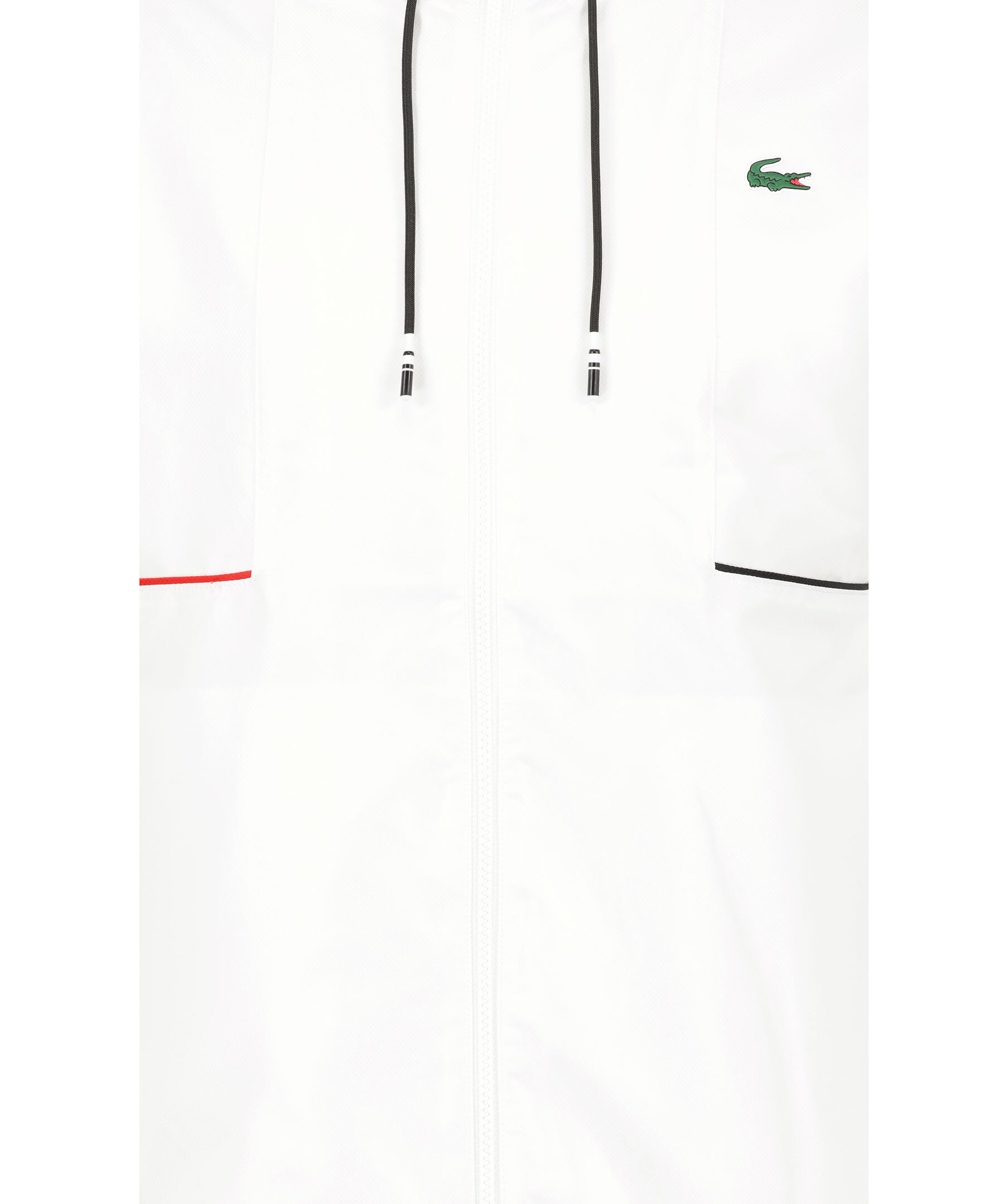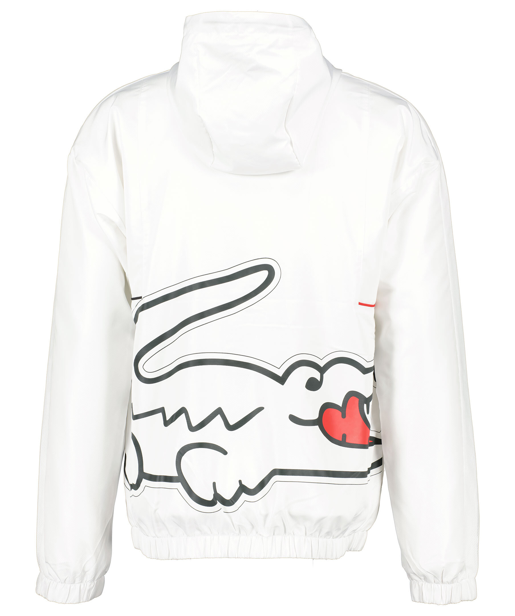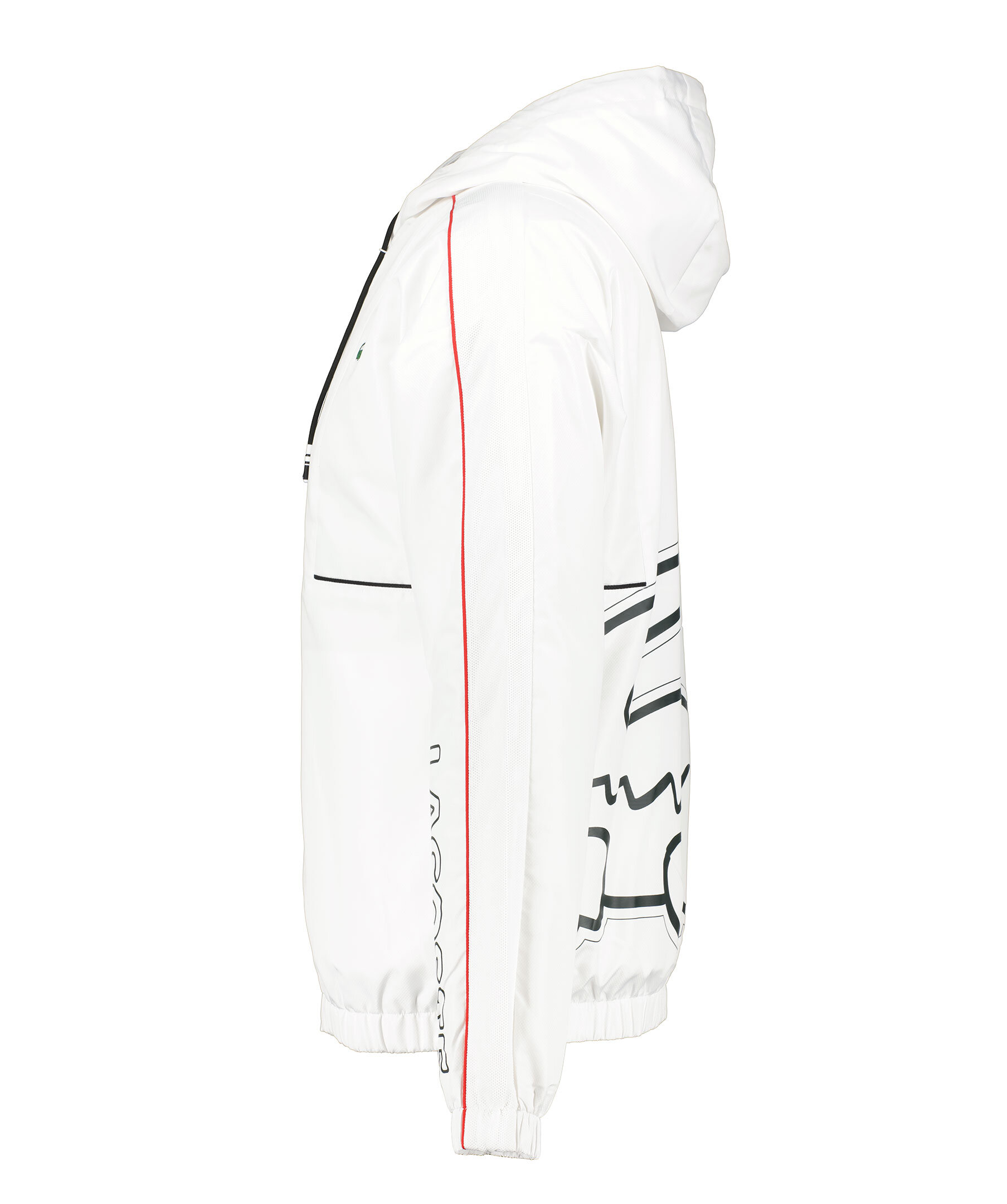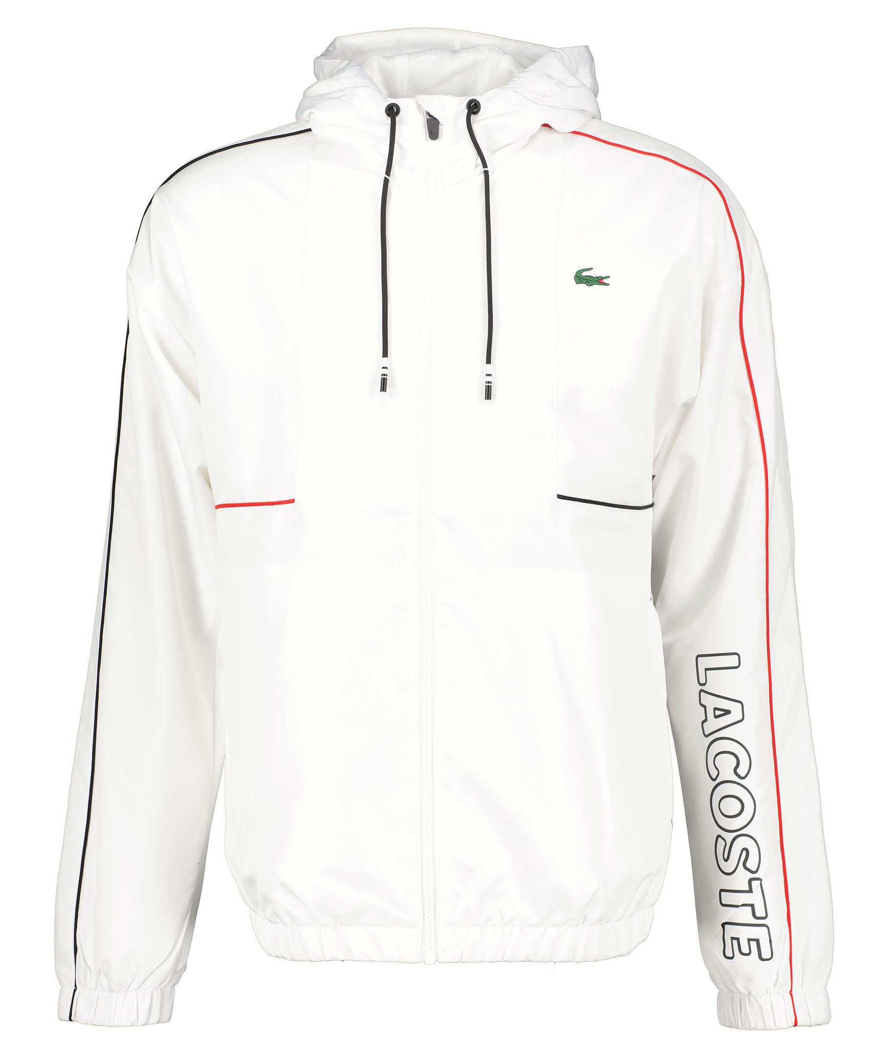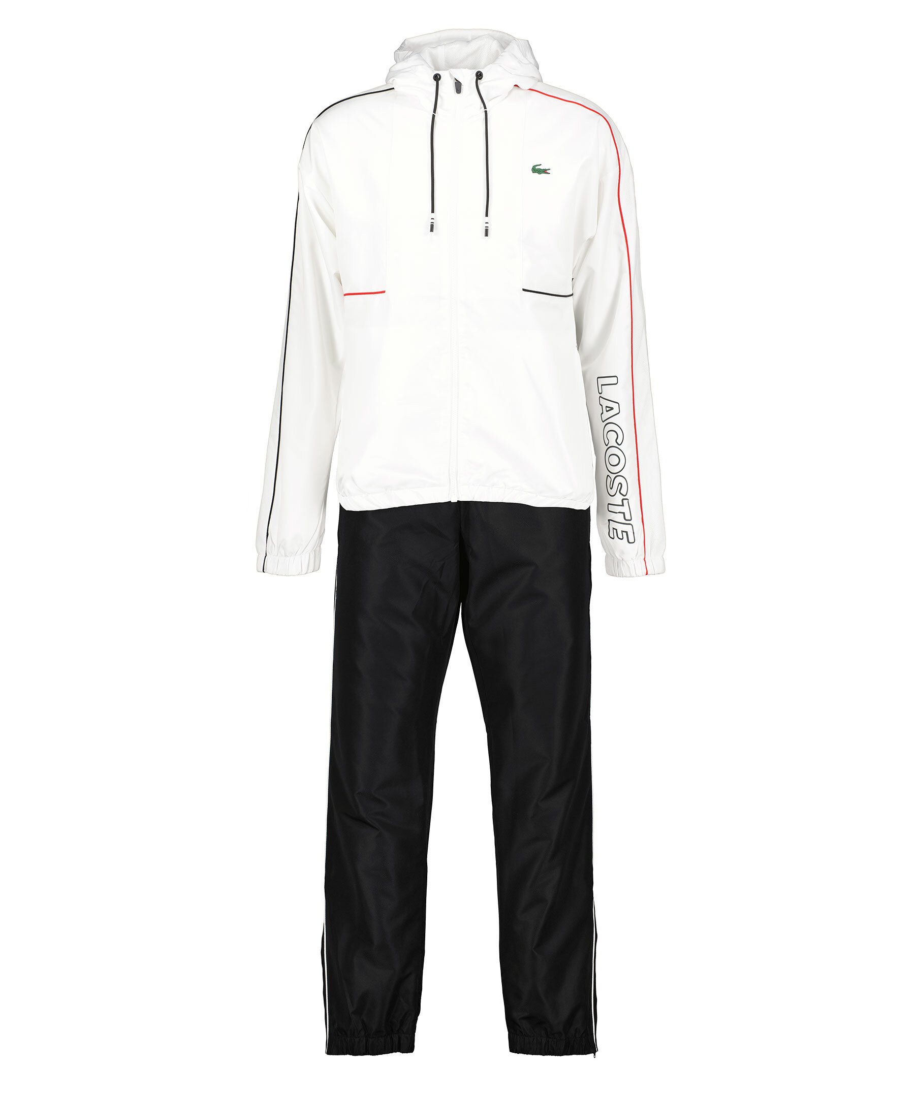 Vit och svart tracksuit från Lacoste. Vit tracksuit jacka från Lacoste. Stängs framtill med dragkedja. Dragsko i kragen. Gummerad logotyp på vänster bröst. Två fickor framtill som stängs med dragkedja. Resår i ärm- och plaggslut. Stort tryck i svart och rött över ryggen, baksidan av vänster ärm. Svarta och röda detaljer. Foder i mesh-material