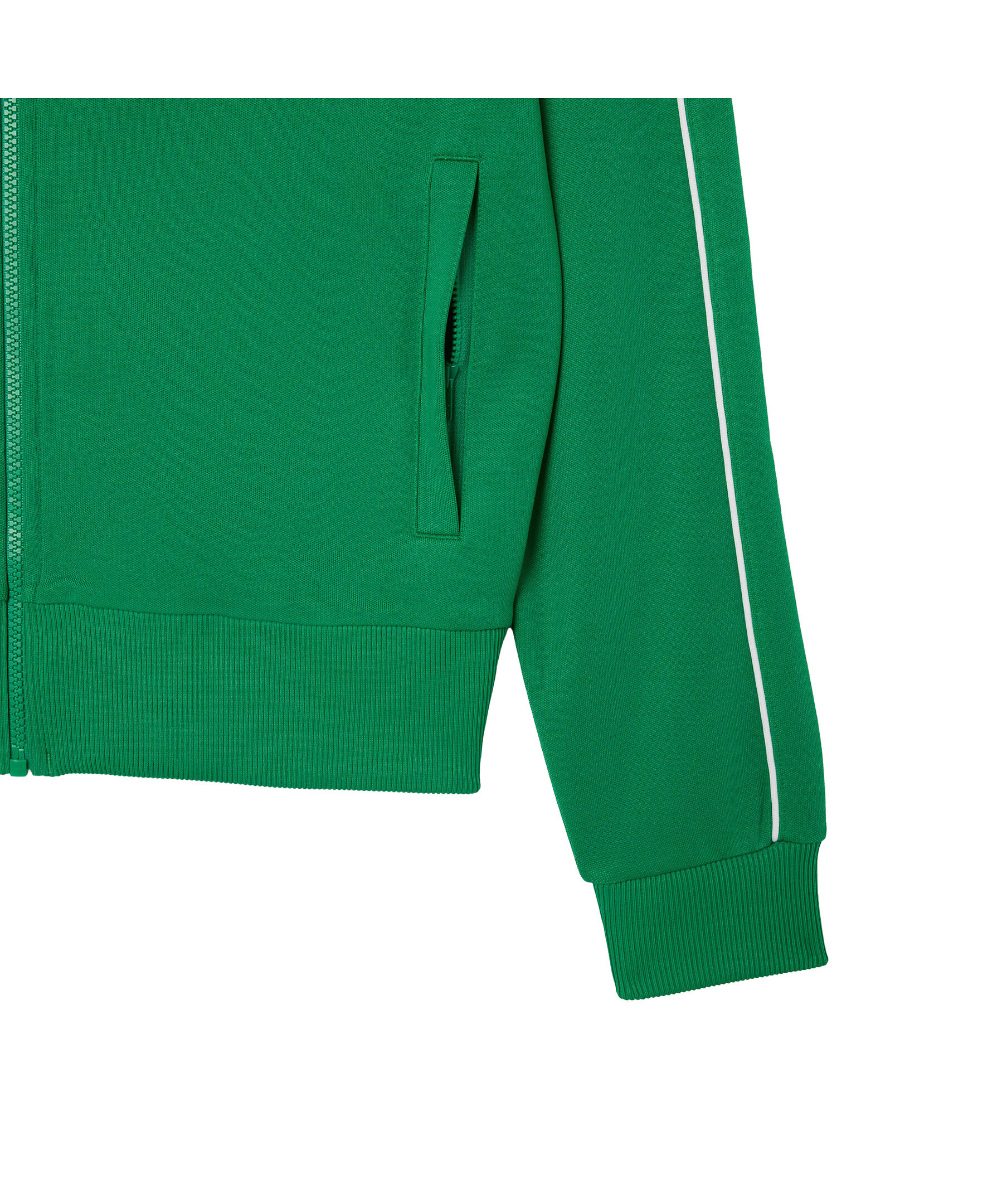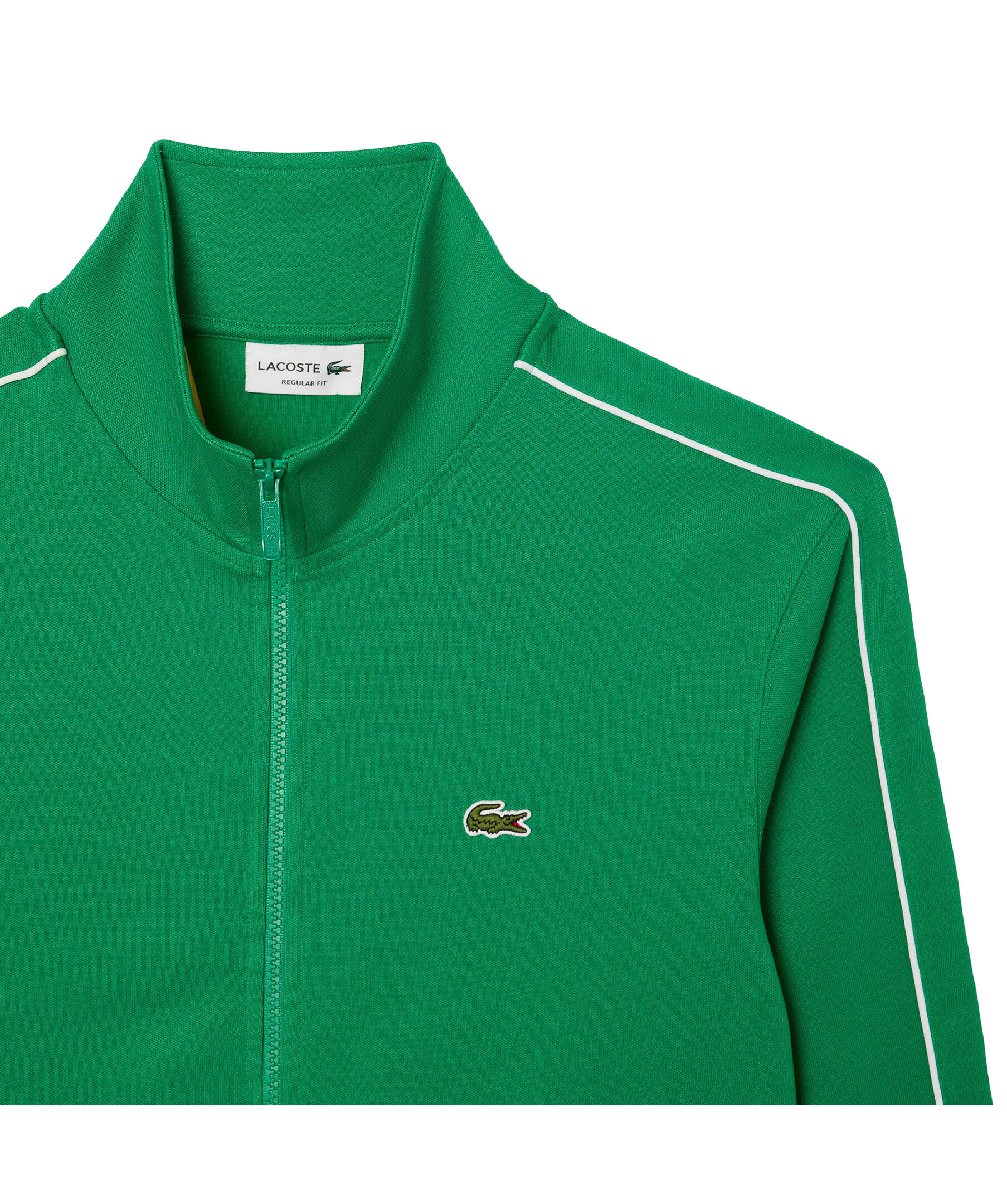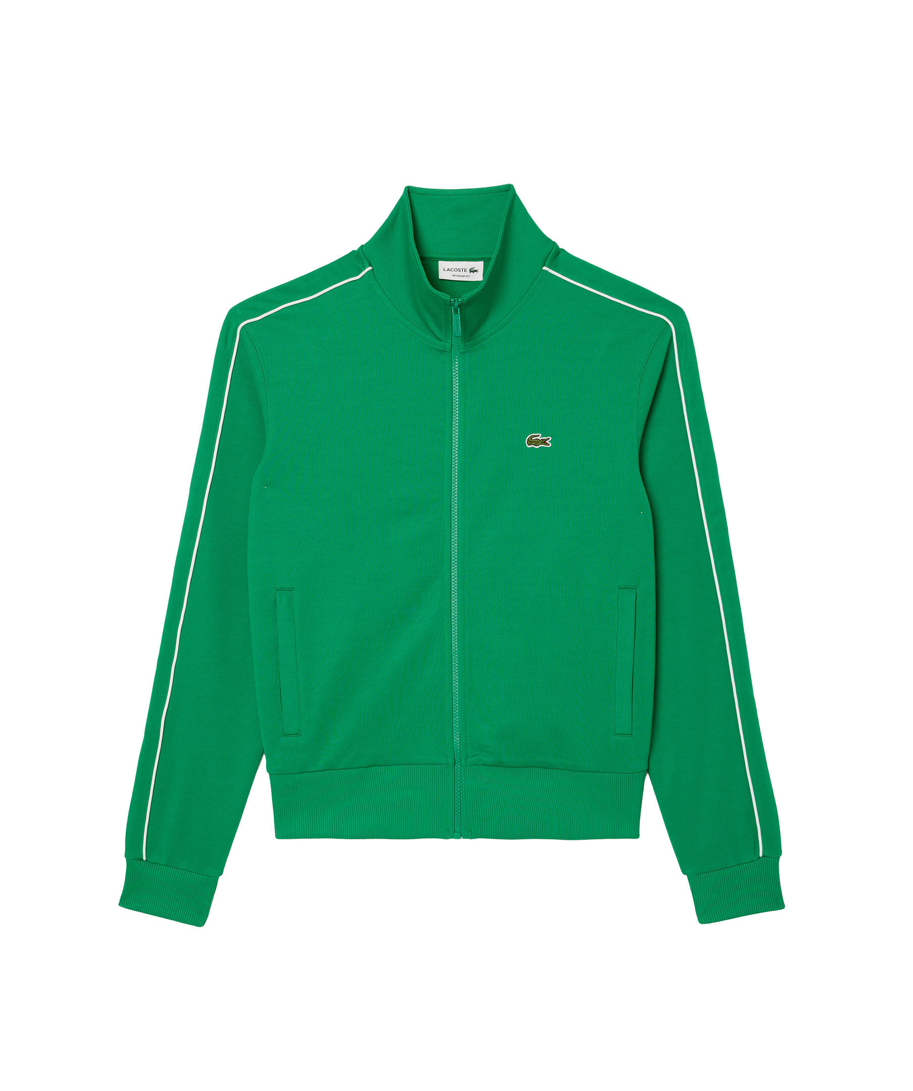 Grön tracksuit jacka från Lacoste. Stängs framtill med dragkedja. Revärer med vita detaljer längst ärmarna. Ribbstickade muddar vid ärm- och plaggslut. Broderad patch med logotyp på vänster bröst. Tillverkad i en polyesterblandning.