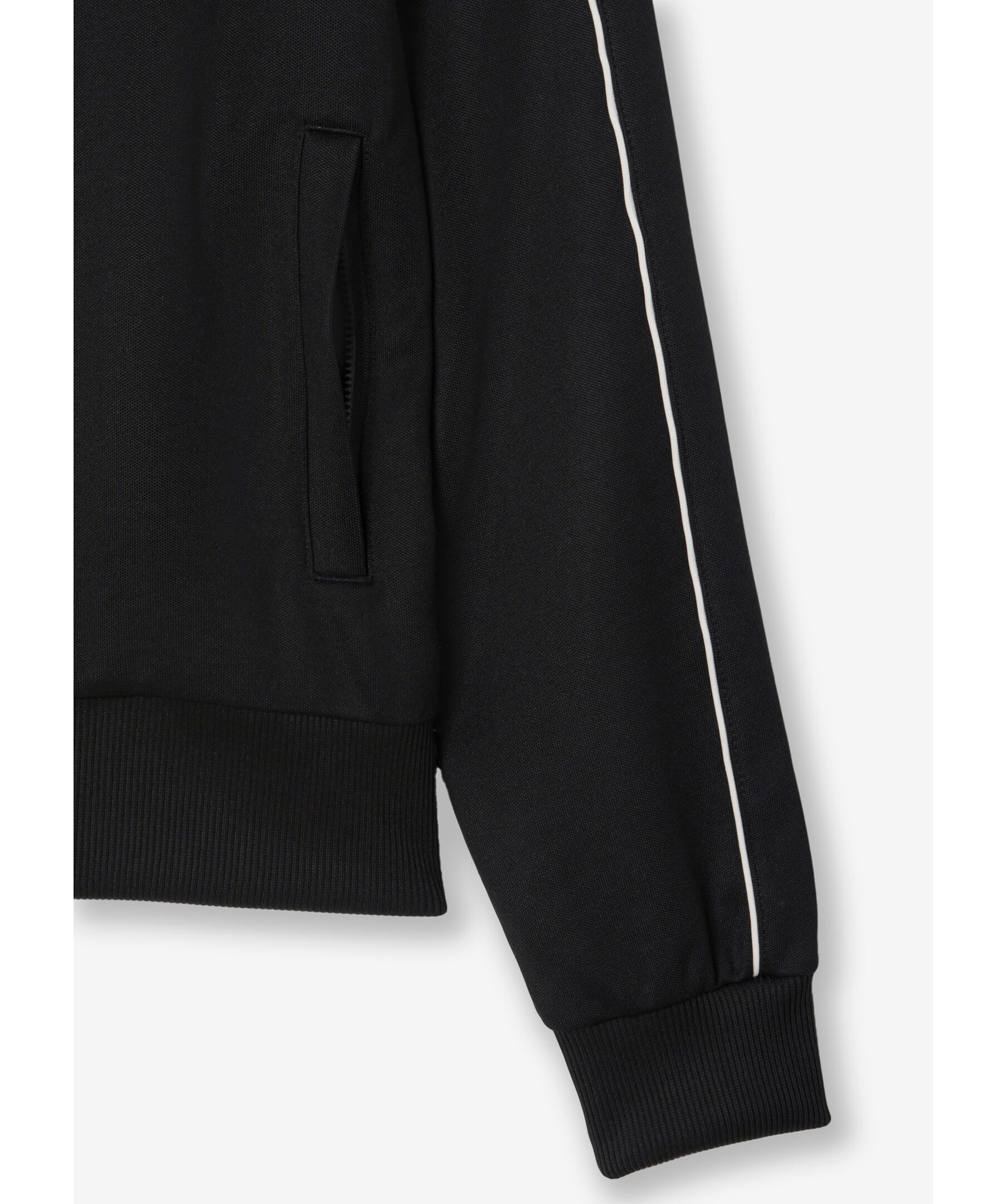 Svart tracksuit jacka från Lacoste. Stängs framtill med dragkedja. Revärer med vita detaljer längst ärmarna. Ribbstickade muddar vid ärm- och plaggslut. Broderad patch med logotyp på vänster bröst. Tillverkad i en polyester- och bomullsblandning.