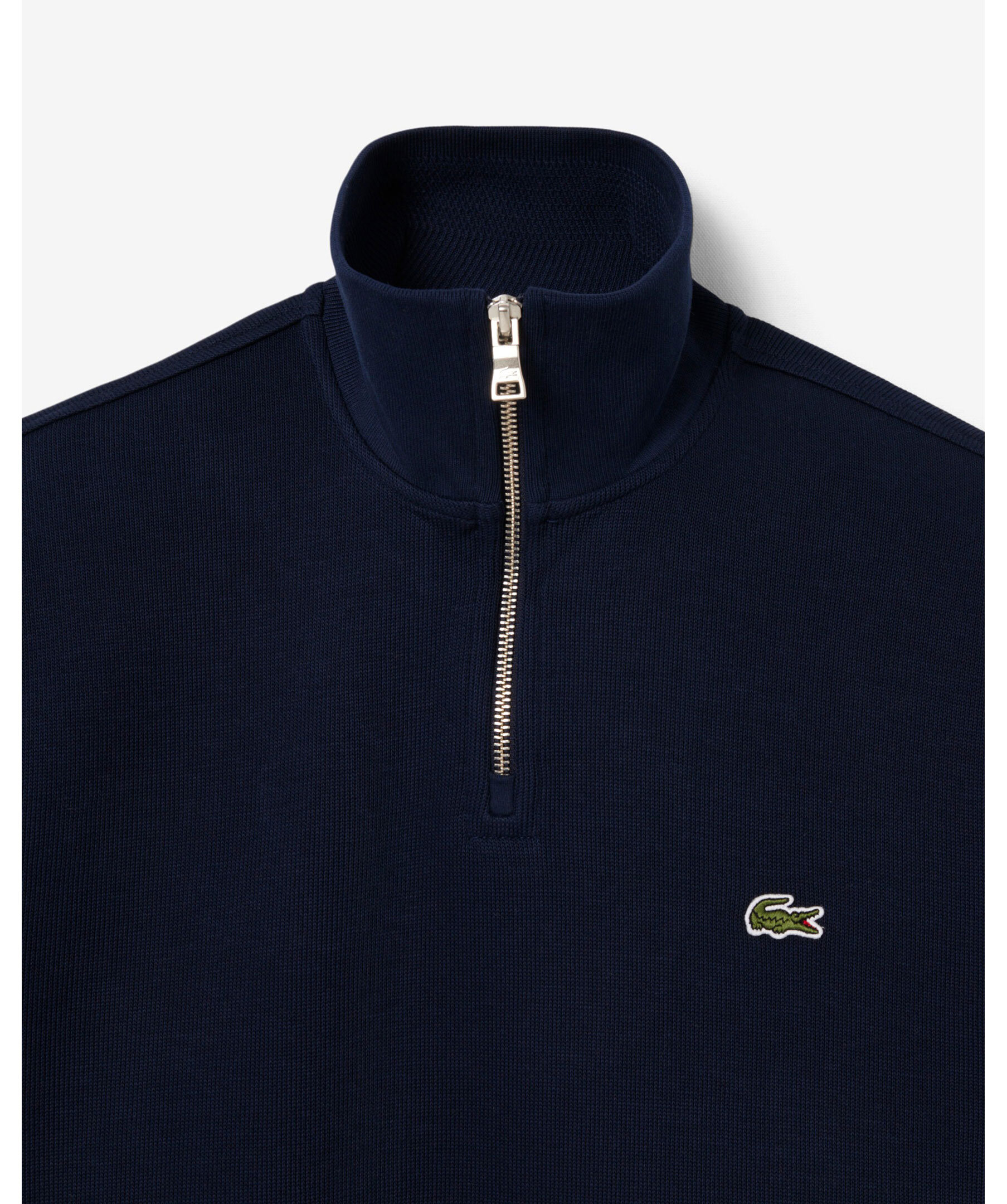 Finstickad marinblå tröja med dragkedjeförsedd ståkrage från Lacoste. Tillverkad i 100% bomull. Broderad krokodil-logotyp på bröstet. Ribbstickad bomullsinterlock. Ribbstickad polokrage med dragkedja. Ribbstickad ton i ton längst ner på plagget och ärmslut. Klassisk passform.