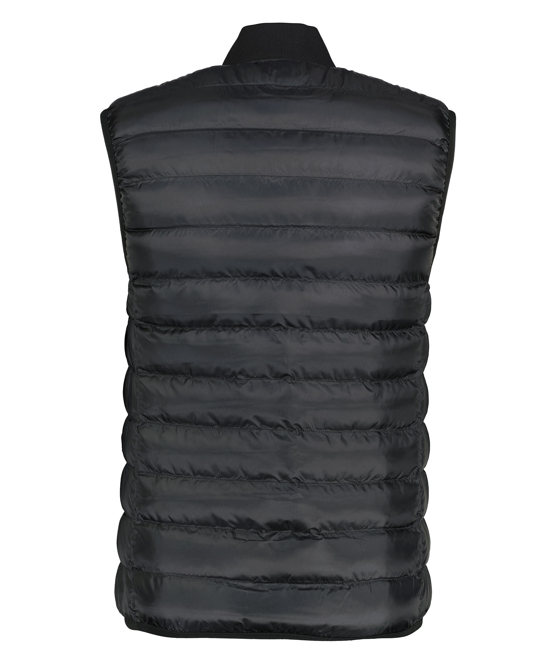 Svart väst med polyester fyllning från Lacoste. Tillverkad i ett vattenavvisande tyg och har en tonstickad krage i ribbat jerseytyg. Dragkedja fram, två framfickor med dold dragkedja och en broderad logotyp på vänster bröst. Smal elastisk mudd i kanterna.