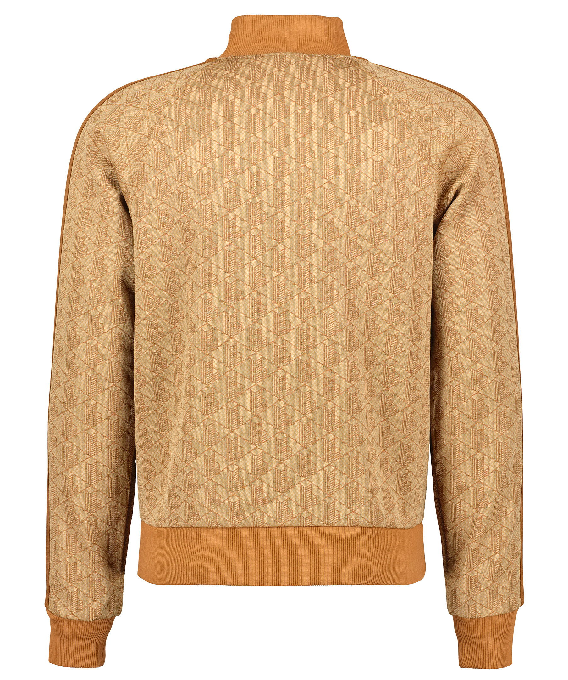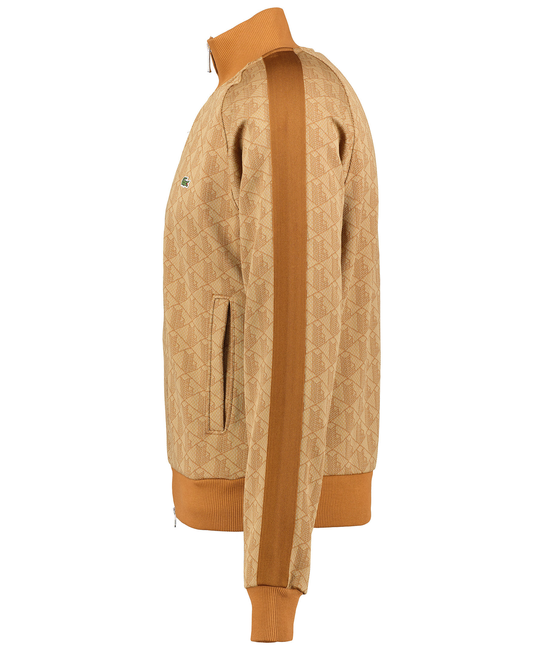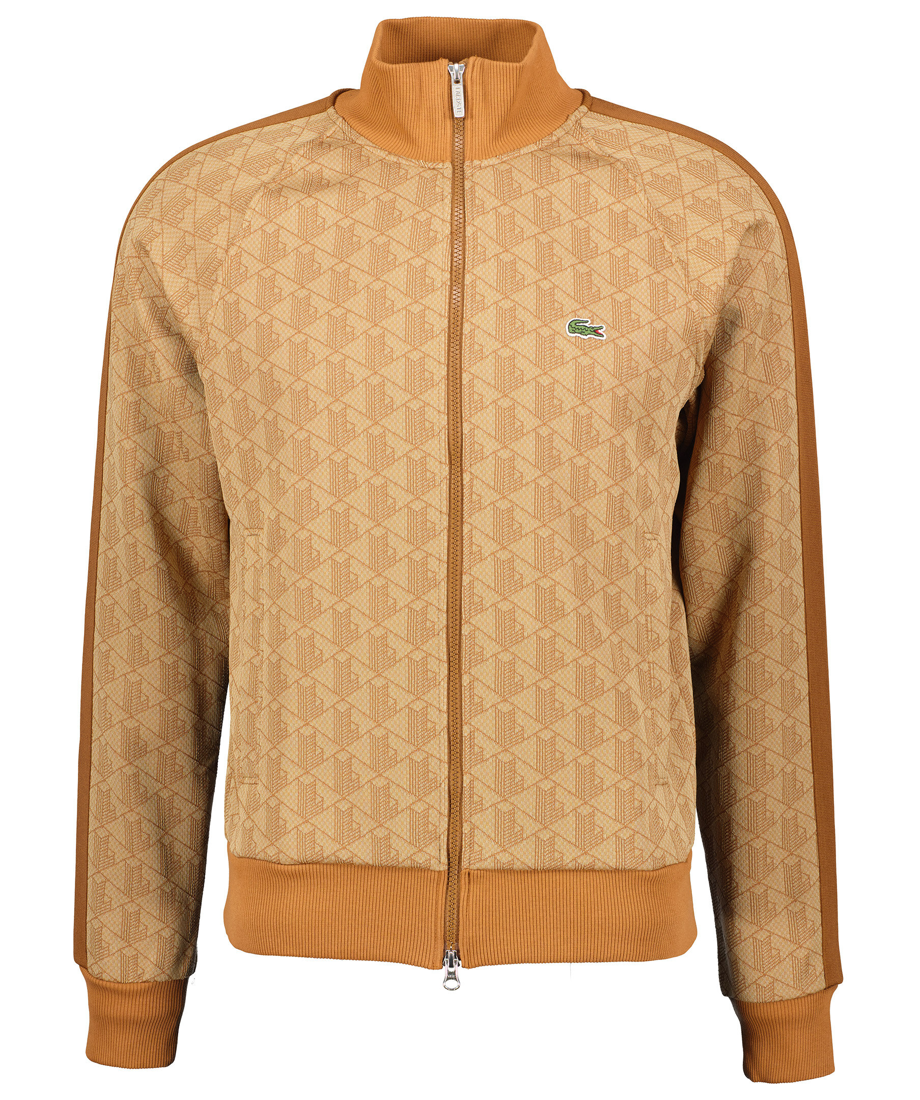 Beige, rostfärgad mönstrad tracksuitjacka från Lacoste. Tröjan stängs framtill med tvåvägsdragkedja. Två fickor framtill. Broderad krokodil på vänster bröst. Ribbstickade muddar vid kragen, ärm- och plaggslut. Rostbruna revärer längst ärmarna.